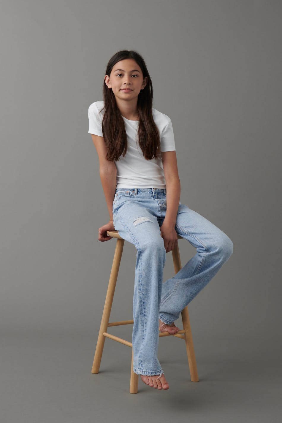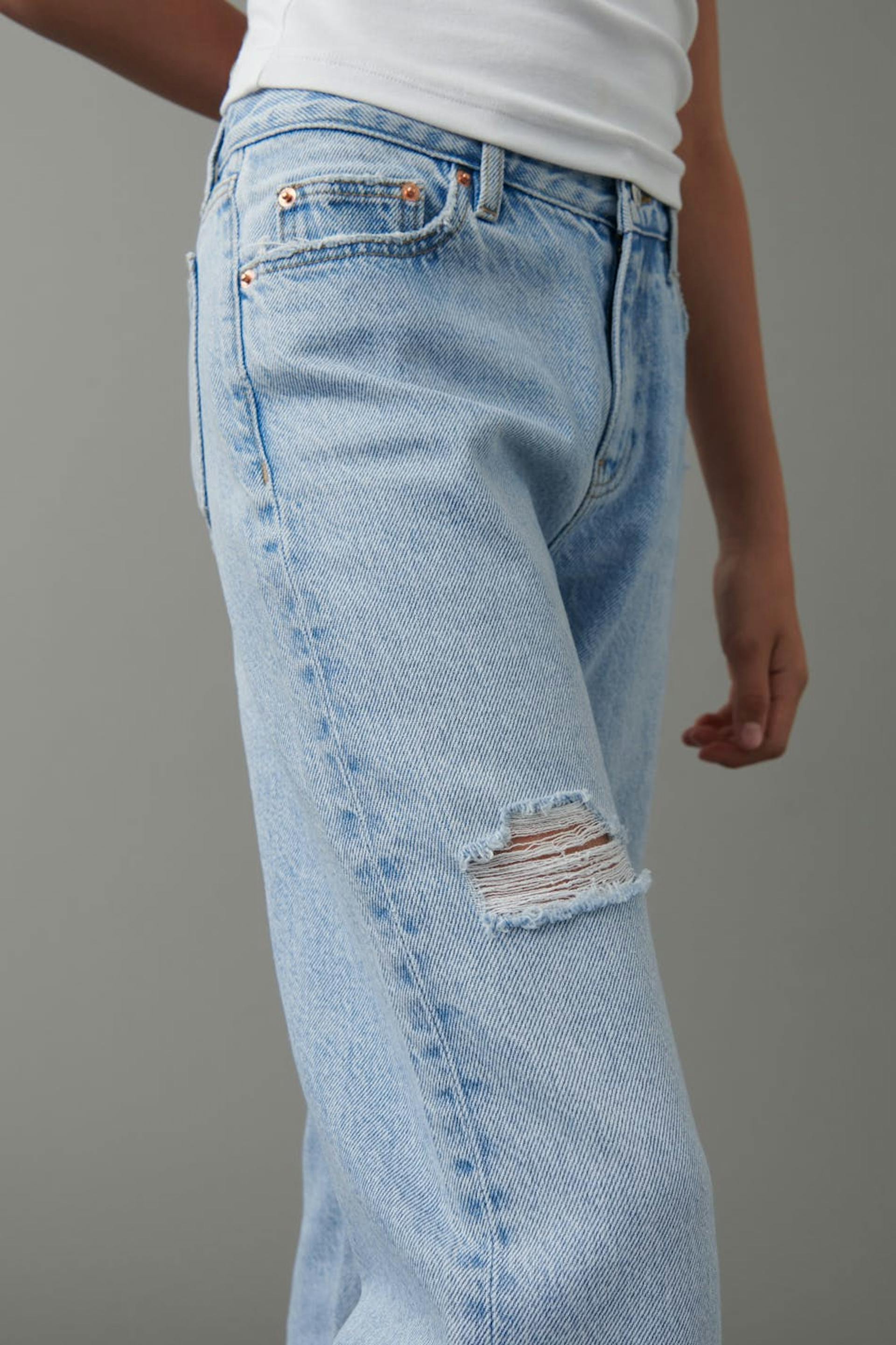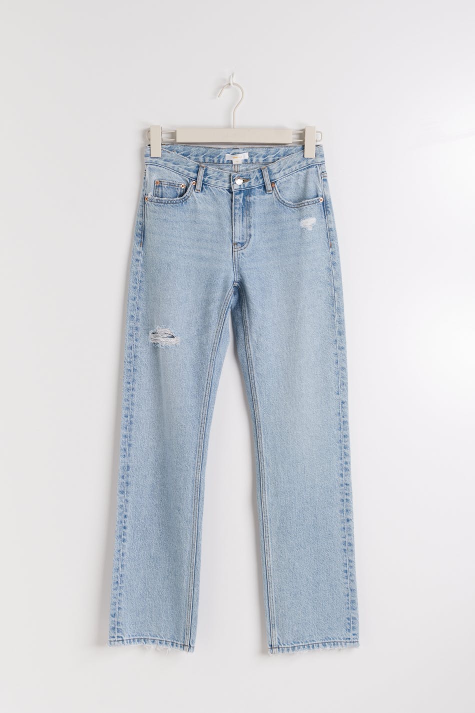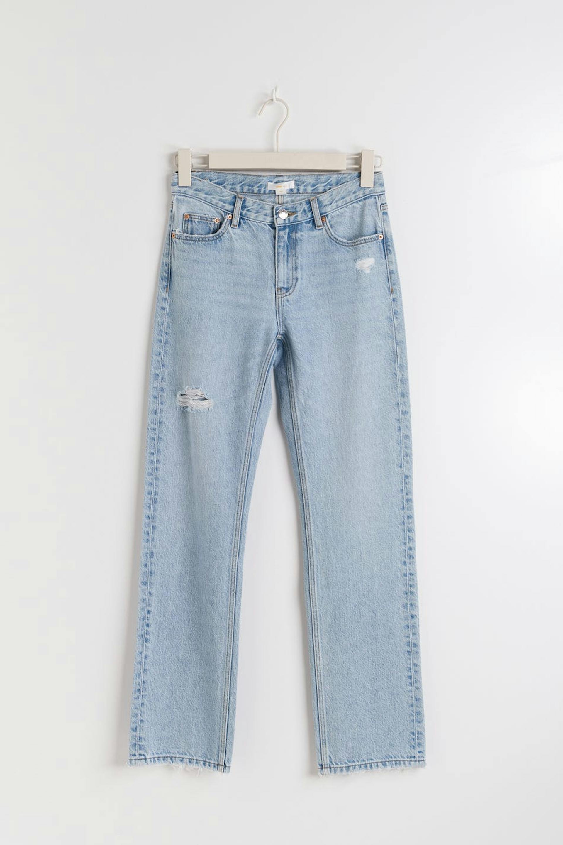 Straight trousers by Gina Tricot Young with an oversize fit. The trousers are blue and have low waist in non-stretch denim. They have straight legs with full length, adjustable elastic at the waist and pockets at the front and back.