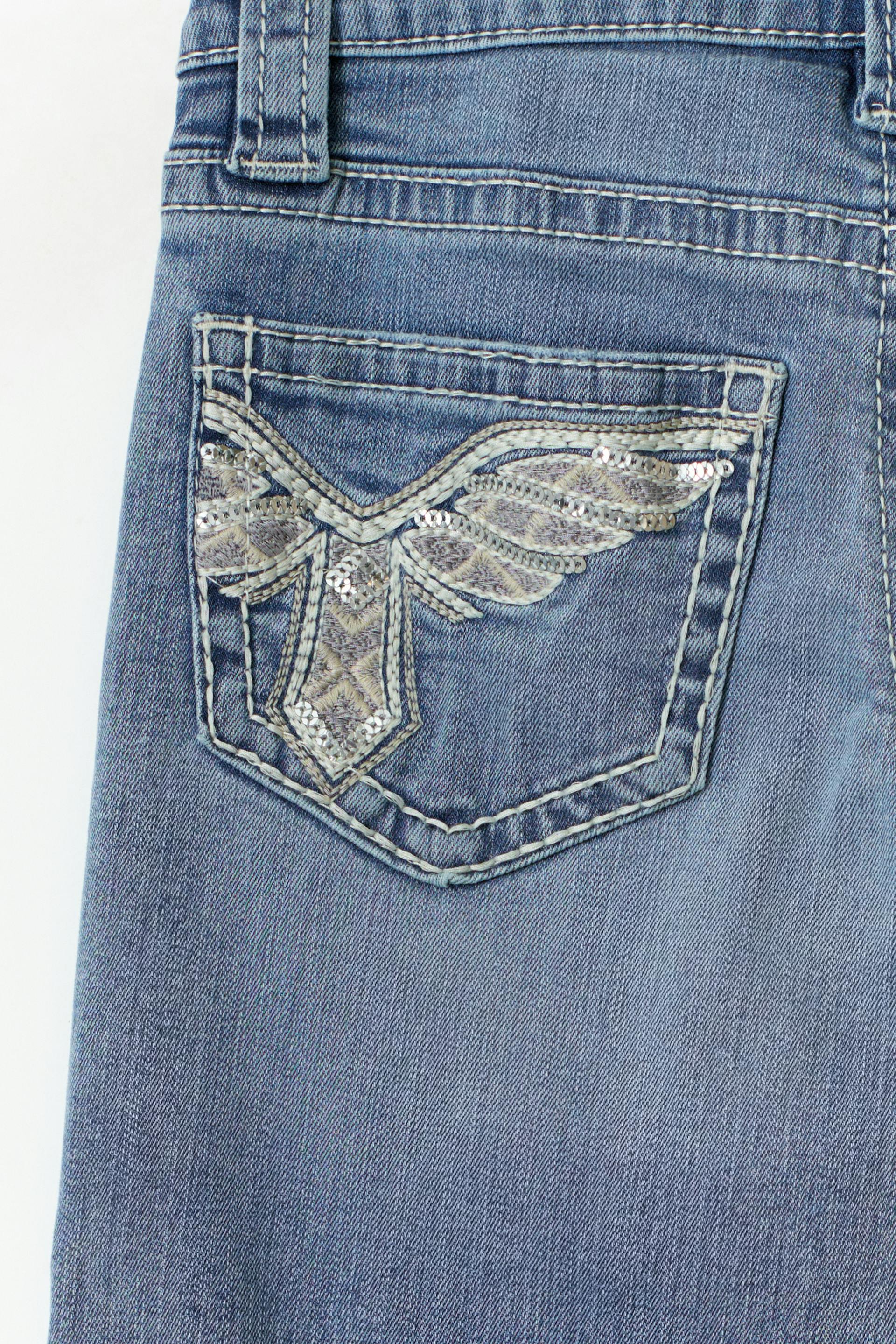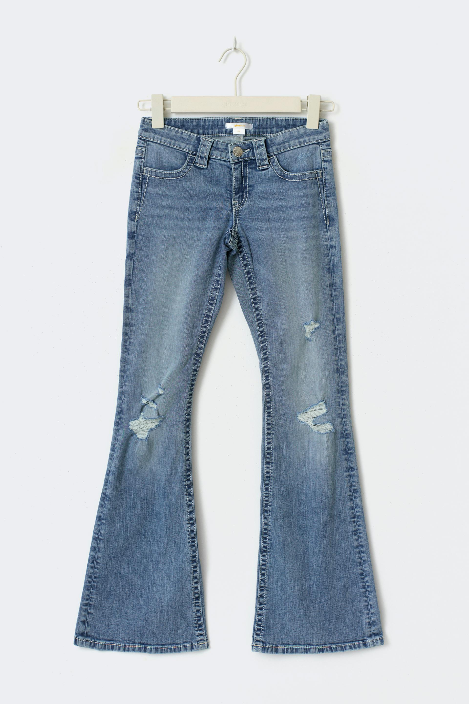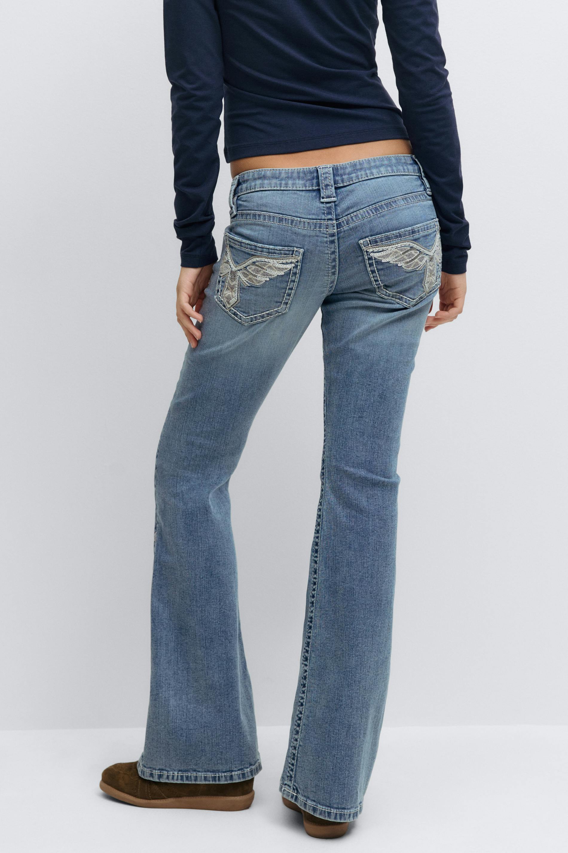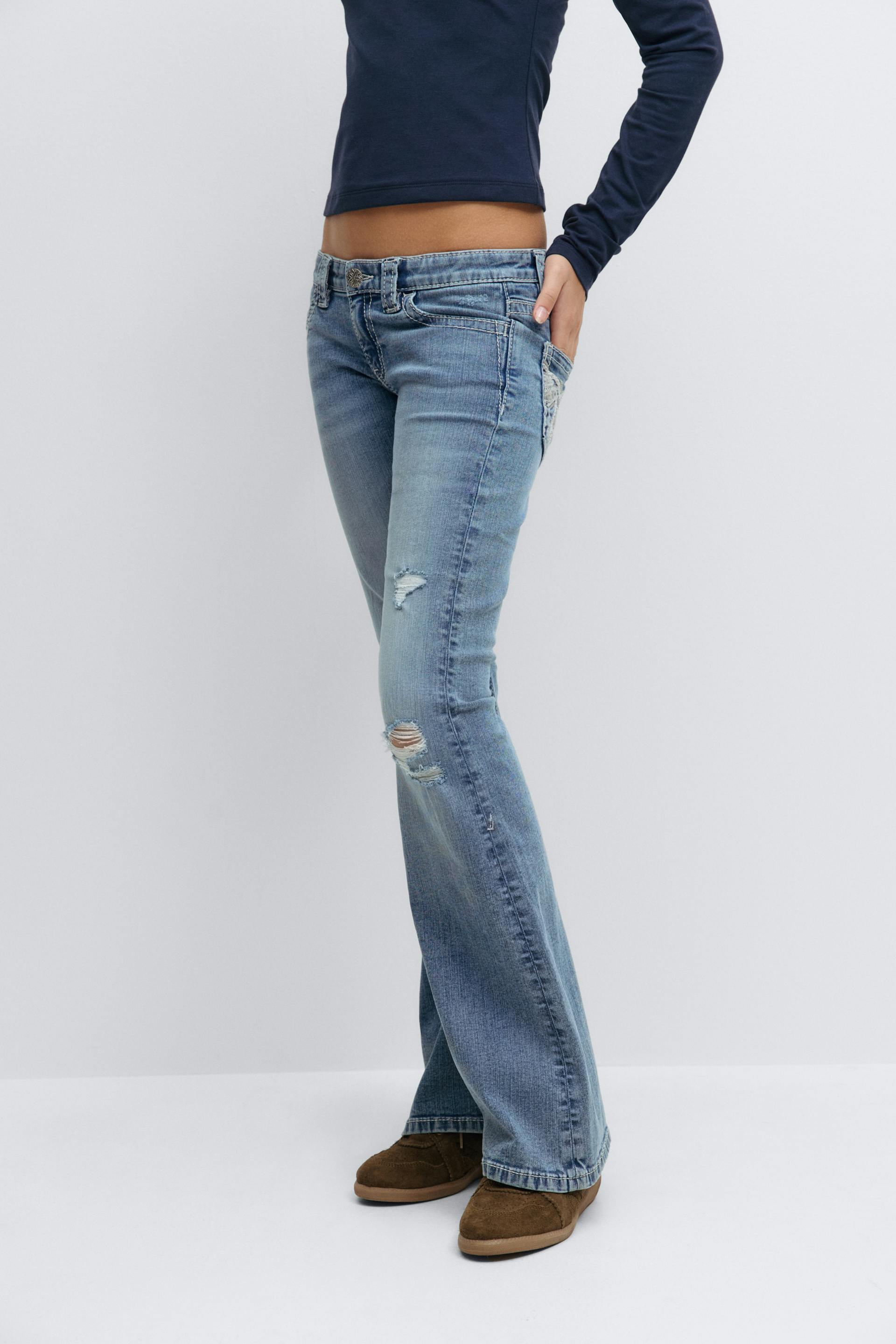 Flare jeans with rips. The jeans are blue and have low waist. They have embroidered back pockets with sequins, flared legs, low stretch, front pockets and zip fly.