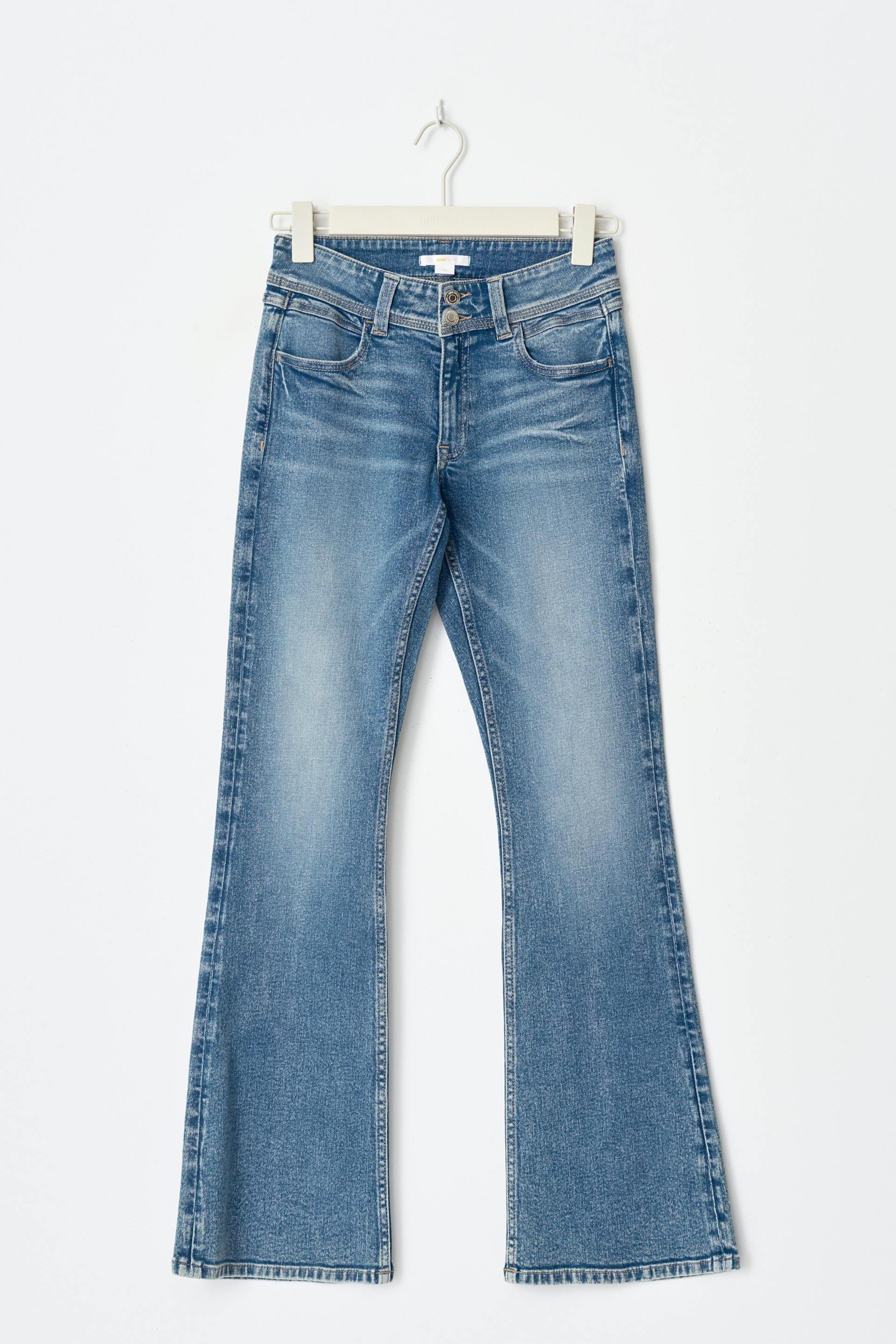Boot cut jeans with mid waist. The jeans are light-blue and have flared legs. They have zip fly and adjustable elastic at the waist.