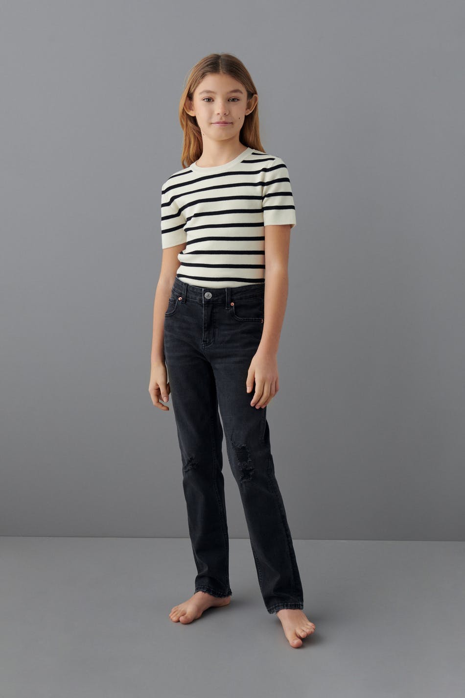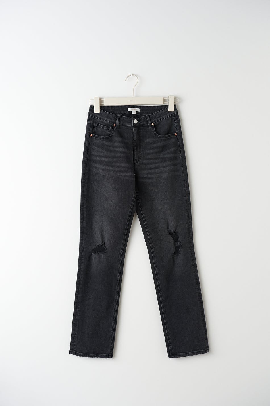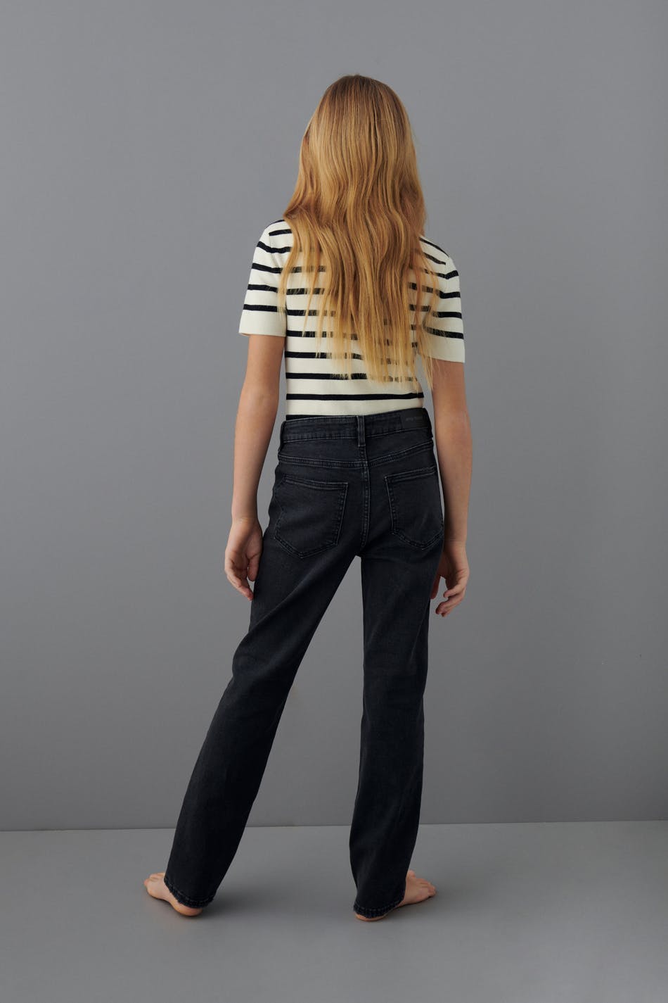 Straight jeans with comfort stretch. The jeans are black-grey and have a slim fit with cropped leg length. They have adjustable elastic at the waist and pockets at the front and back.