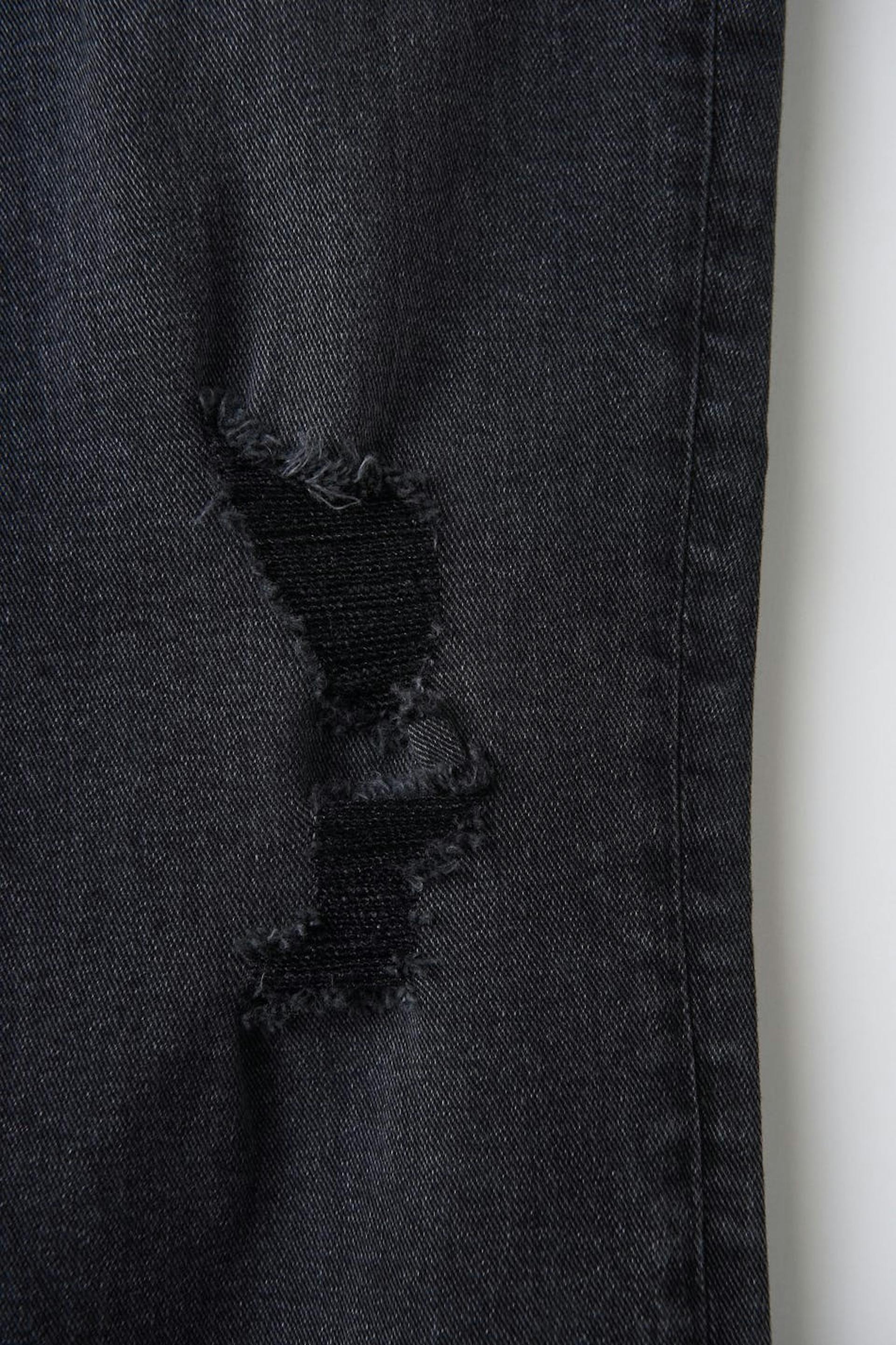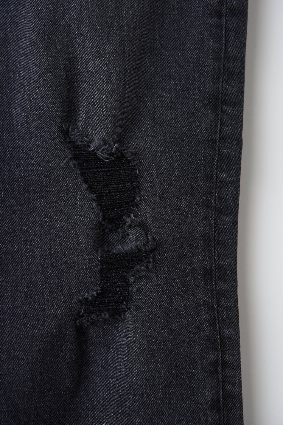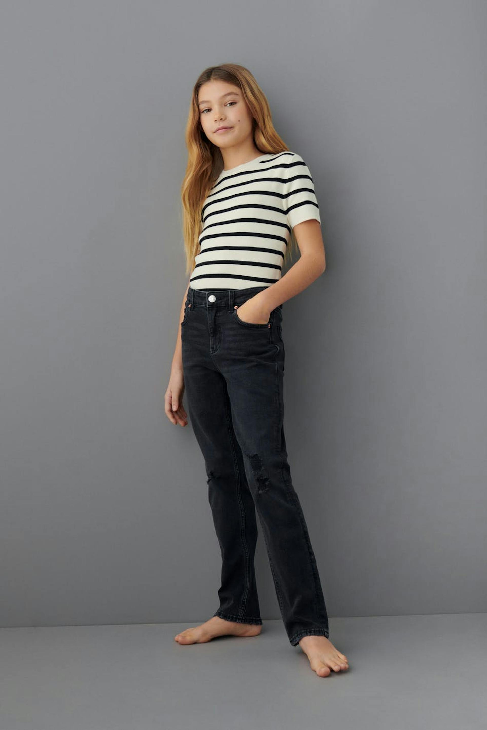 Straight jeans with comfort stretch. The jeans are black-grey and have a slim fit with cropped leg length. They have adjustable elastic at the waist and pockets at the front and back.