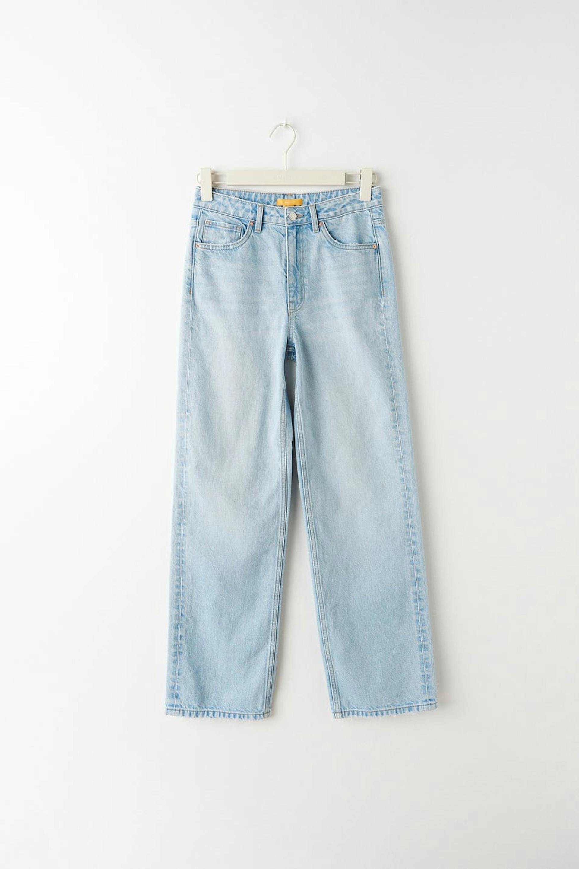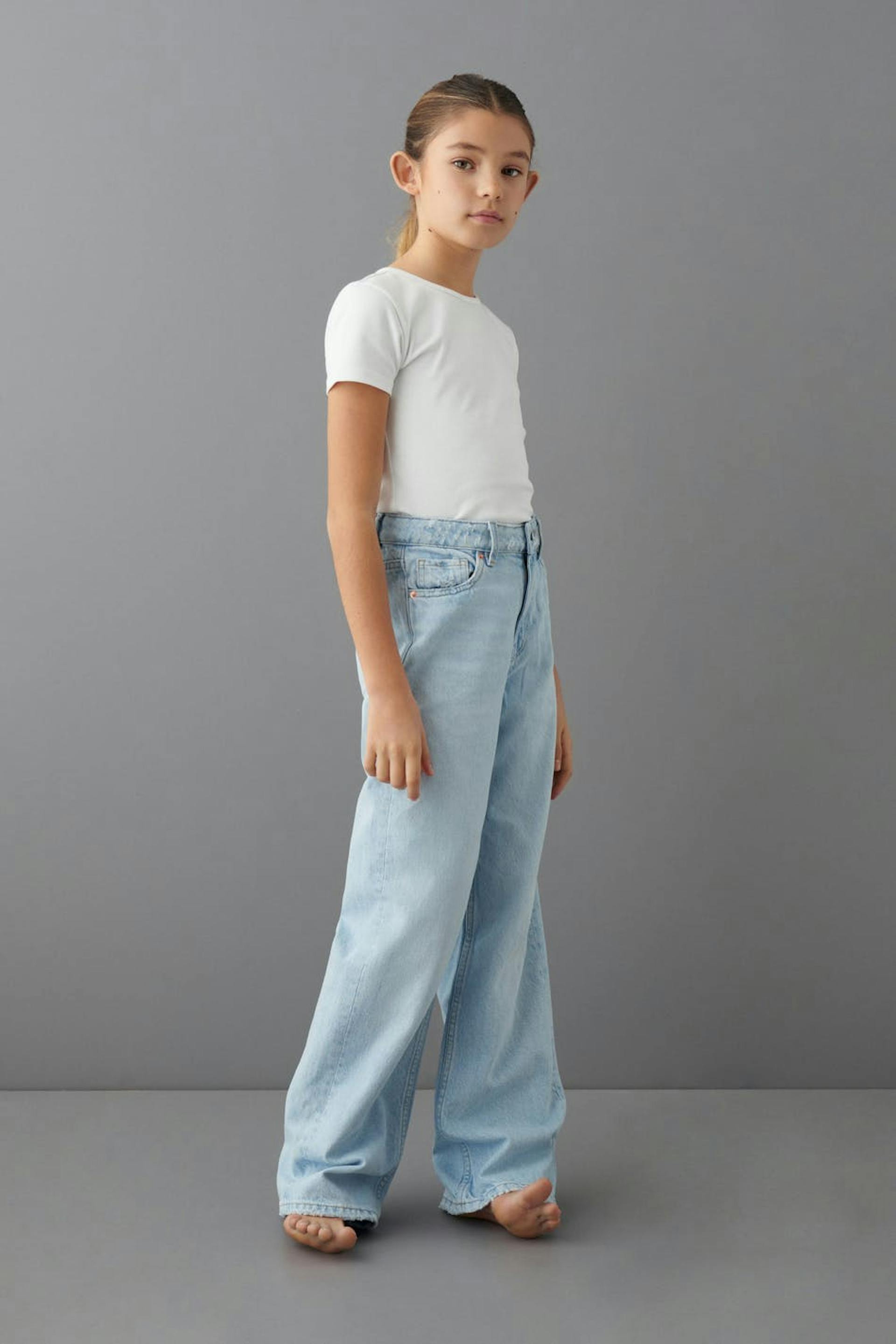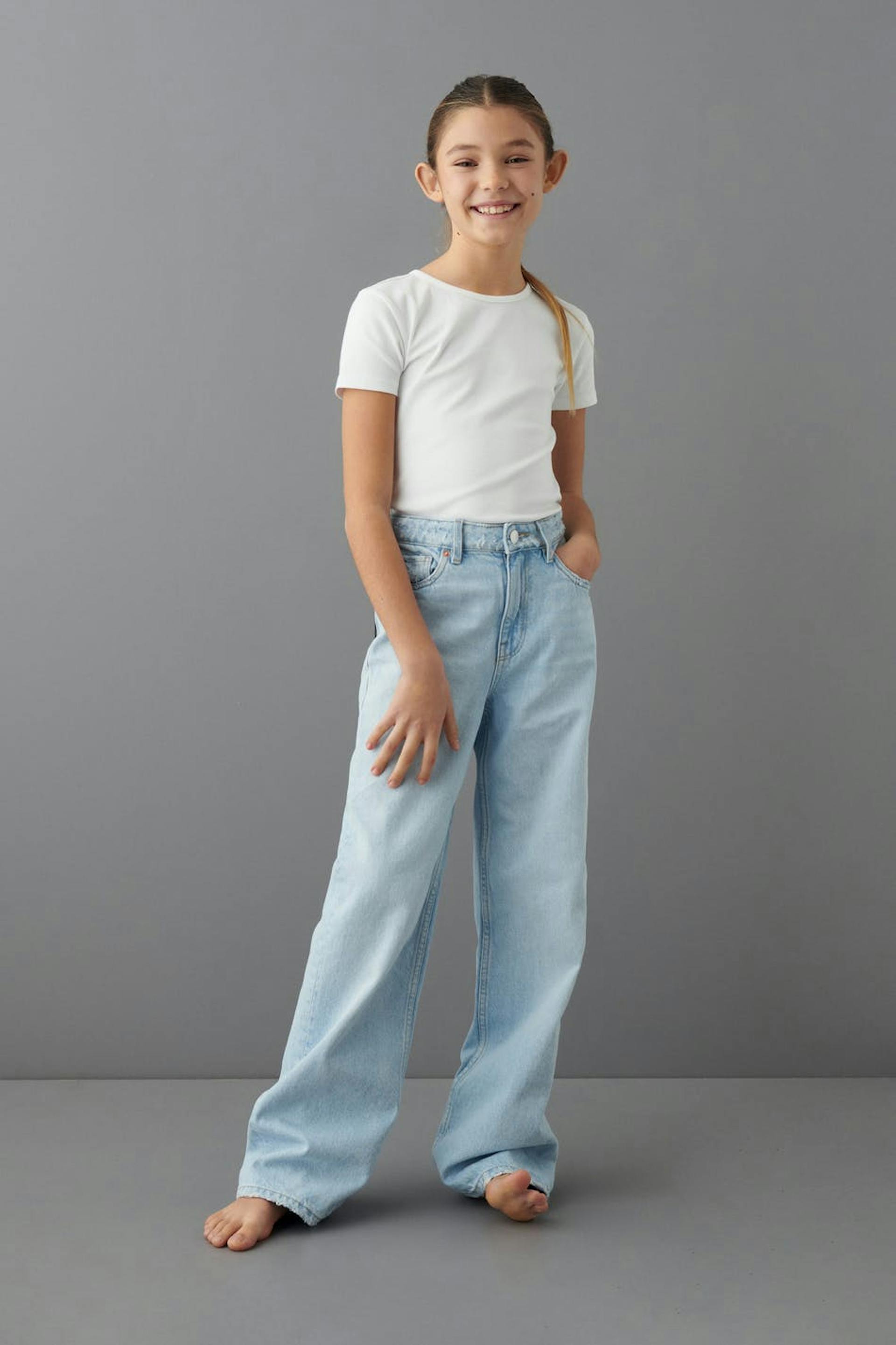 Wide jeans by our Young assortment with high waist in non-stretch denim. The jeans is light-blue and has a zip fly. It has wide legs with normal length, an adjustable elastic at the waist and pockets at the front and back.