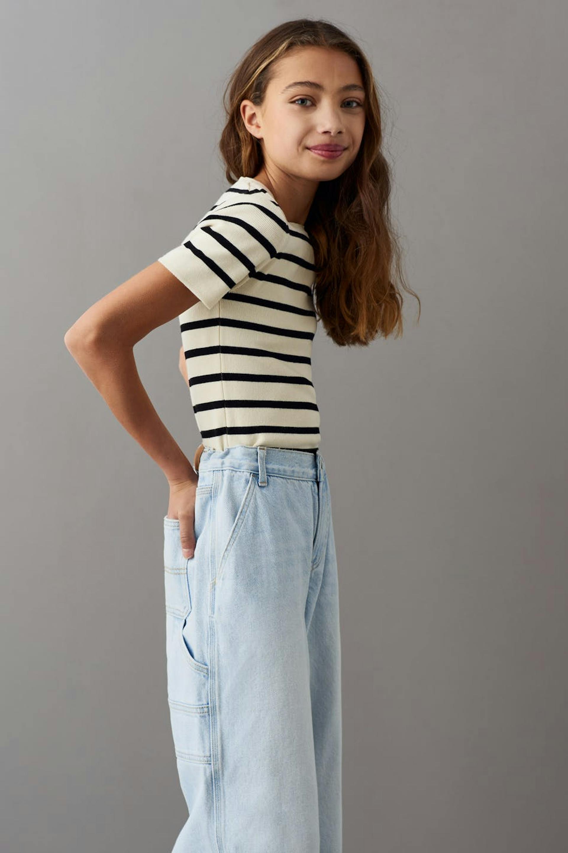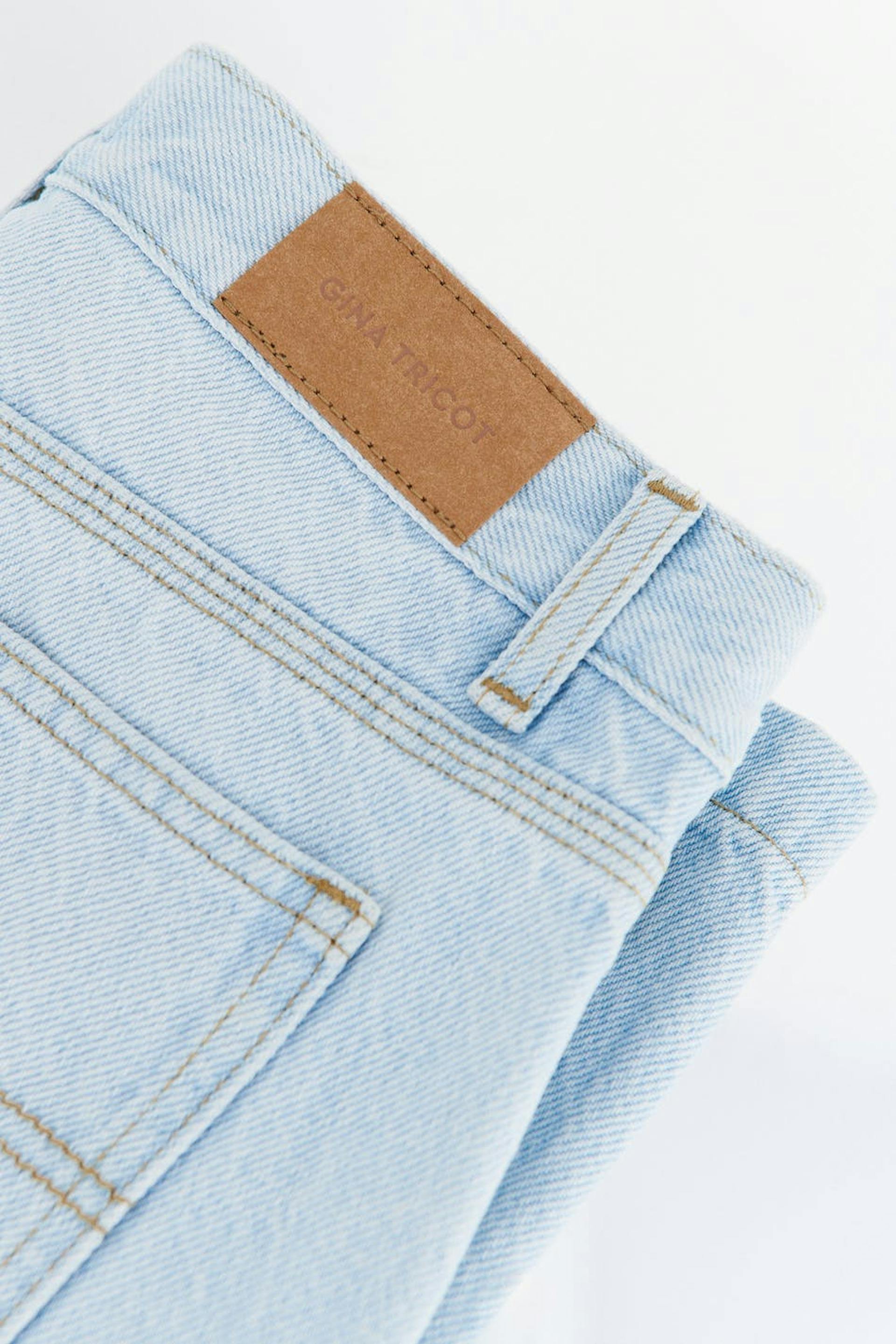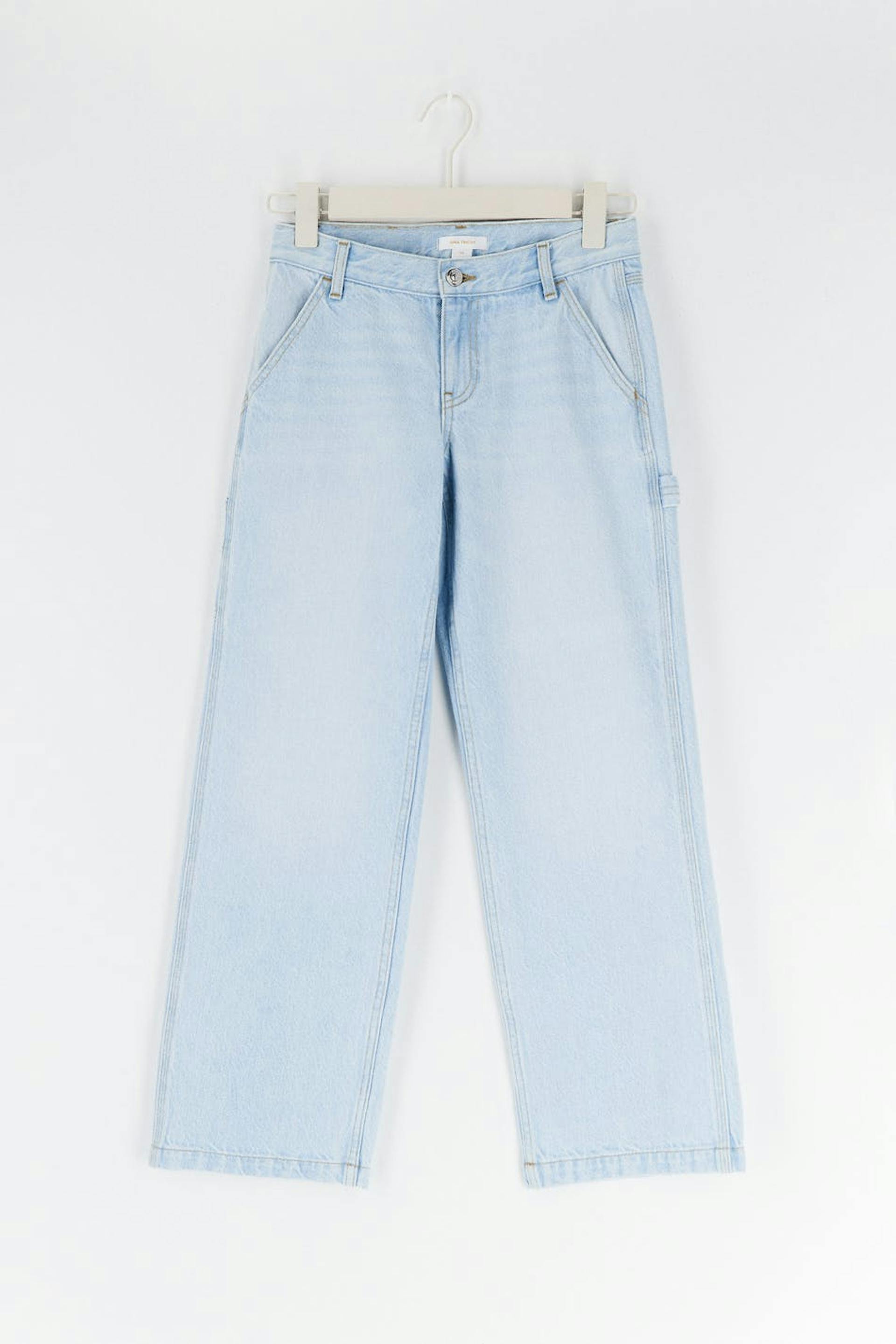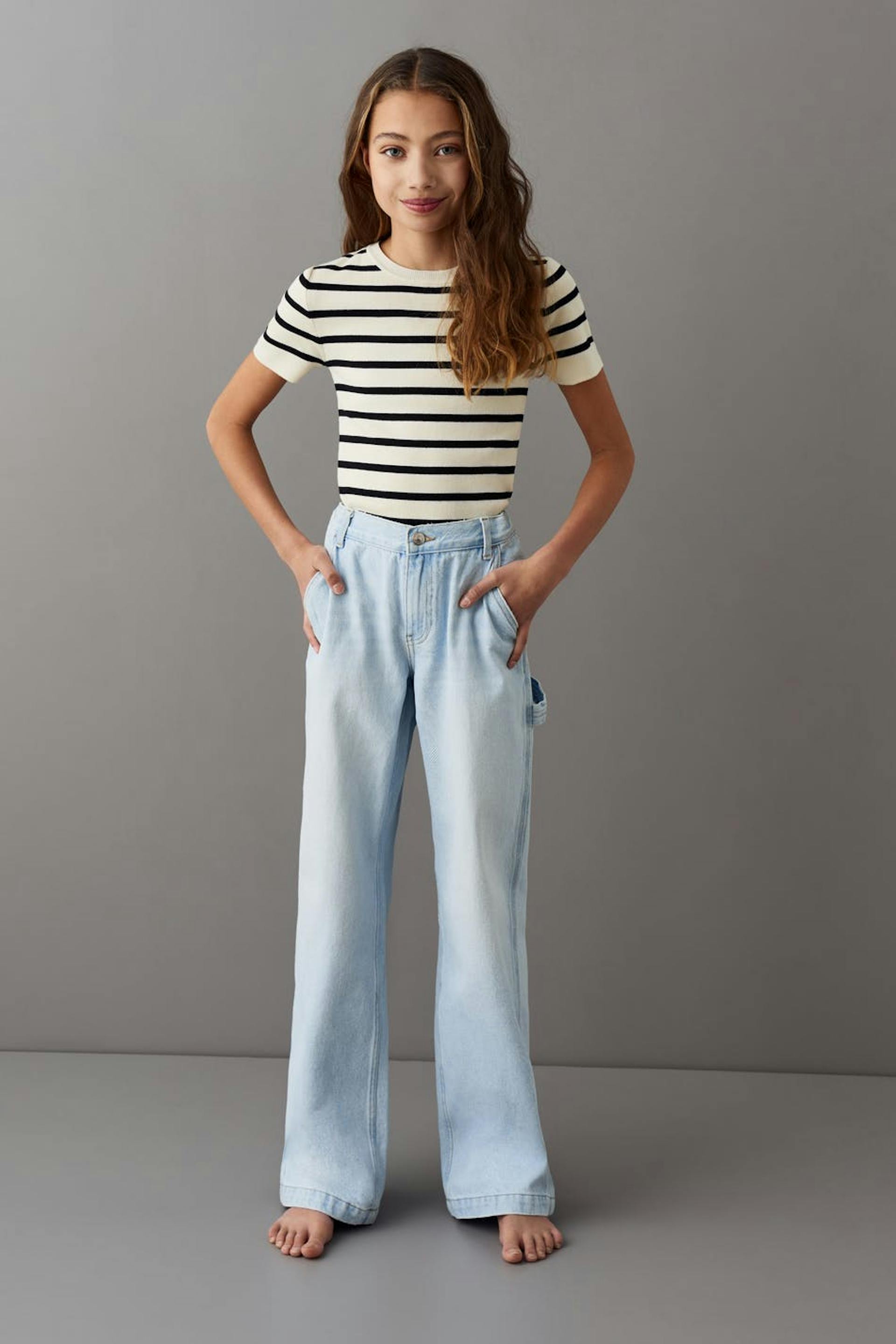 Wide jeans by Gina Tricot Young with carpenter inspired pockets. The jeans are light-blue and have mid waist in non-stretch denim. They have wide legs with full length, zip fly and adjustable elastic at the waist.