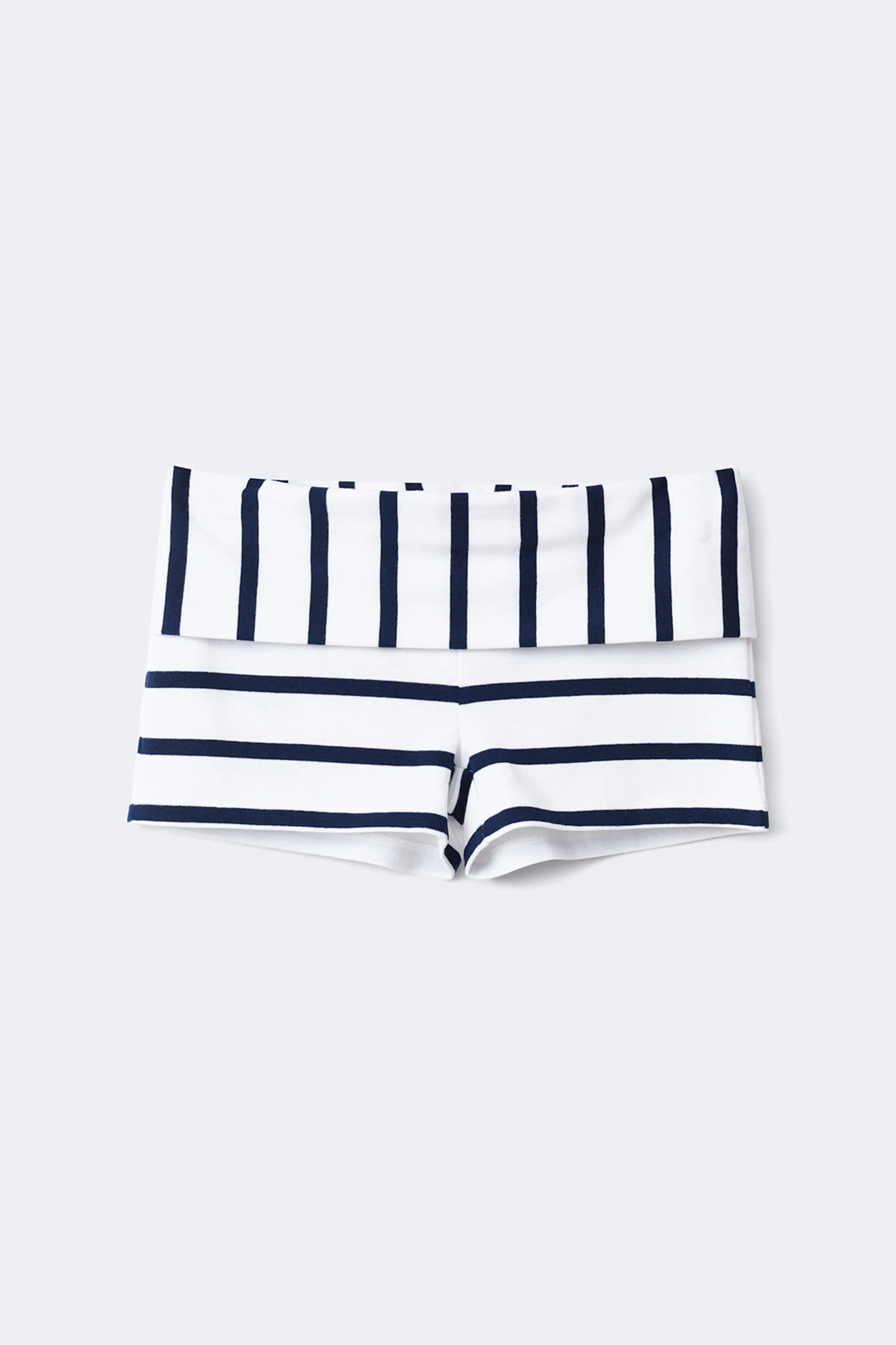 Striped shorts with fold-over waist. The shorts are blue and white and have figure-hugging fit. They have soft, stretchy material.