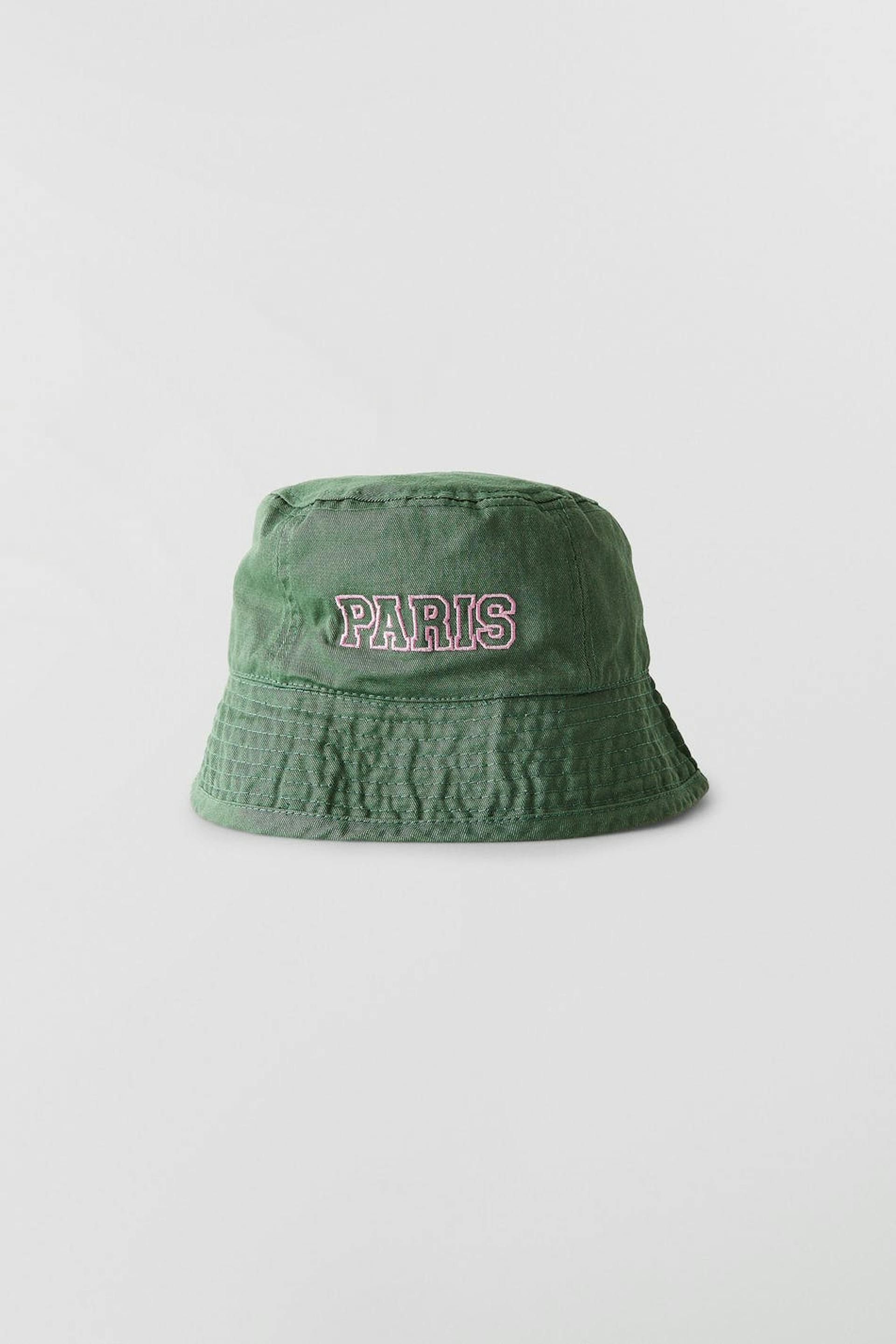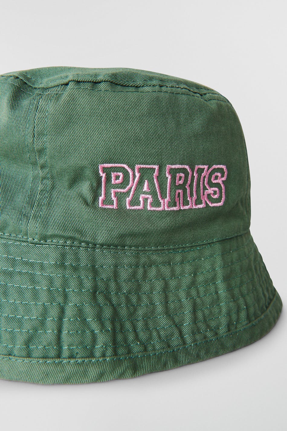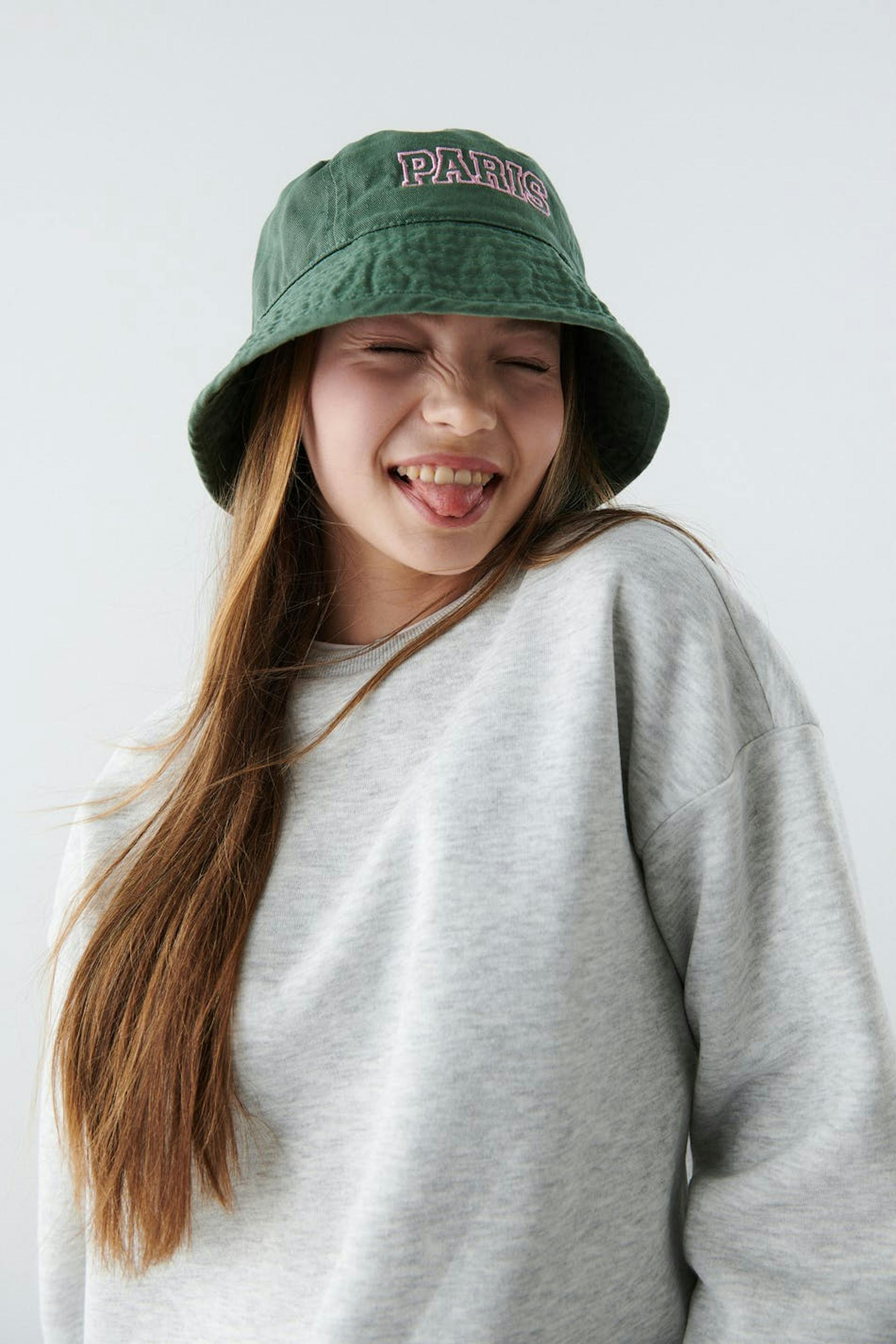 Bucket hat by our Young assortment in cotton with embroidered text at the front. The bucket hat is green.