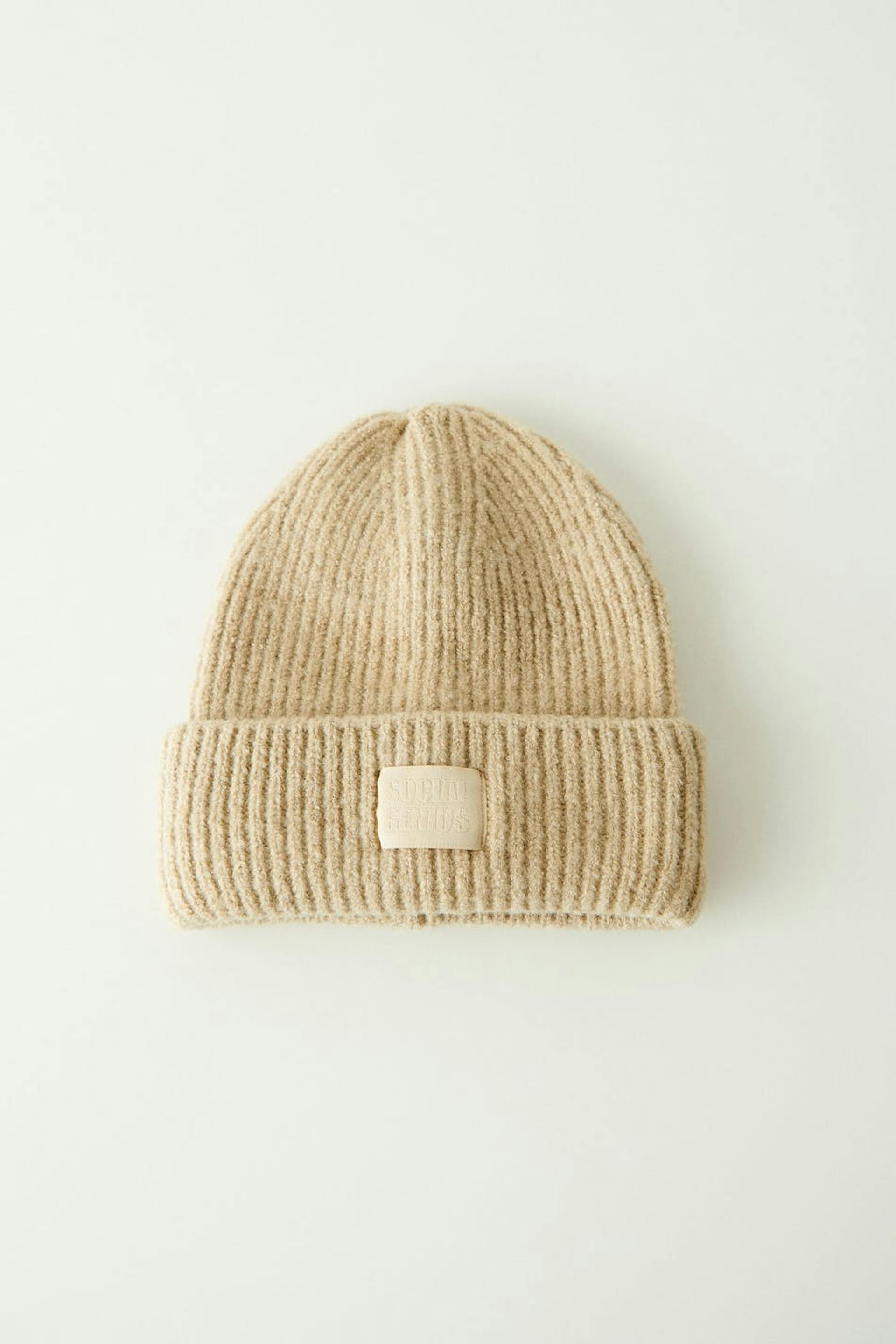 Rib-knit beanie by our Young assortment with a folded edge. The beanie is beige and has patch at the front.