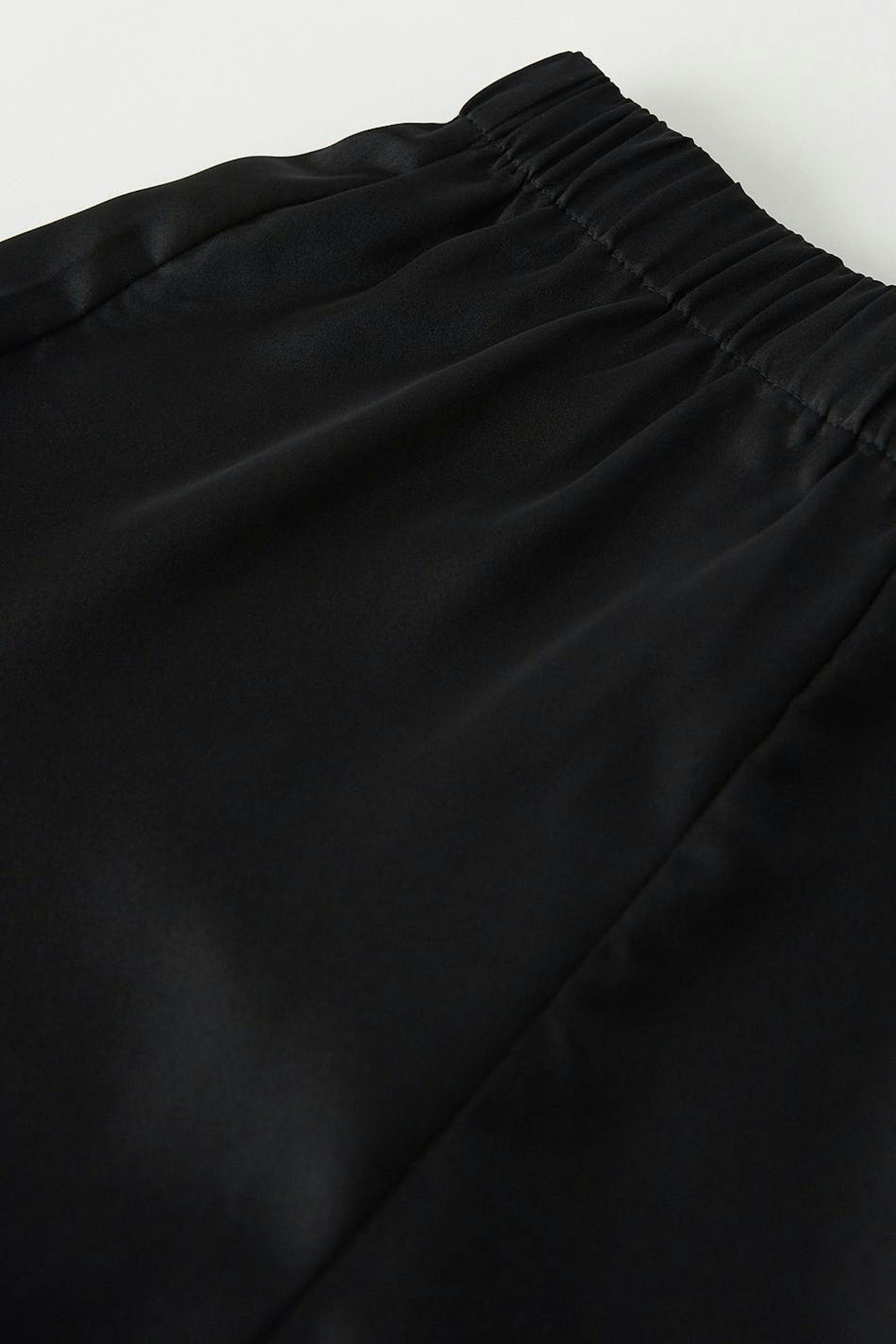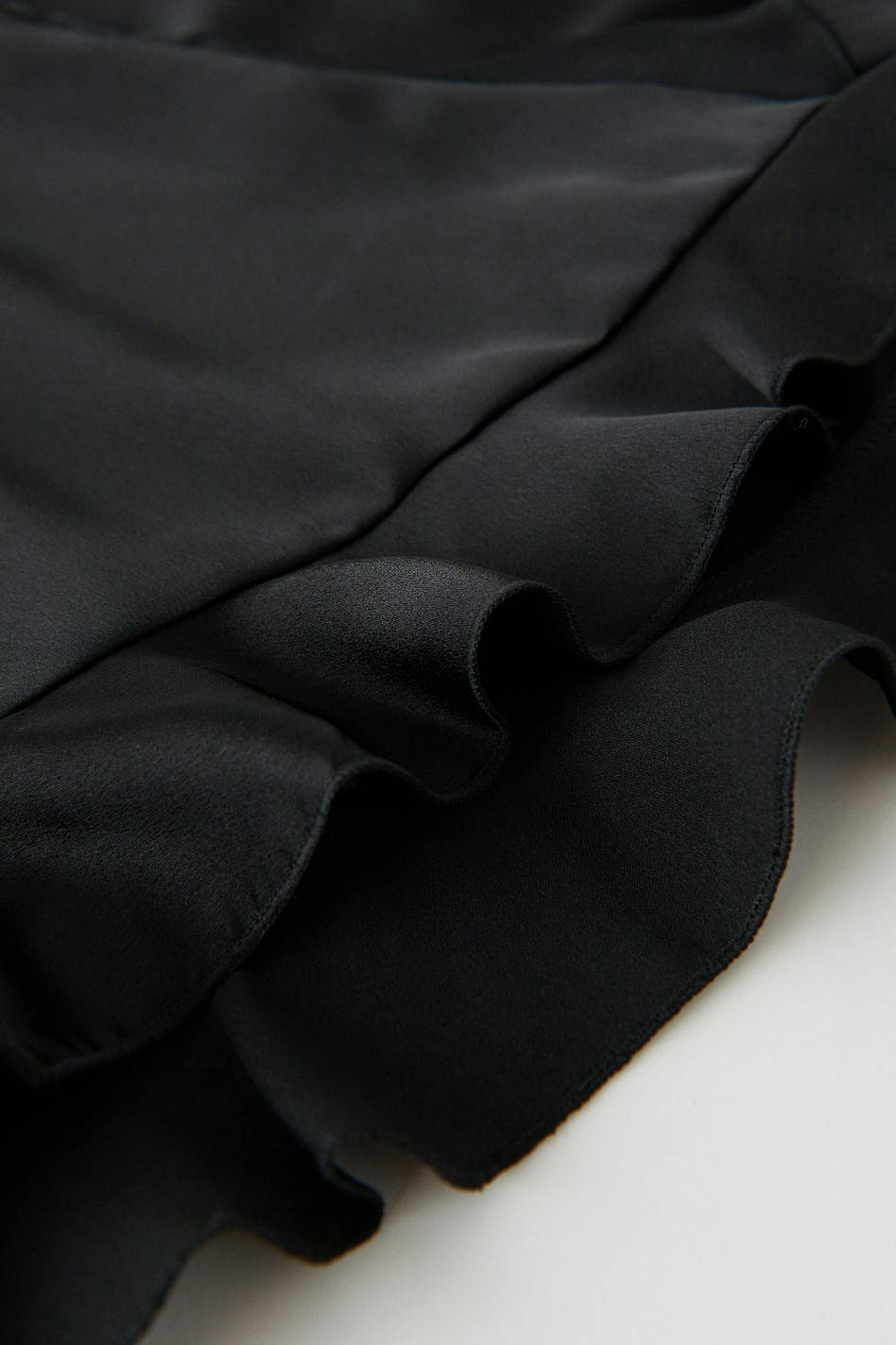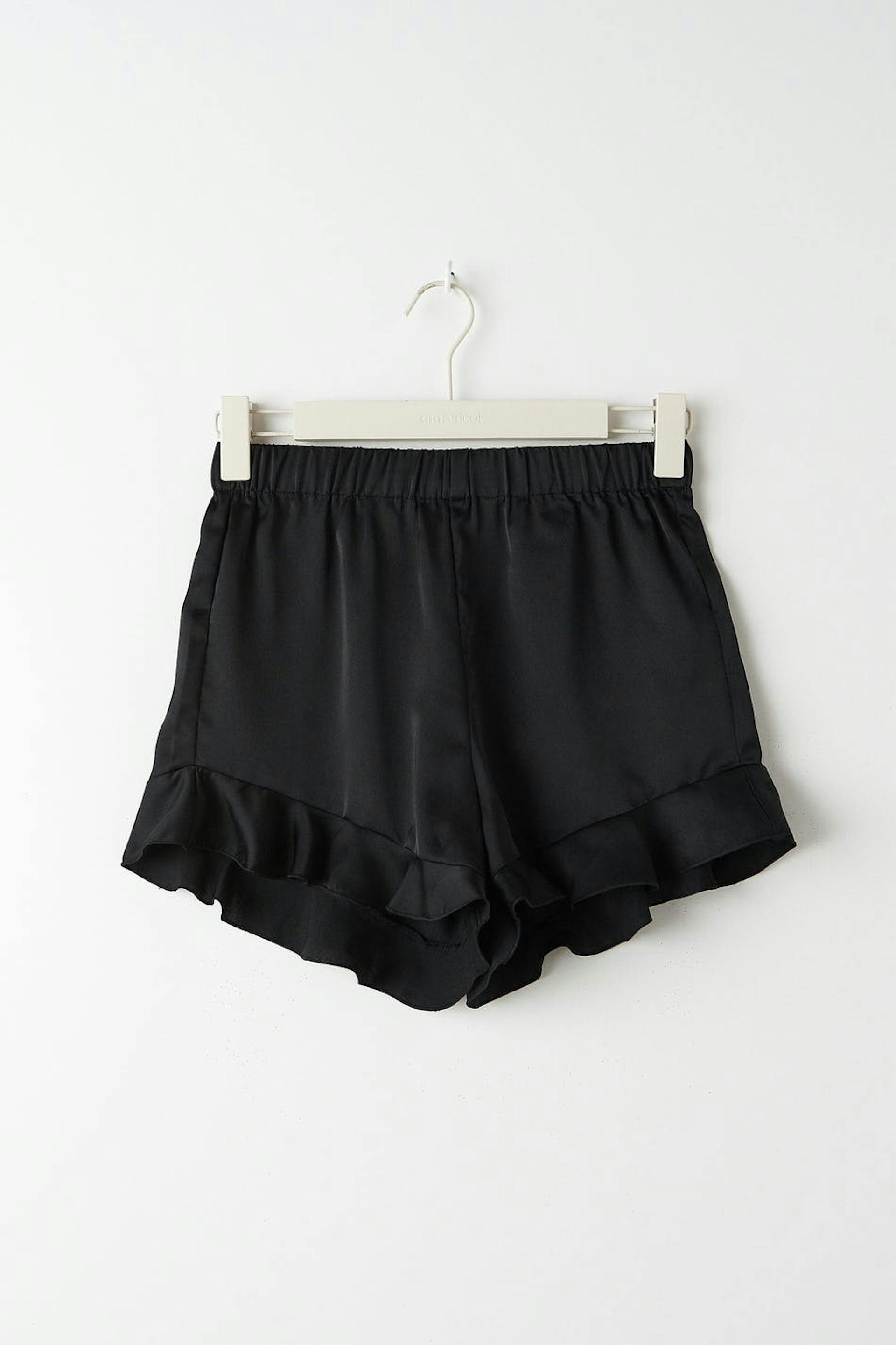 Cute shorts in satin with frills at the bottom. The shorts are black and have an elastic band at the waist.
