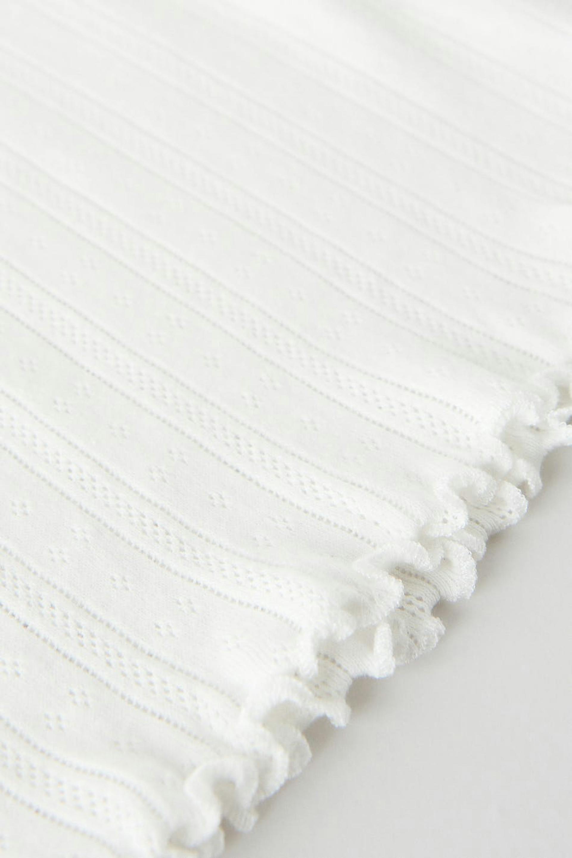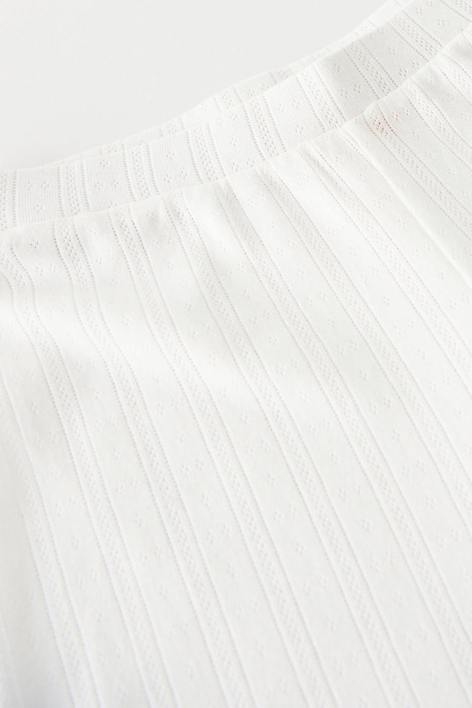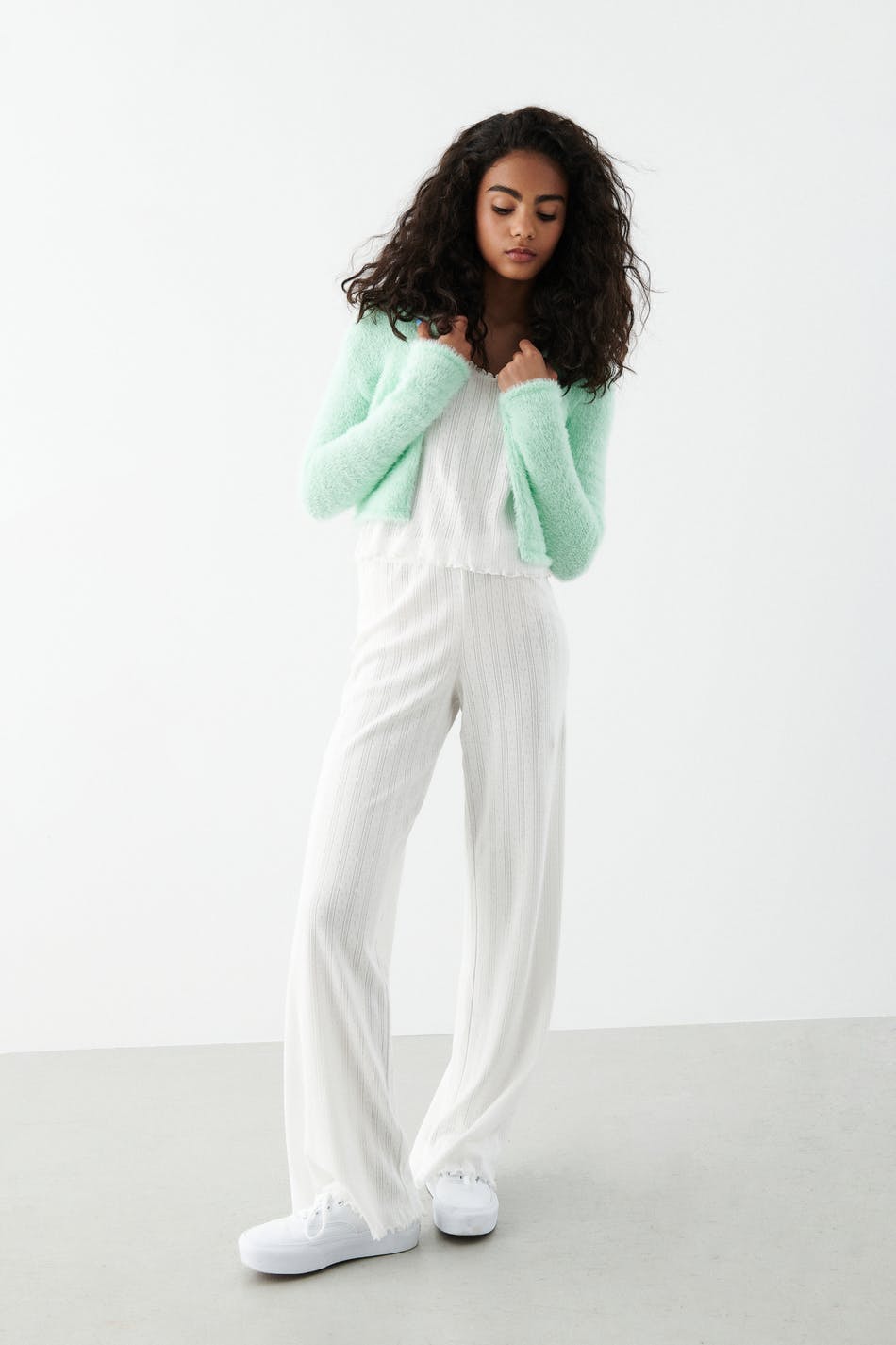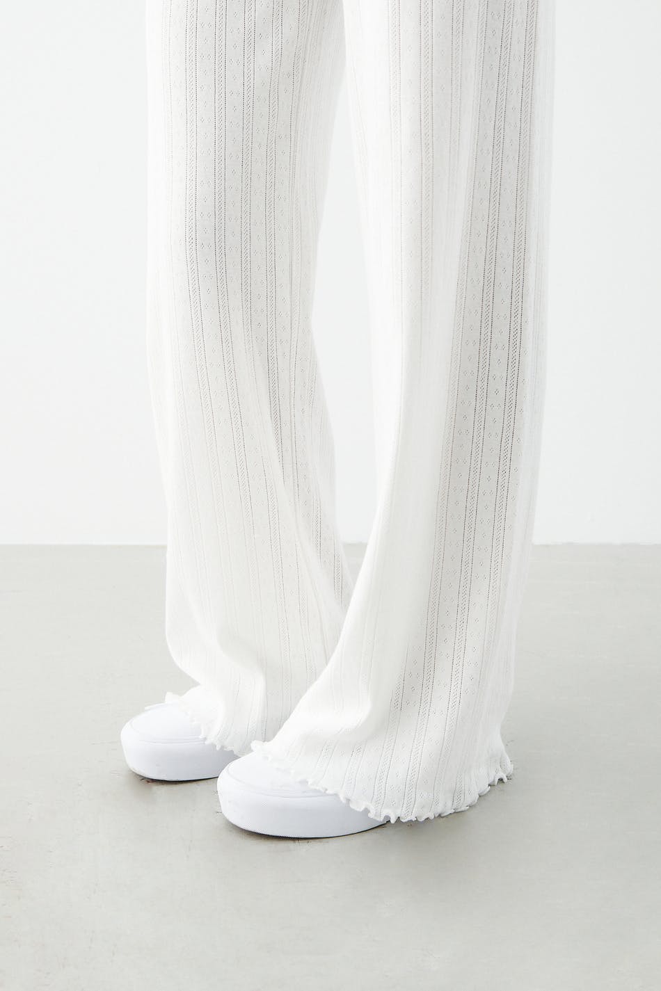 Lounge pants with a regular fit. The trousers are white and have wide legs. They have elastic at the waist and lettuce hem at the bottom.
