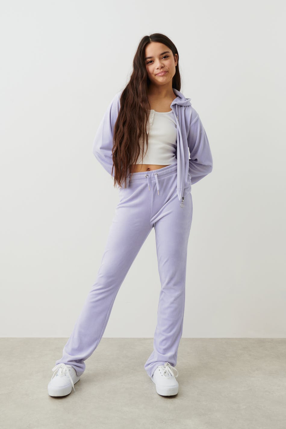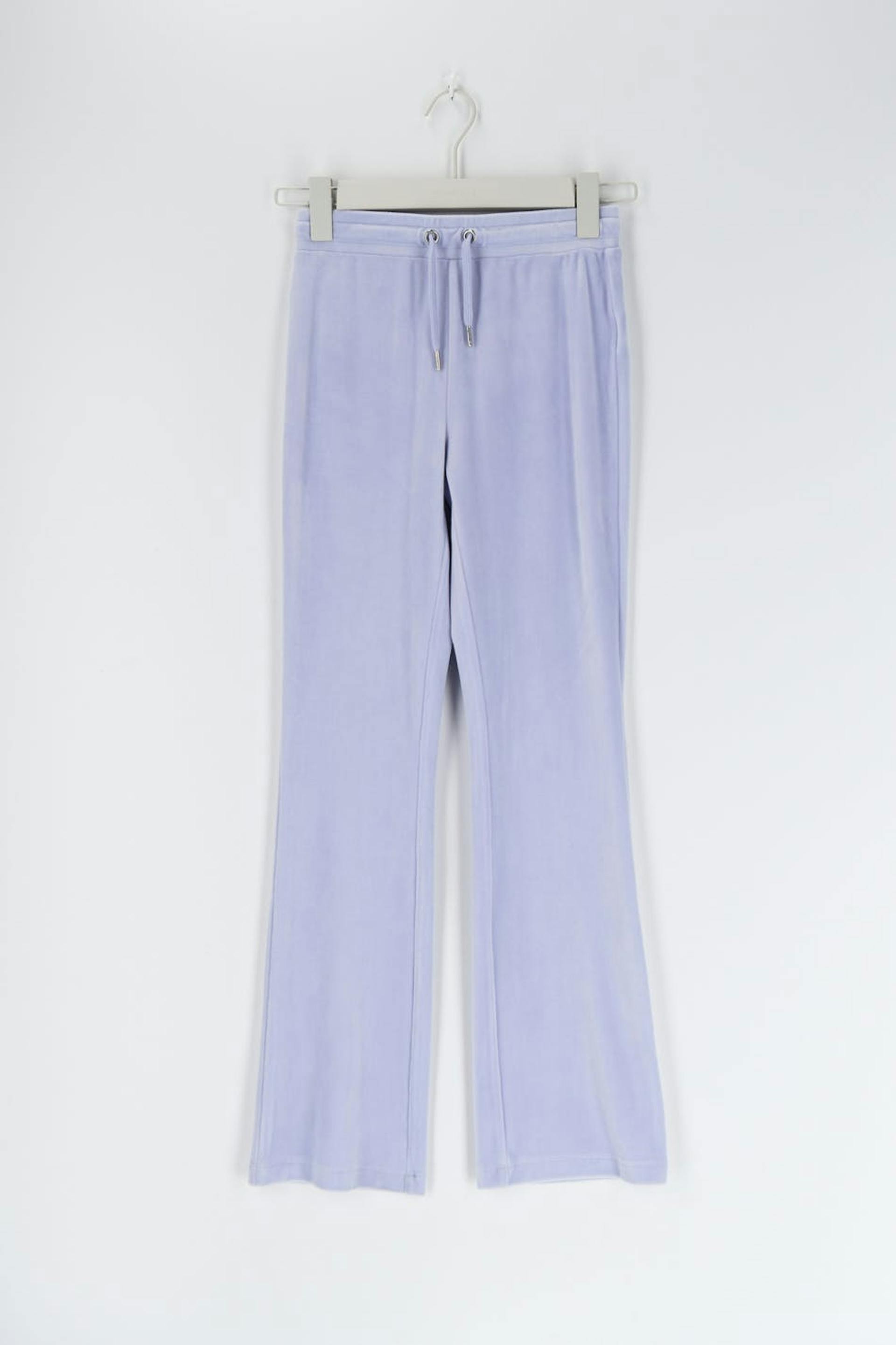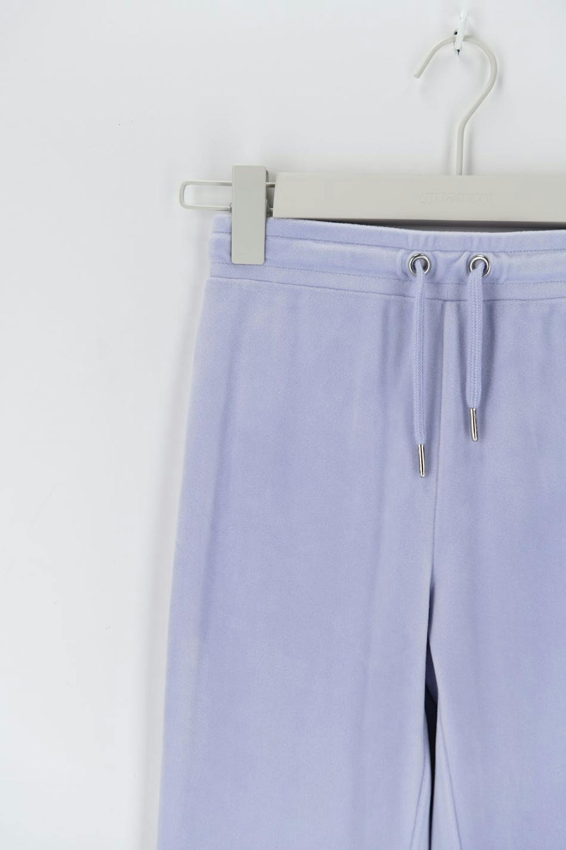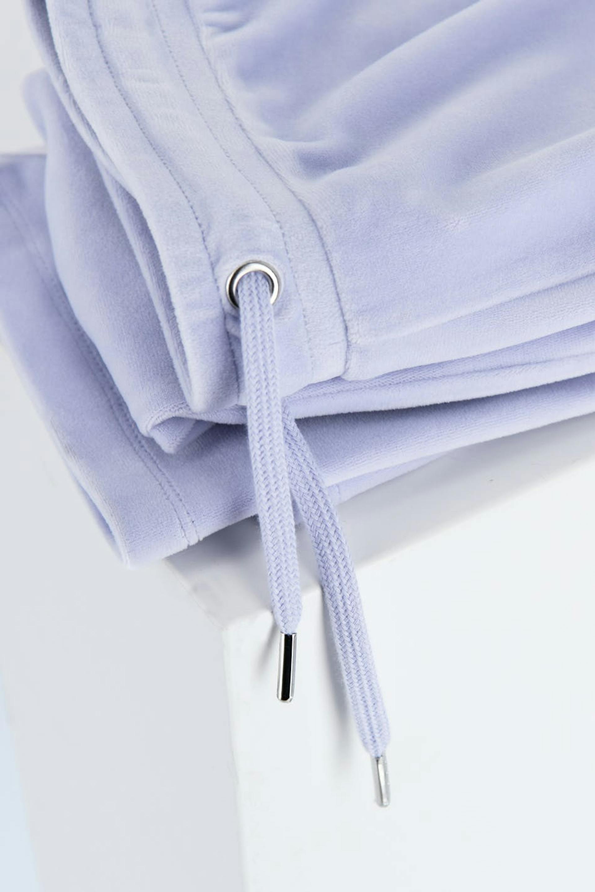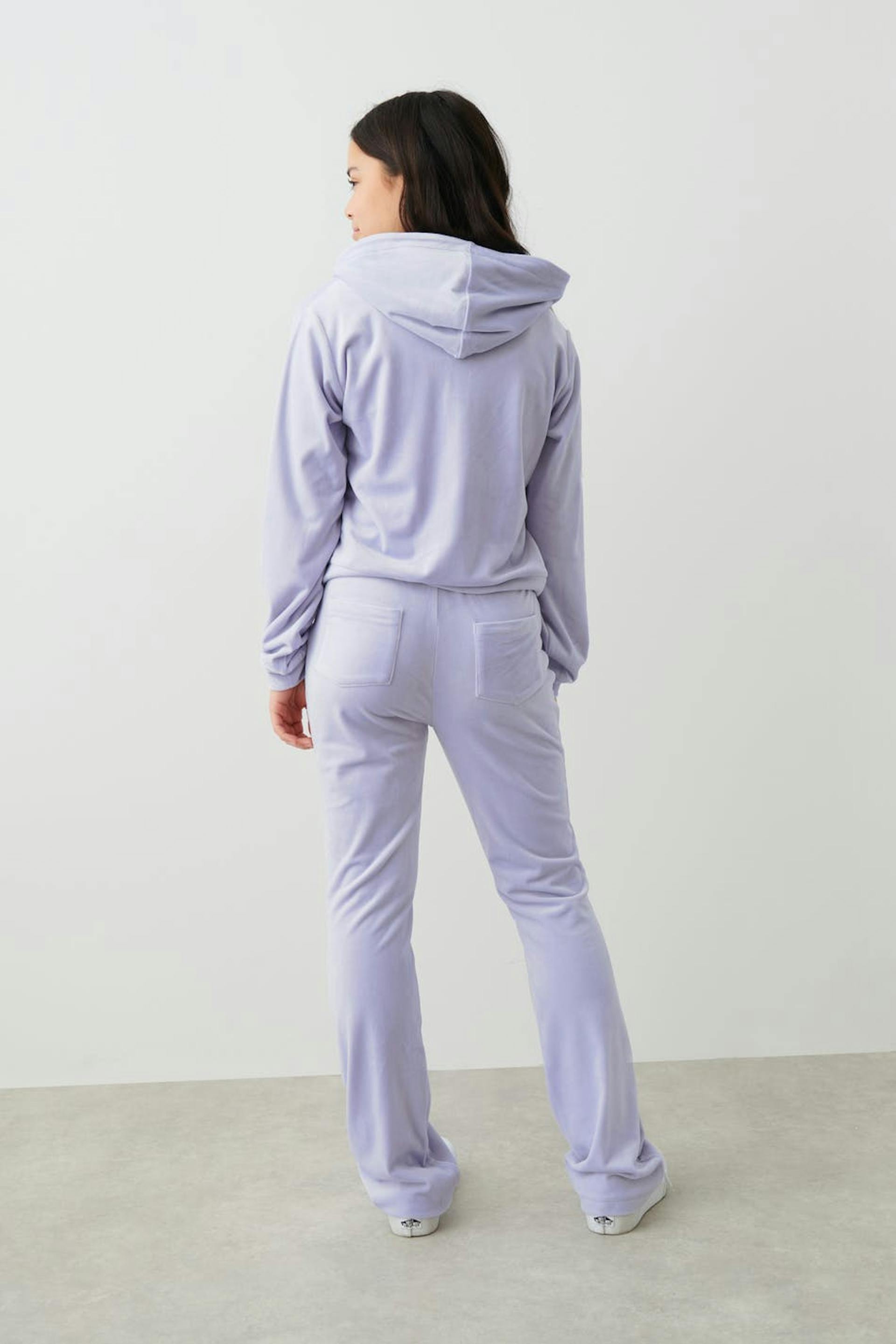 Soft lounge pants in velour with back pockets. The trousers are purple and have an elasticized waist with straps at the front.