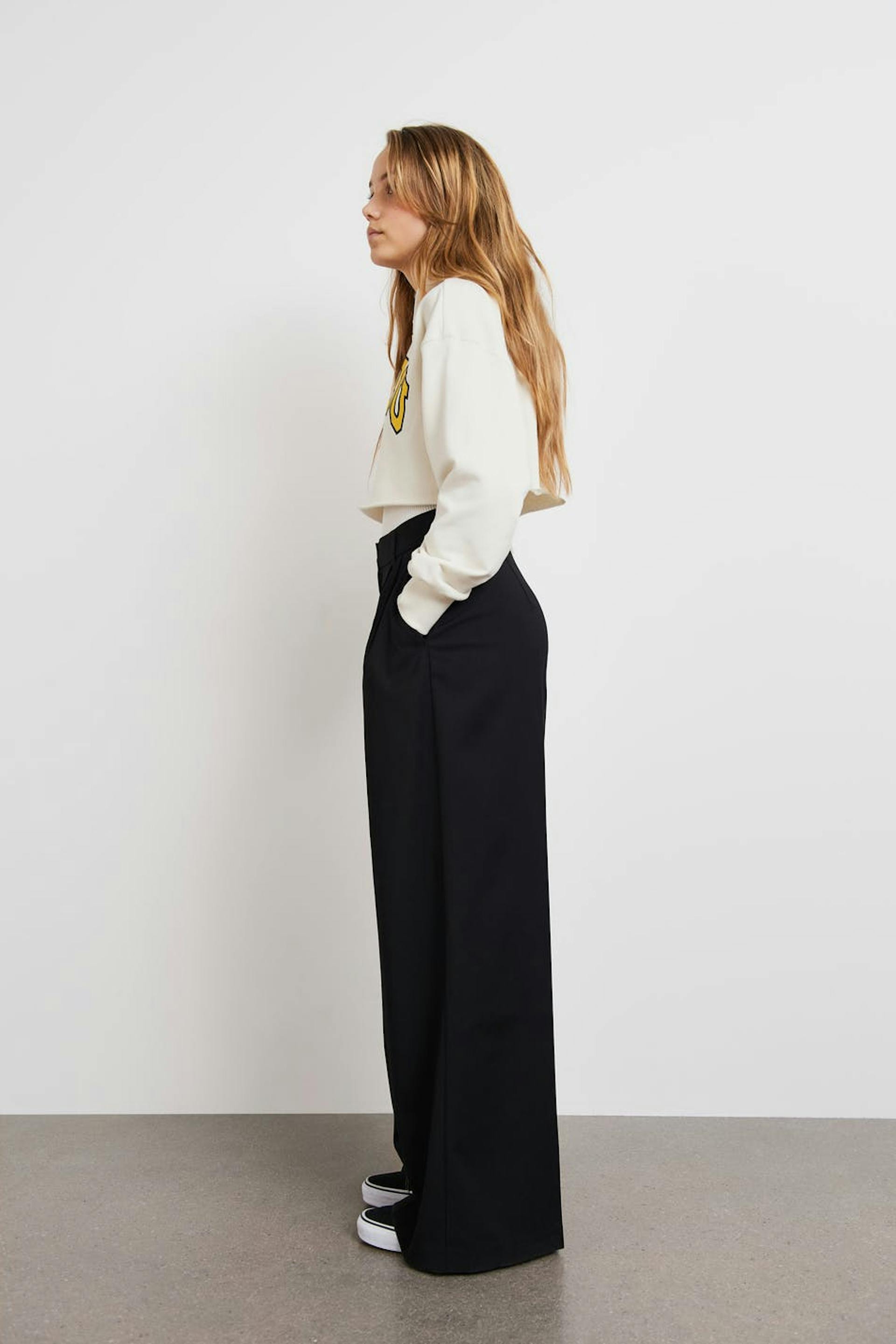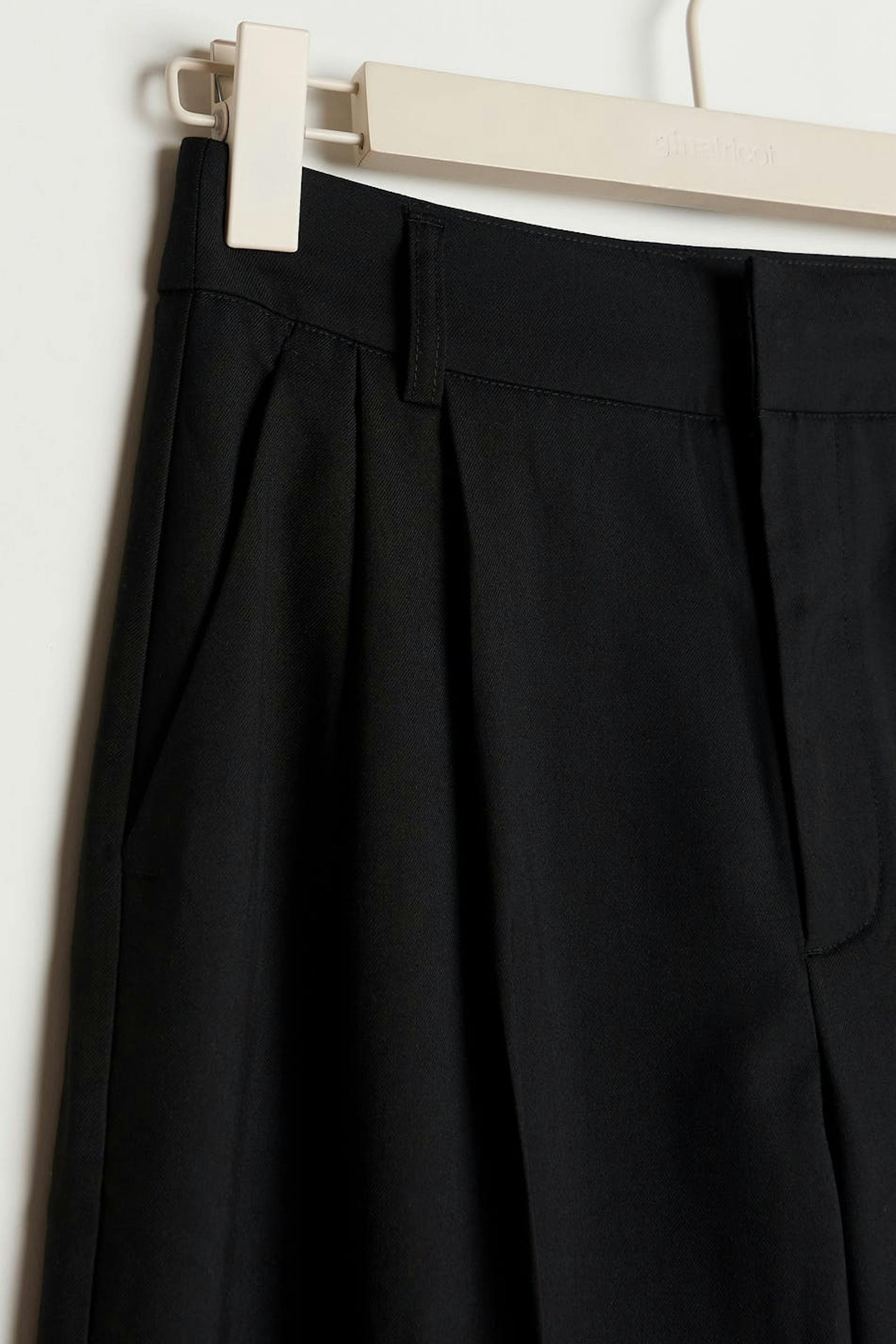 Wide suit trousers by our Young assortment with creases. The trousers are black and have double pleats at the front. They have a waistband with belt loops and slit pockets at the back.