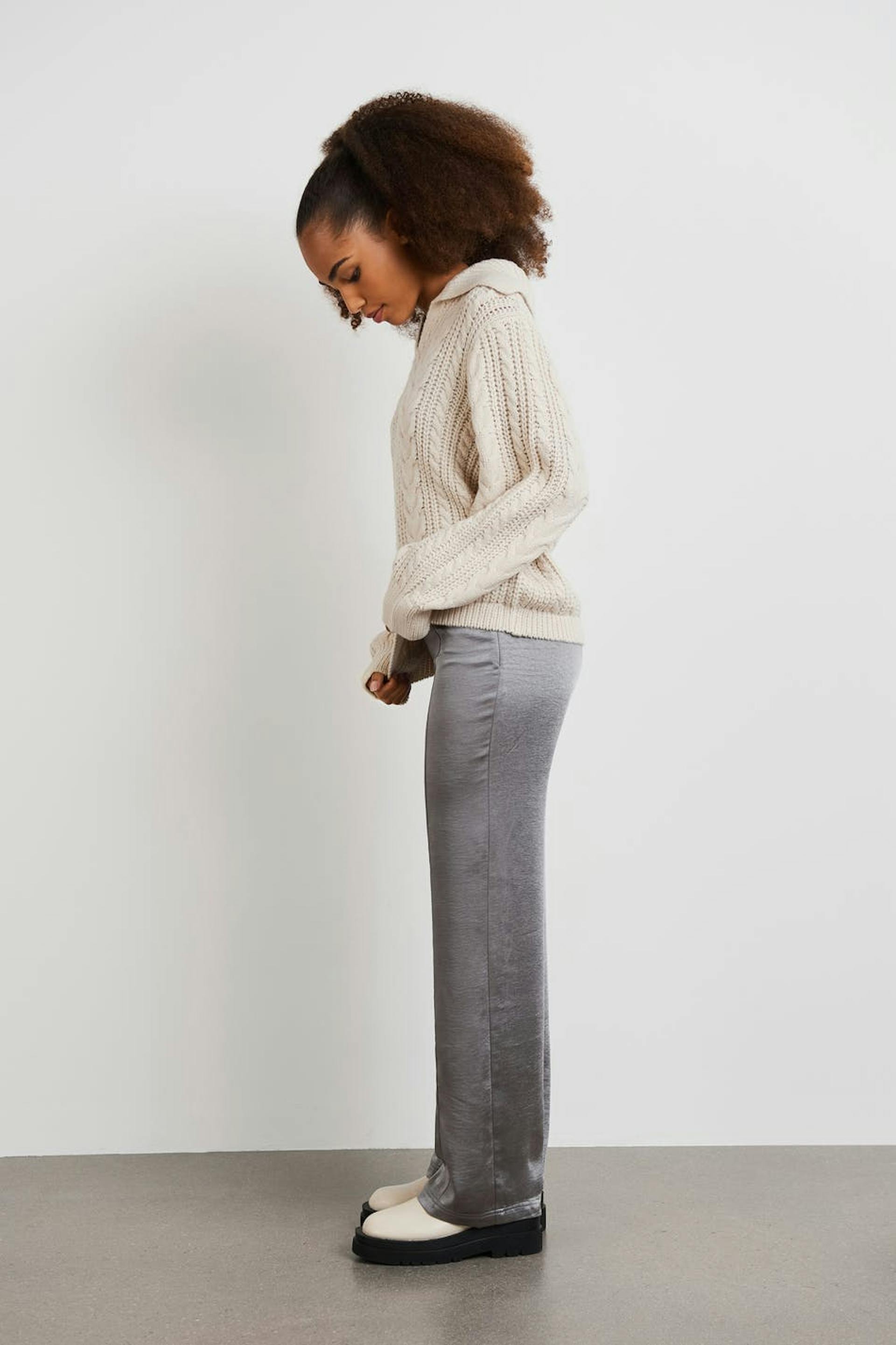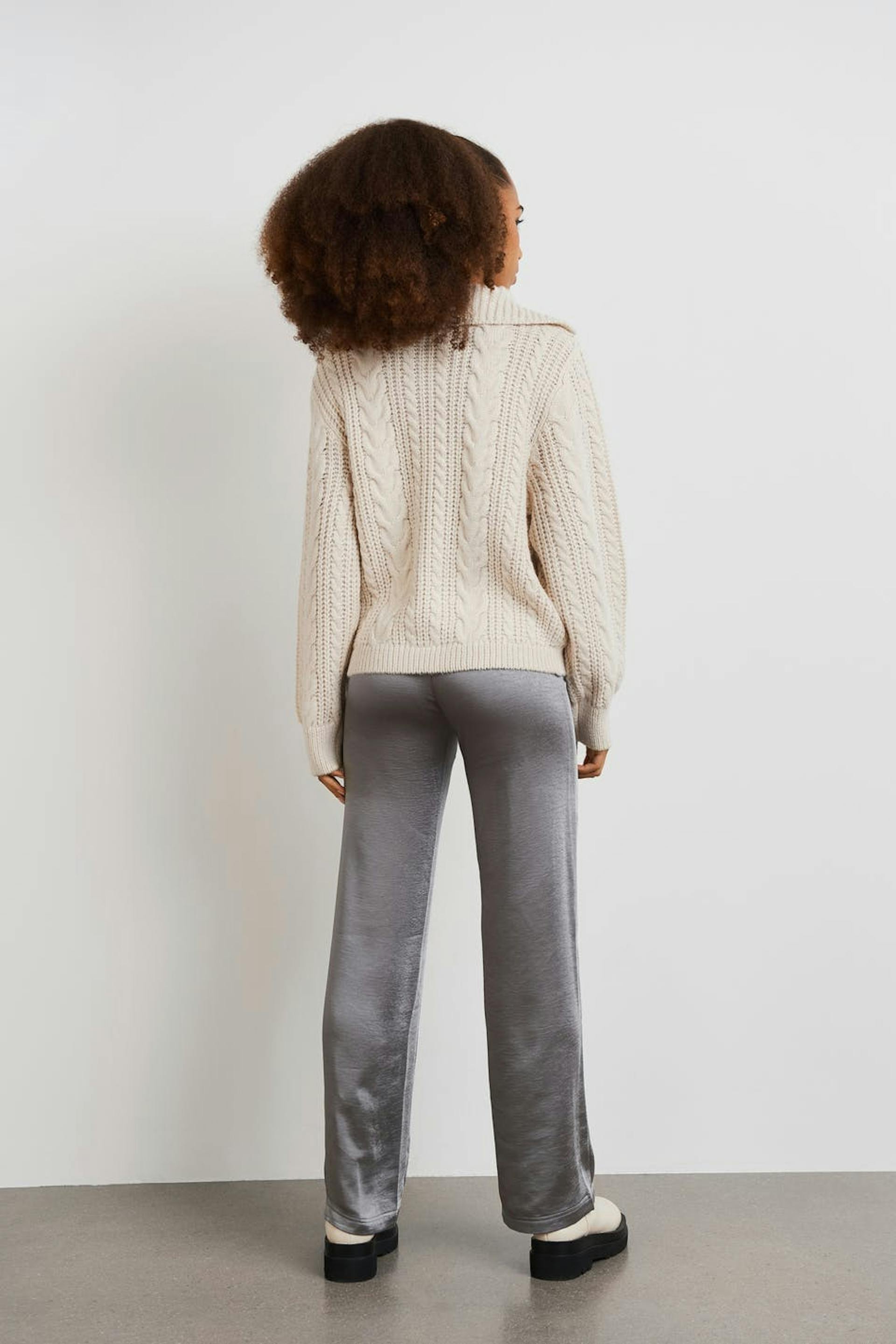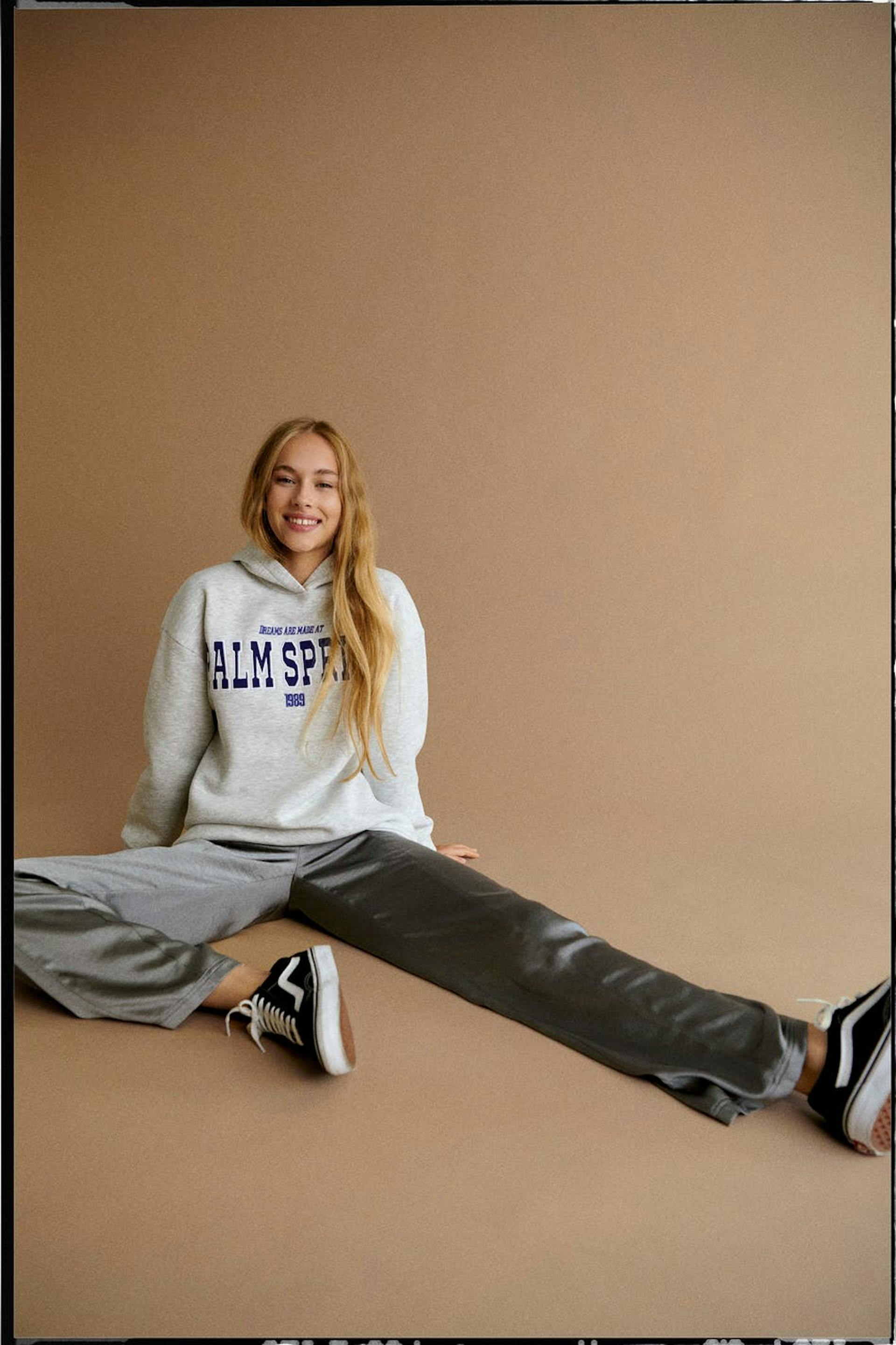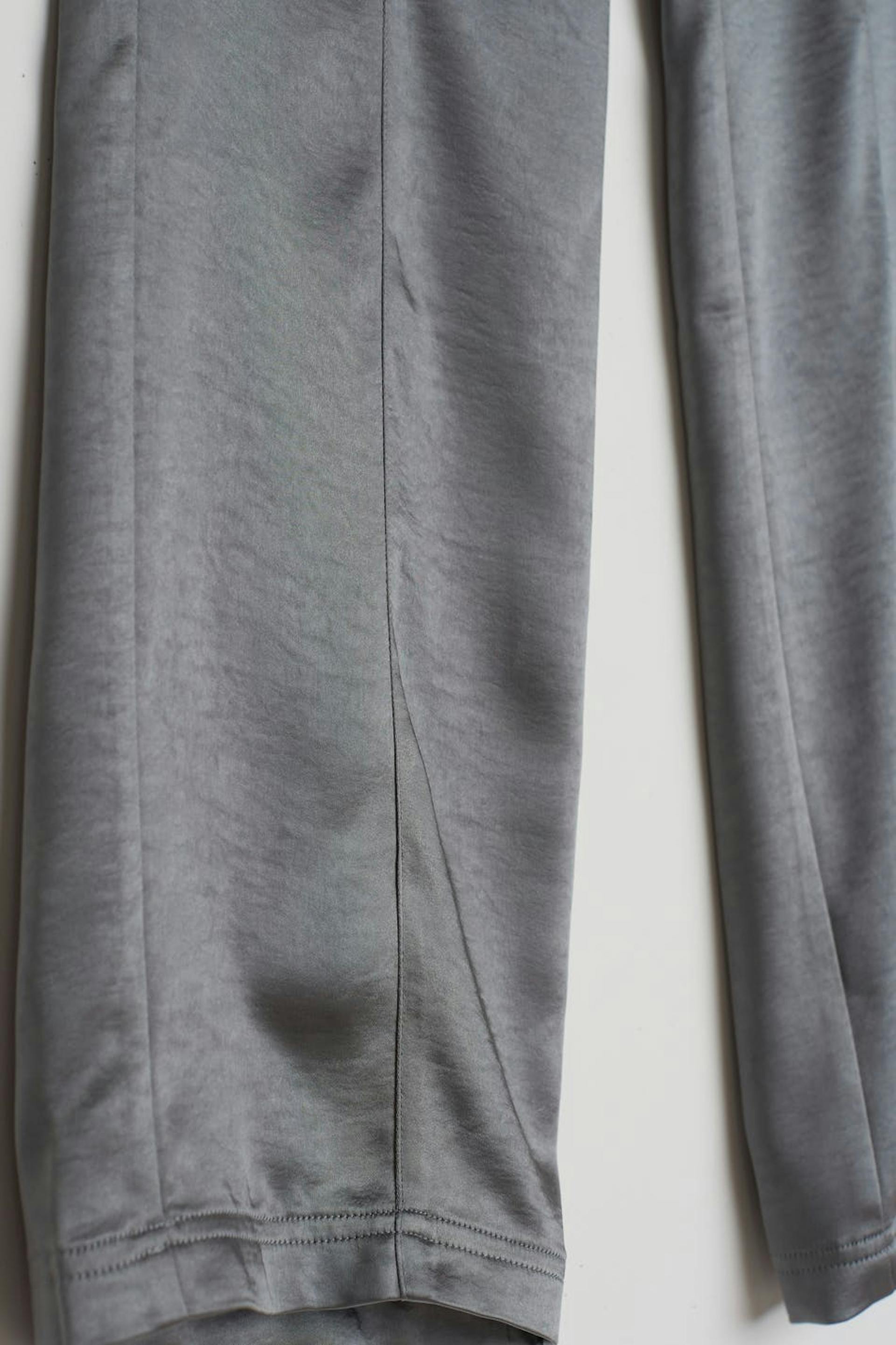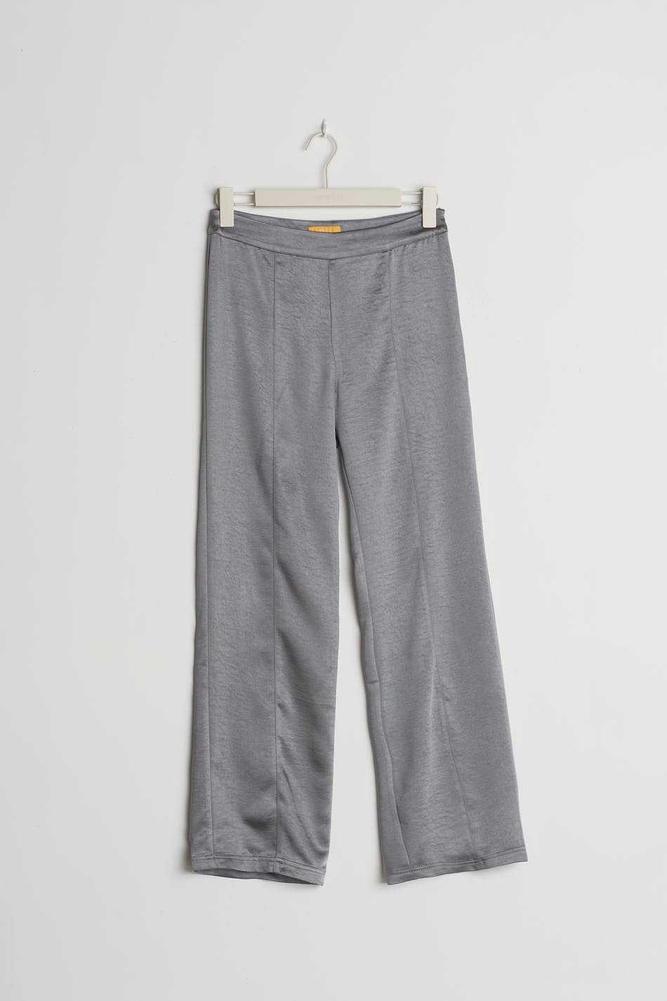 Woven trousers by our Young assortment with a regular fit. The trousers are grey and have satin material. They have a seam detail at the front, a hidden zip in the side seam and wide, full-length trouser legs.
