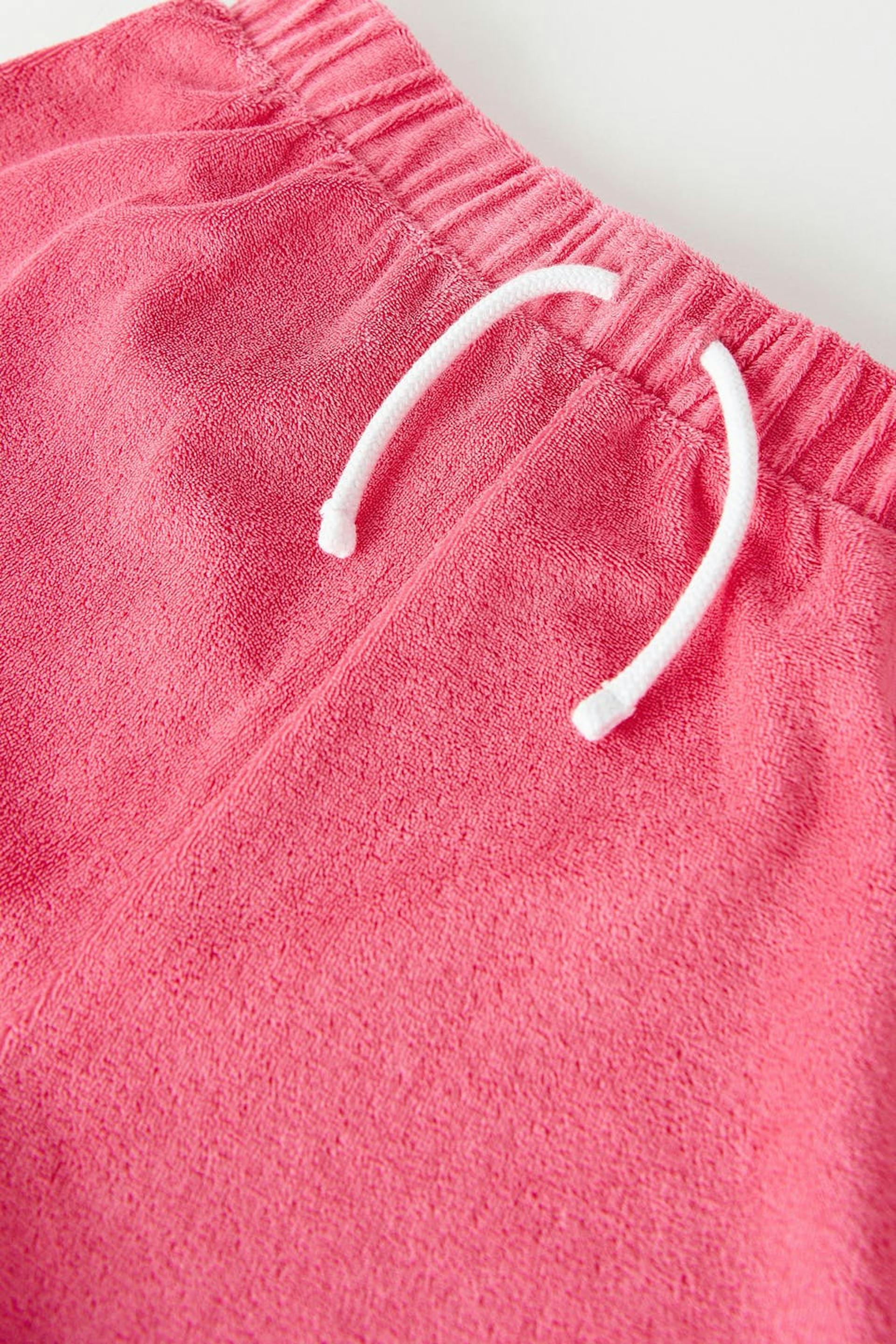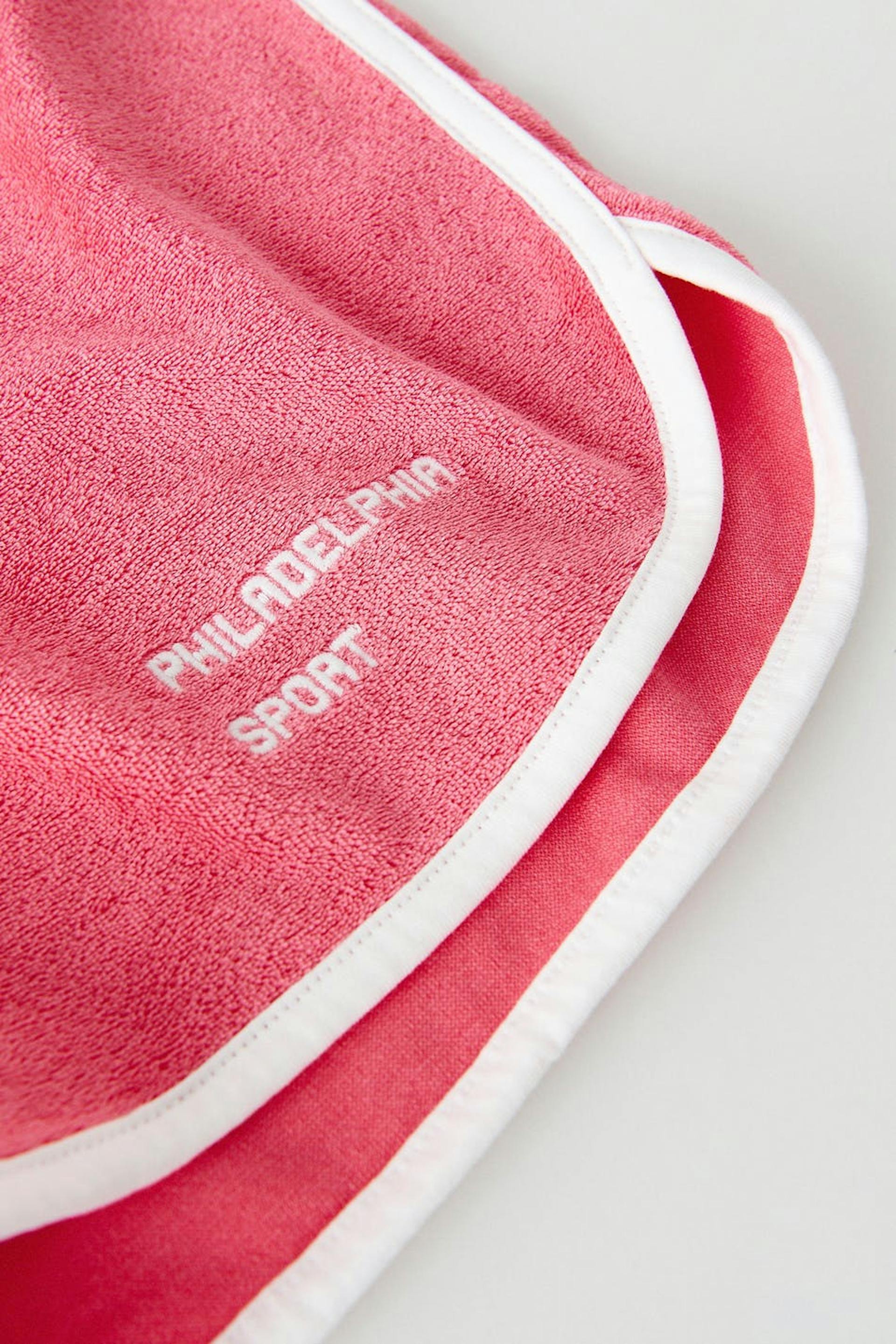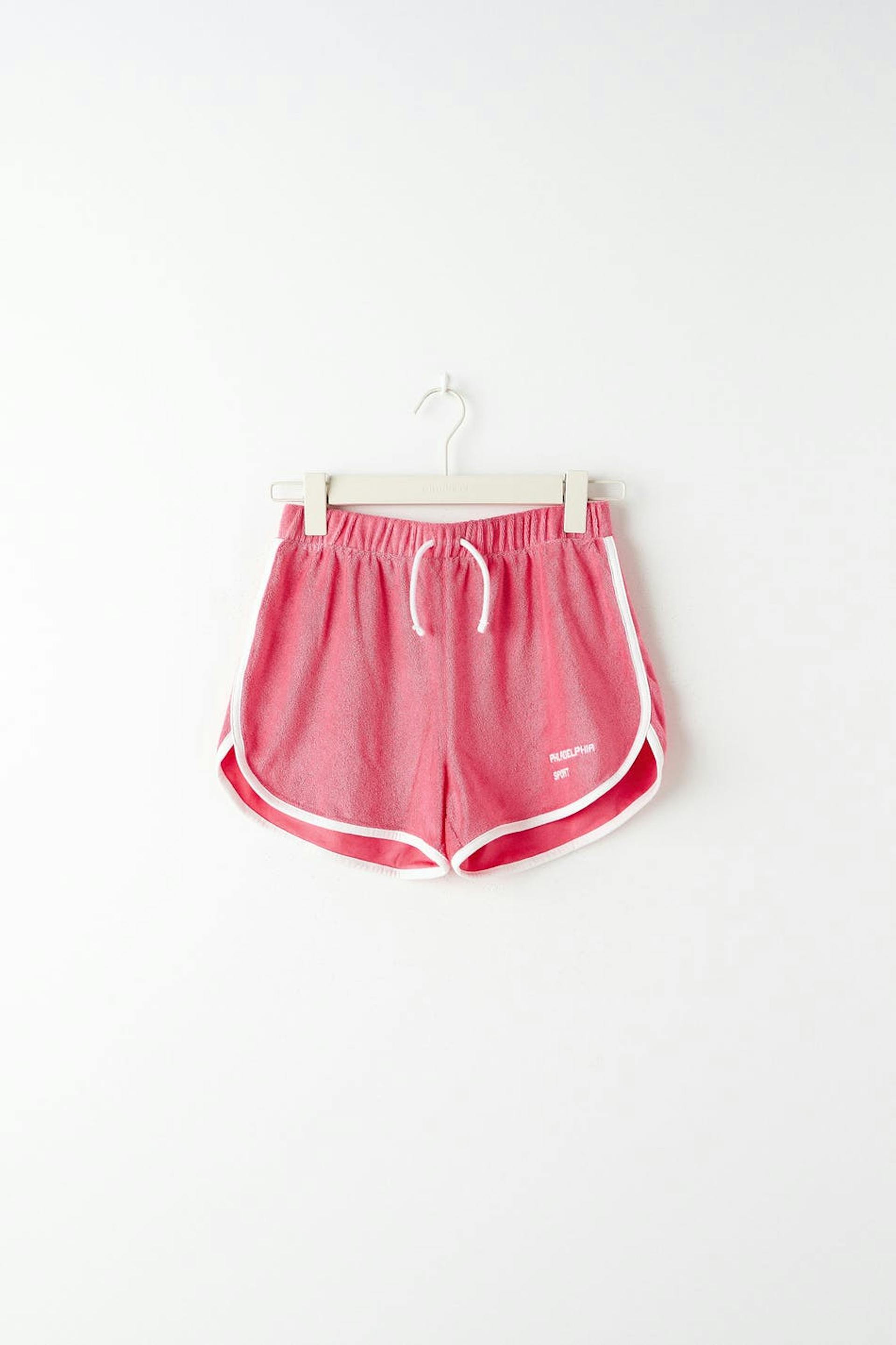 Shorts in terrycloth with a regular fit. The shorts are pink and have contrast stitches. They have embroidery on the leg and an elastic at the waist with straps at the front.