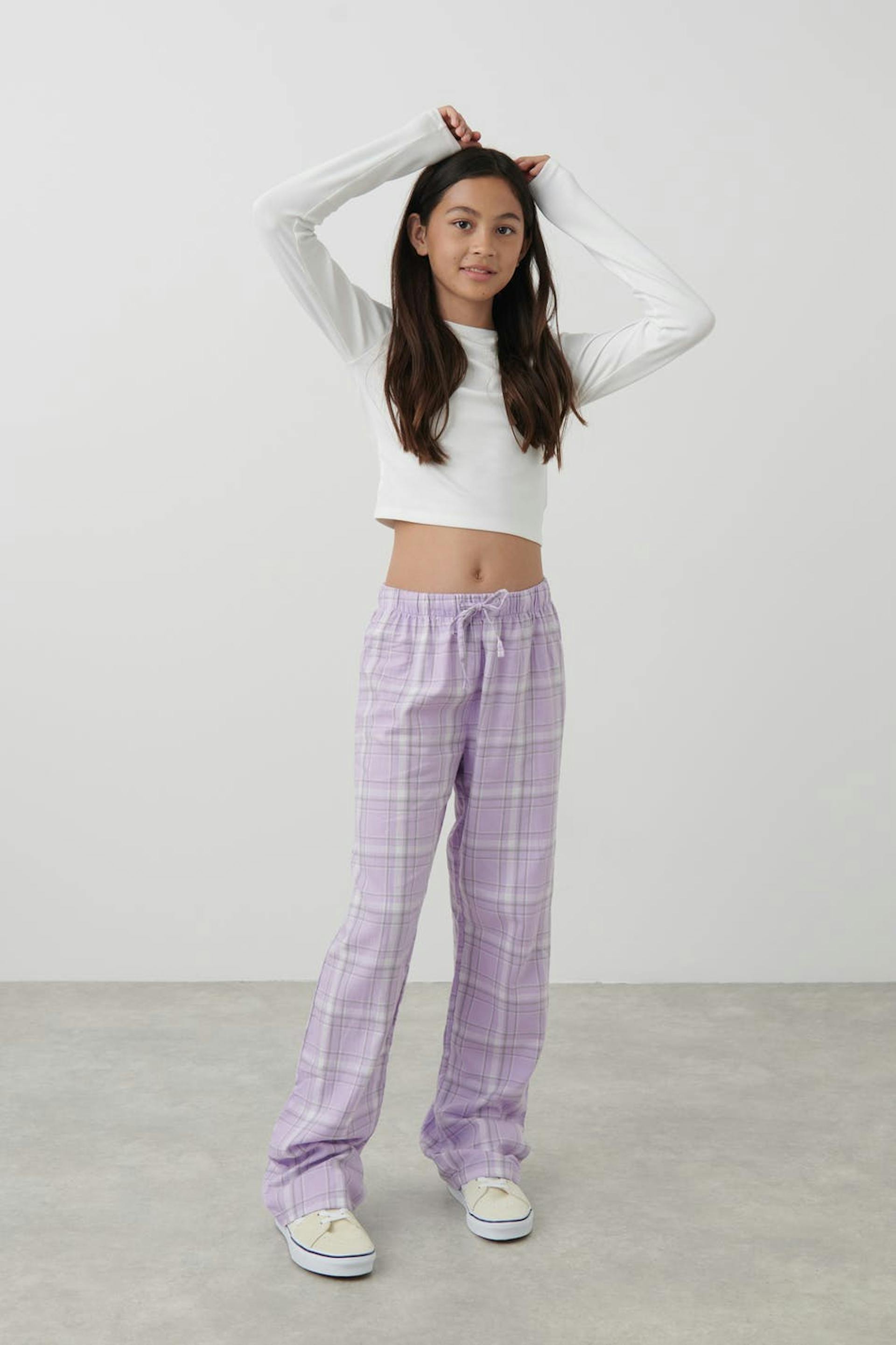 Soft pyjama tracksuit trousers in flannel with wide fit. The pyjama tracksuit trousers are purple and have elastic at the waist with self-tie drawstring at the front.