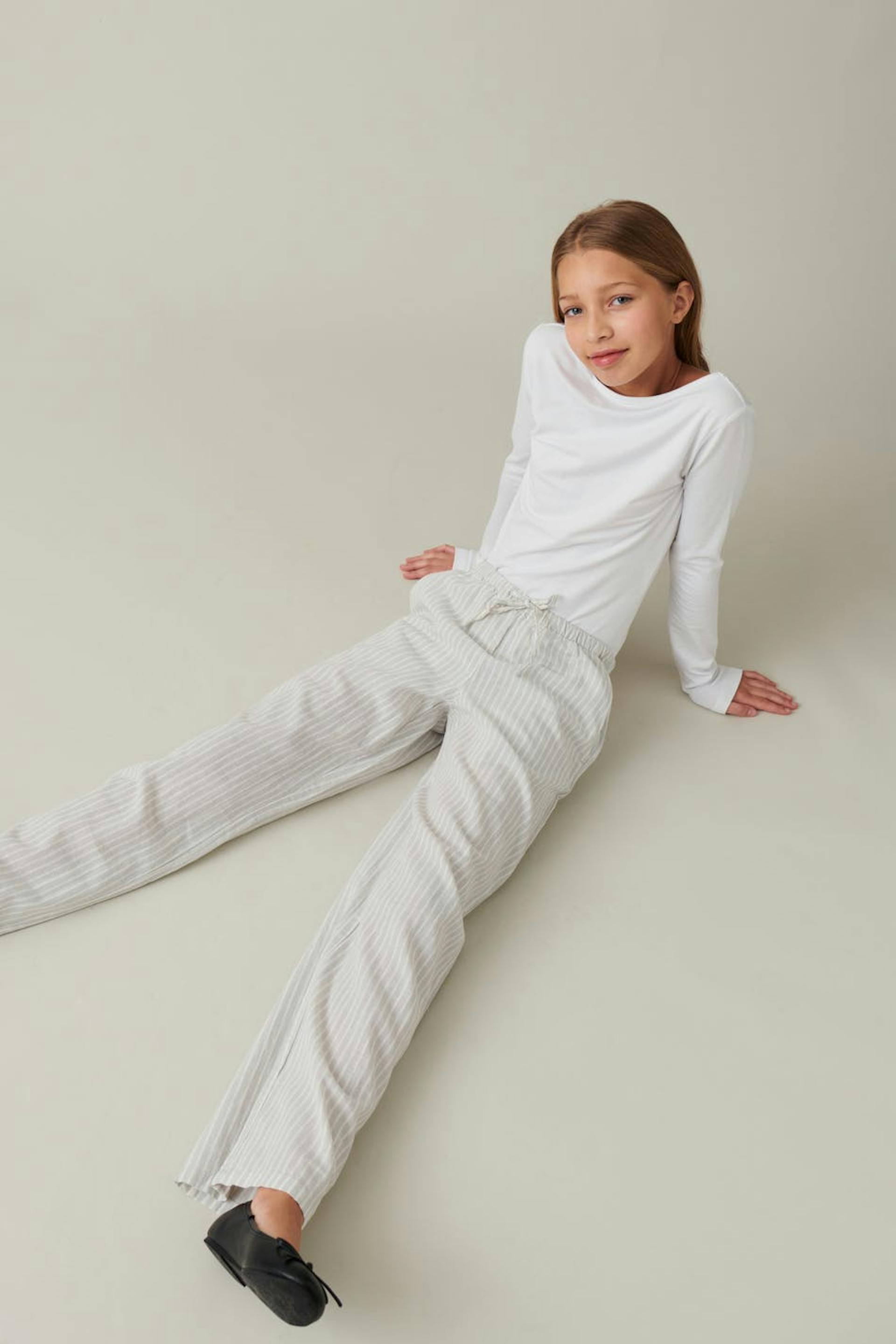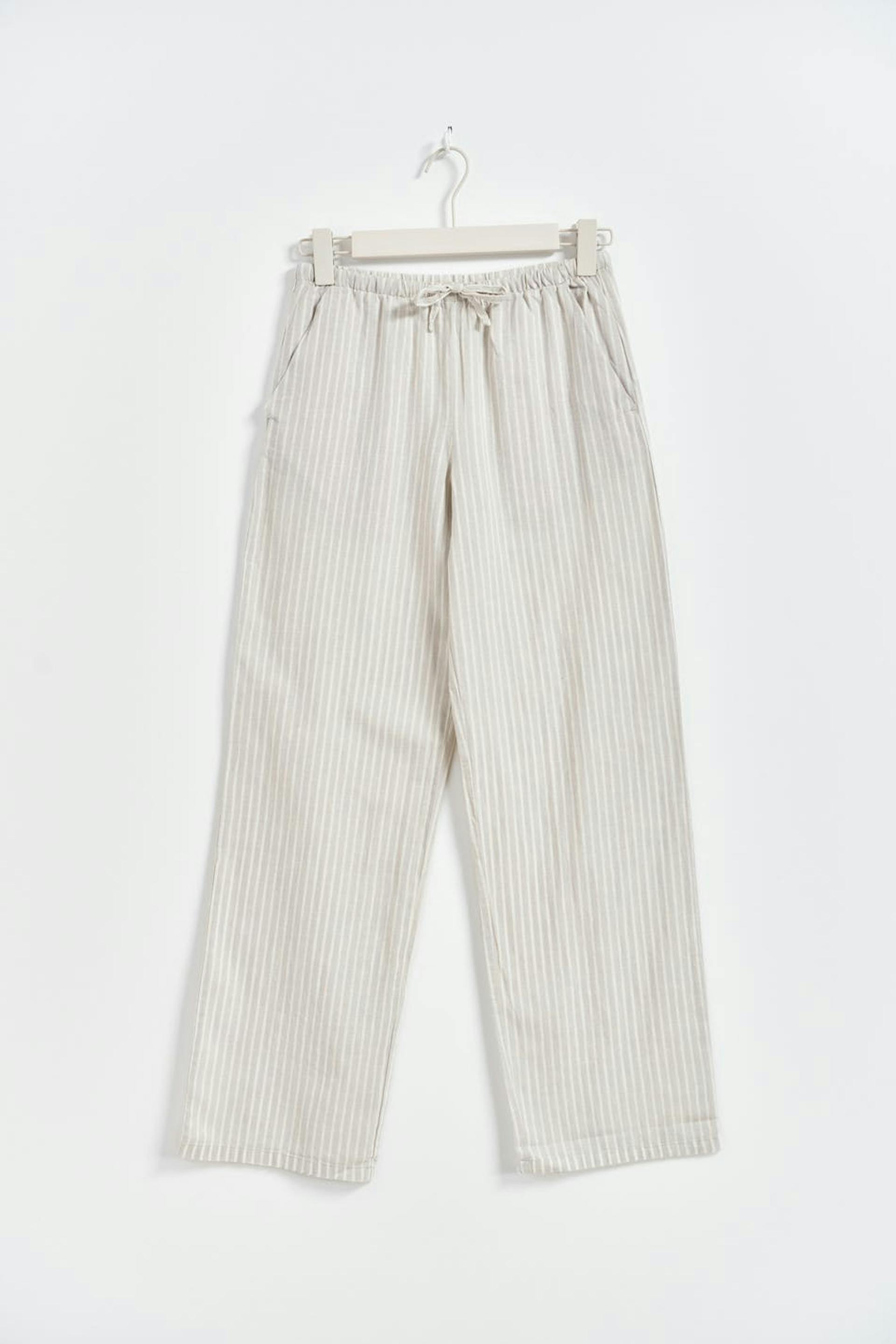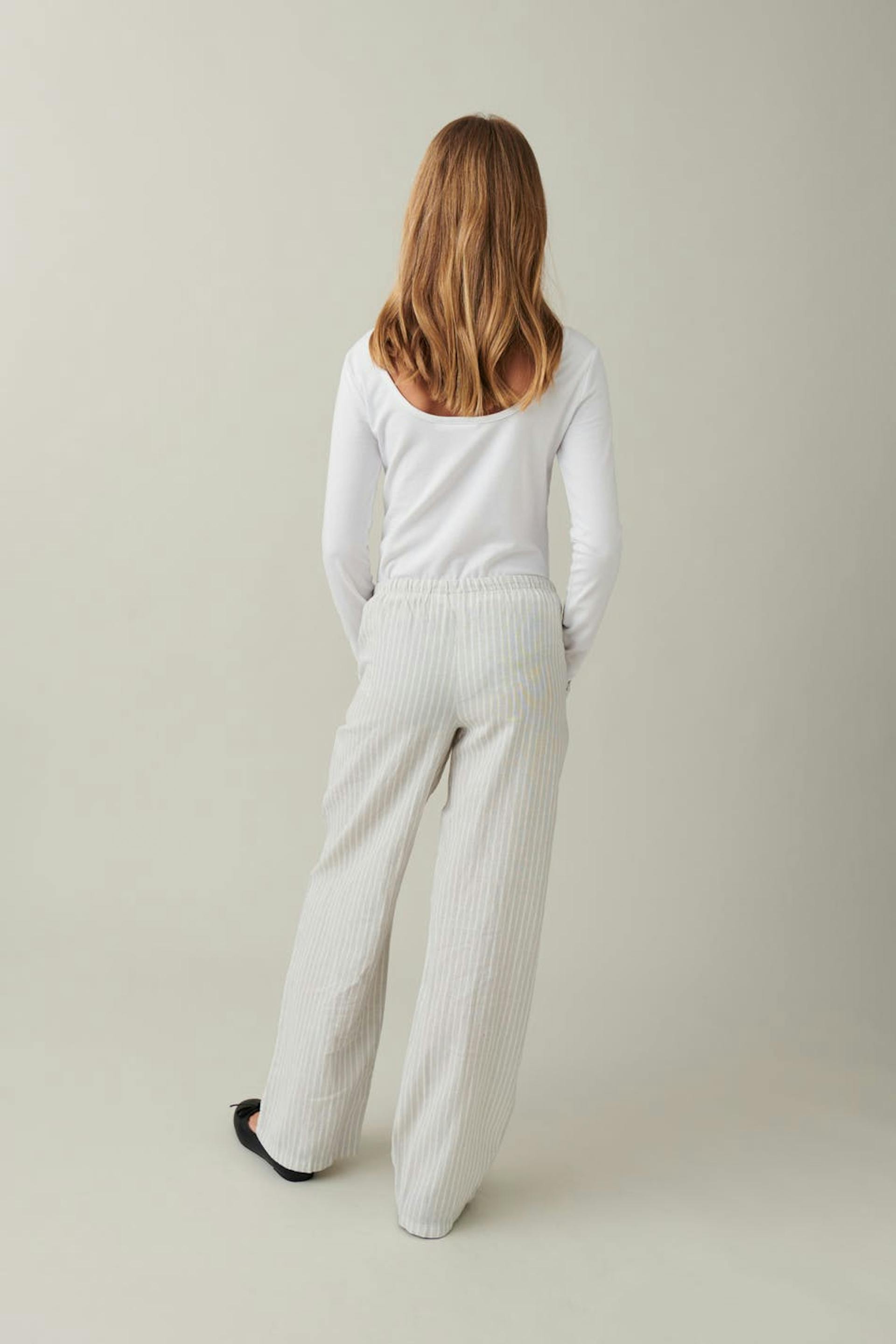 Striped linen trousers by Gina Tricot Young with relaxed fit. The linen trousers are beige and have a soft, woven quality. They have wide legs, side pockets and elastic at the waist with self-tie at the front.