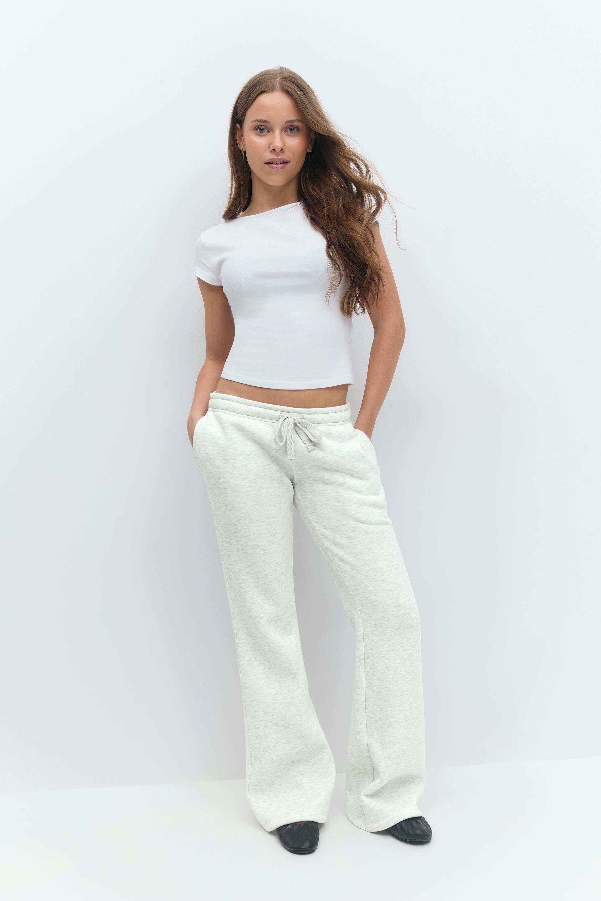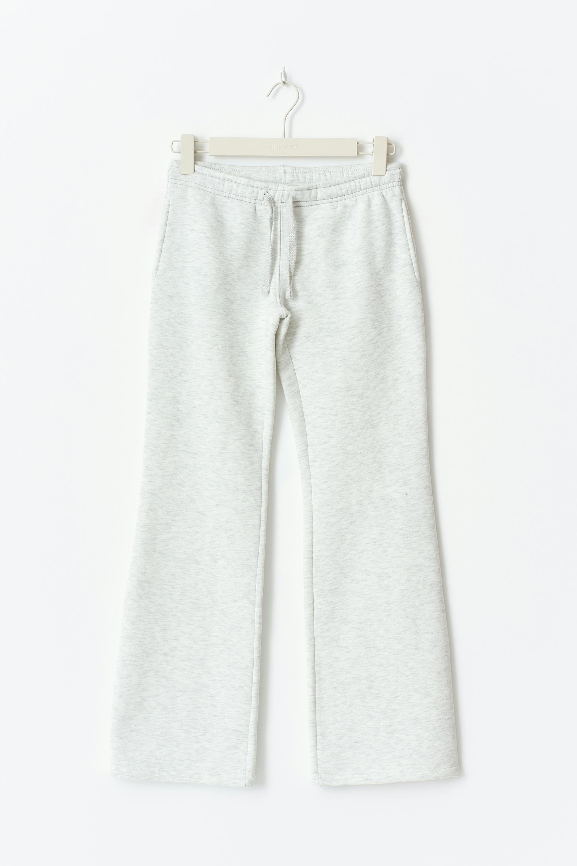 Tracksuit trousers with a low waist. The trousers are grey and have a normal fit. They have pockets in the sides and at the back, stitch pattern at the back, wide legs, an elastic at the waist, a tie band at the front and a normal length.