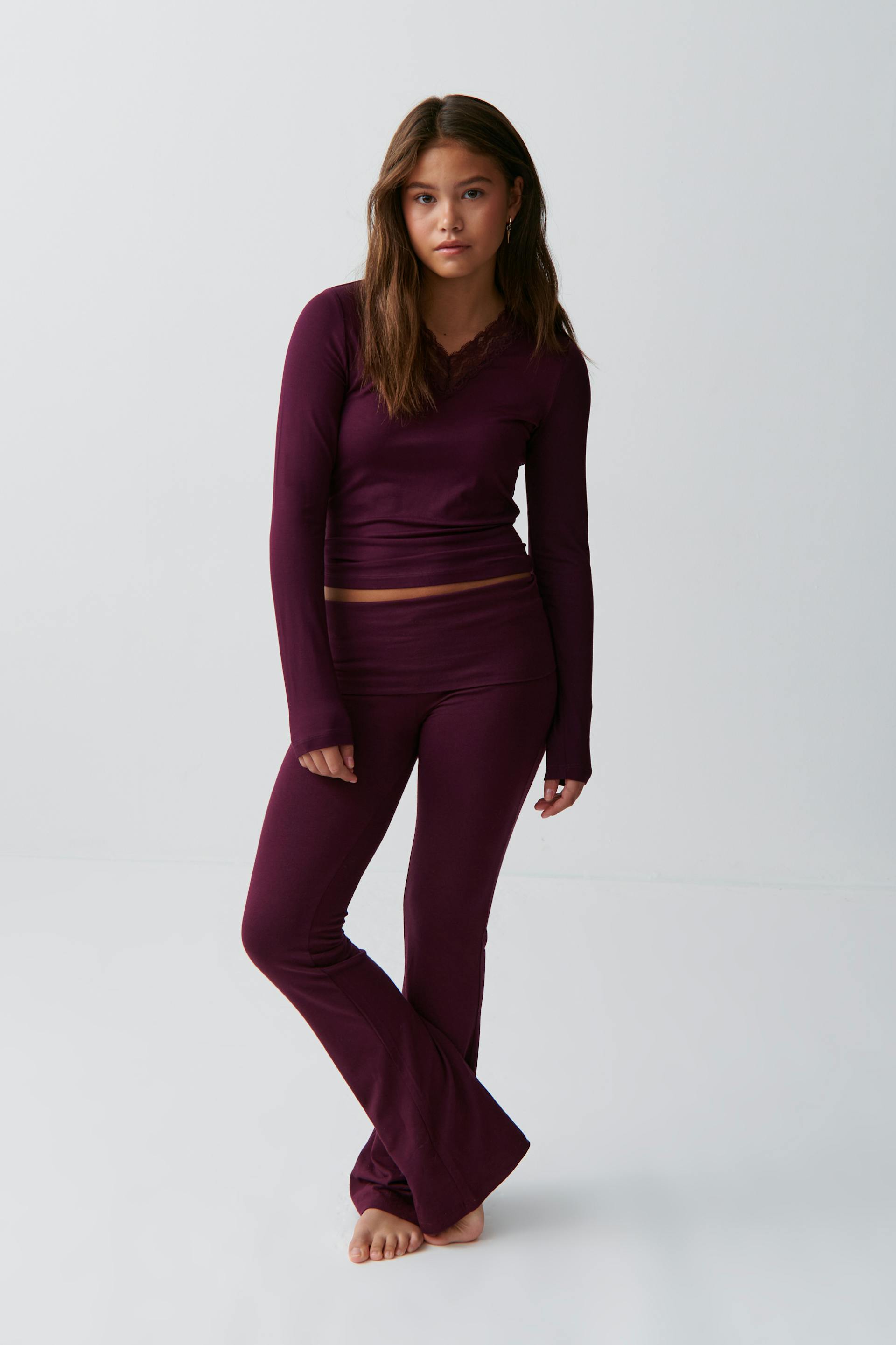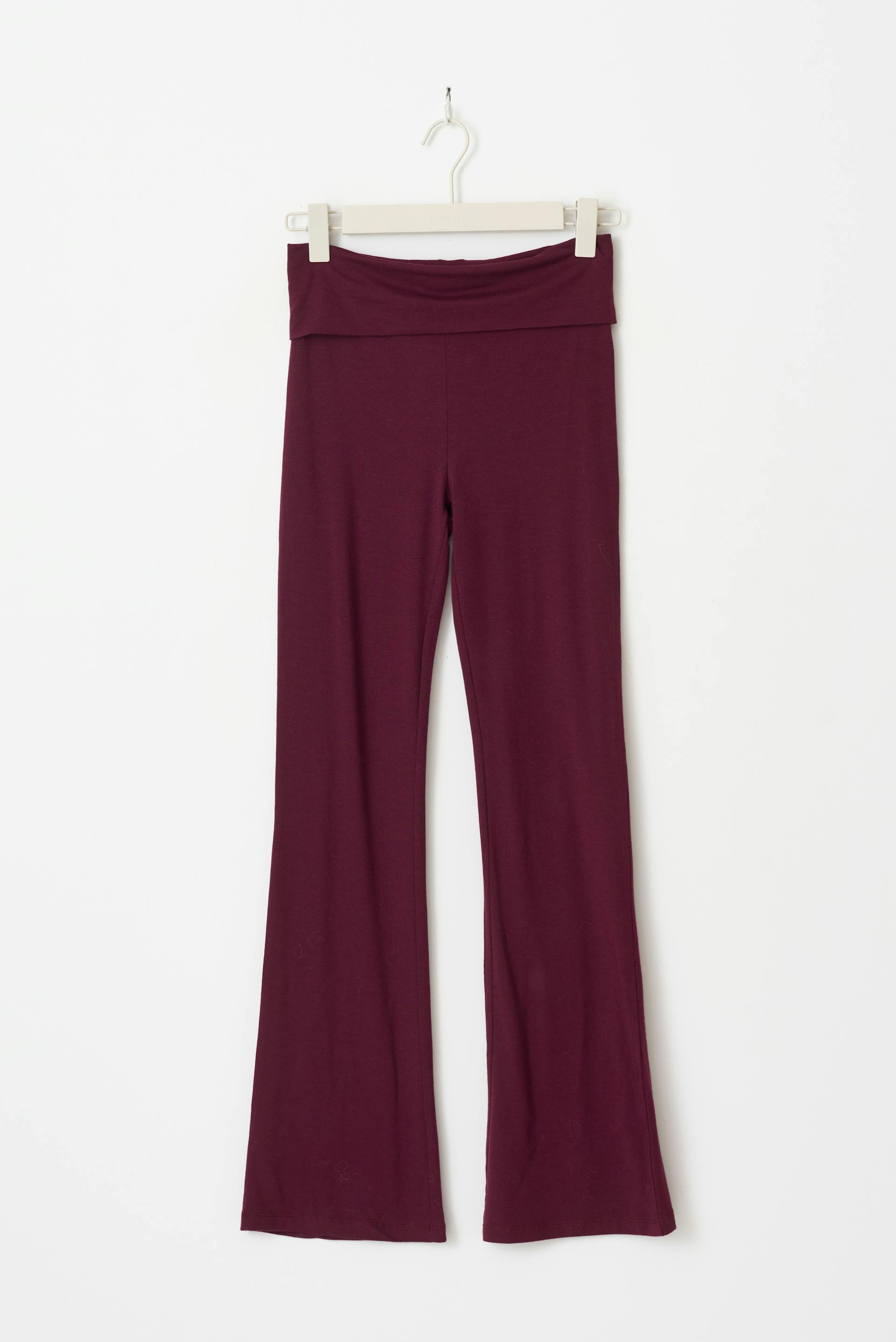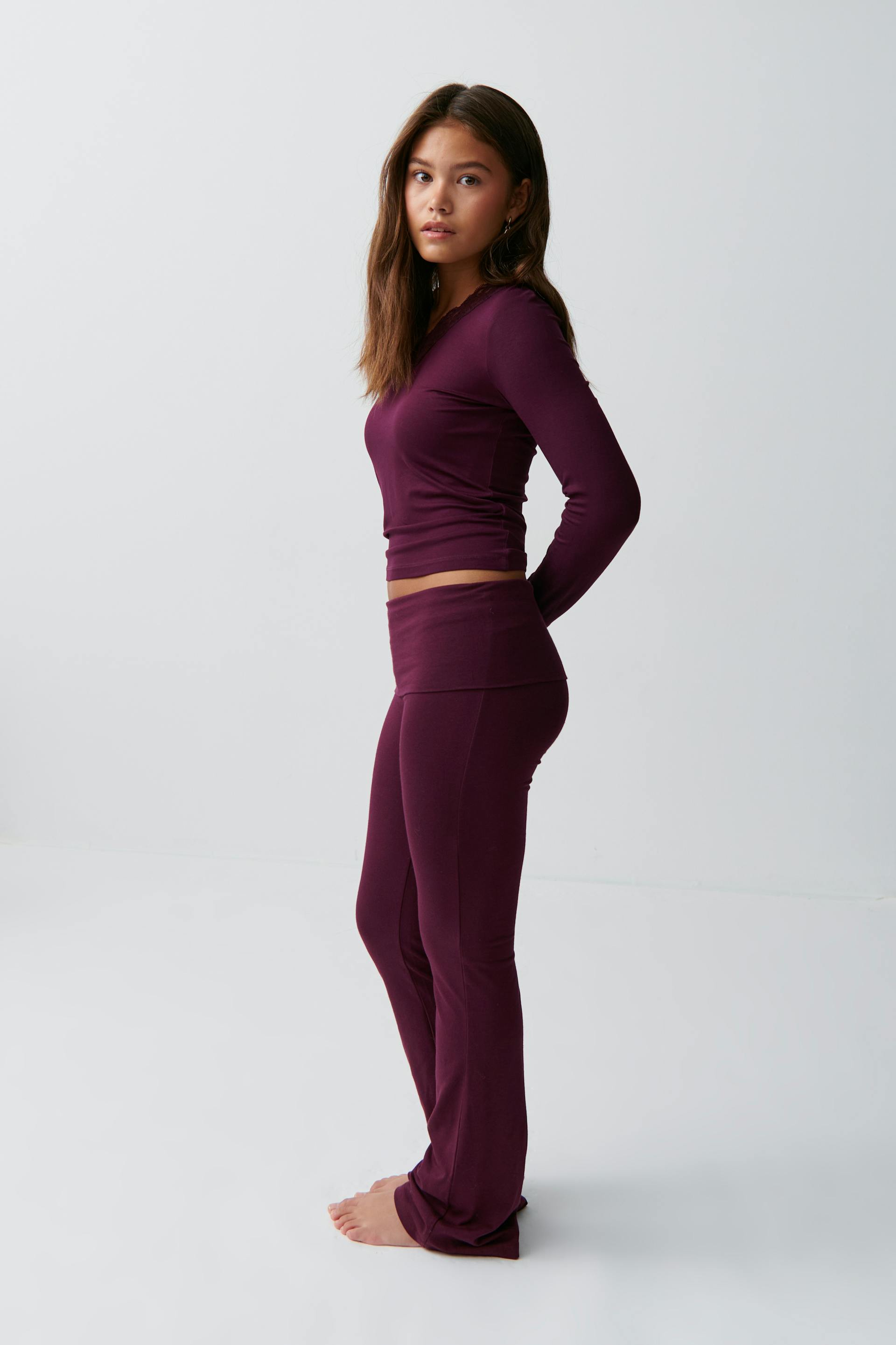 Yoga pants in jersey with low waist. The trousers are wine and have super soft quality. They have flared legs and turn-down waistband.