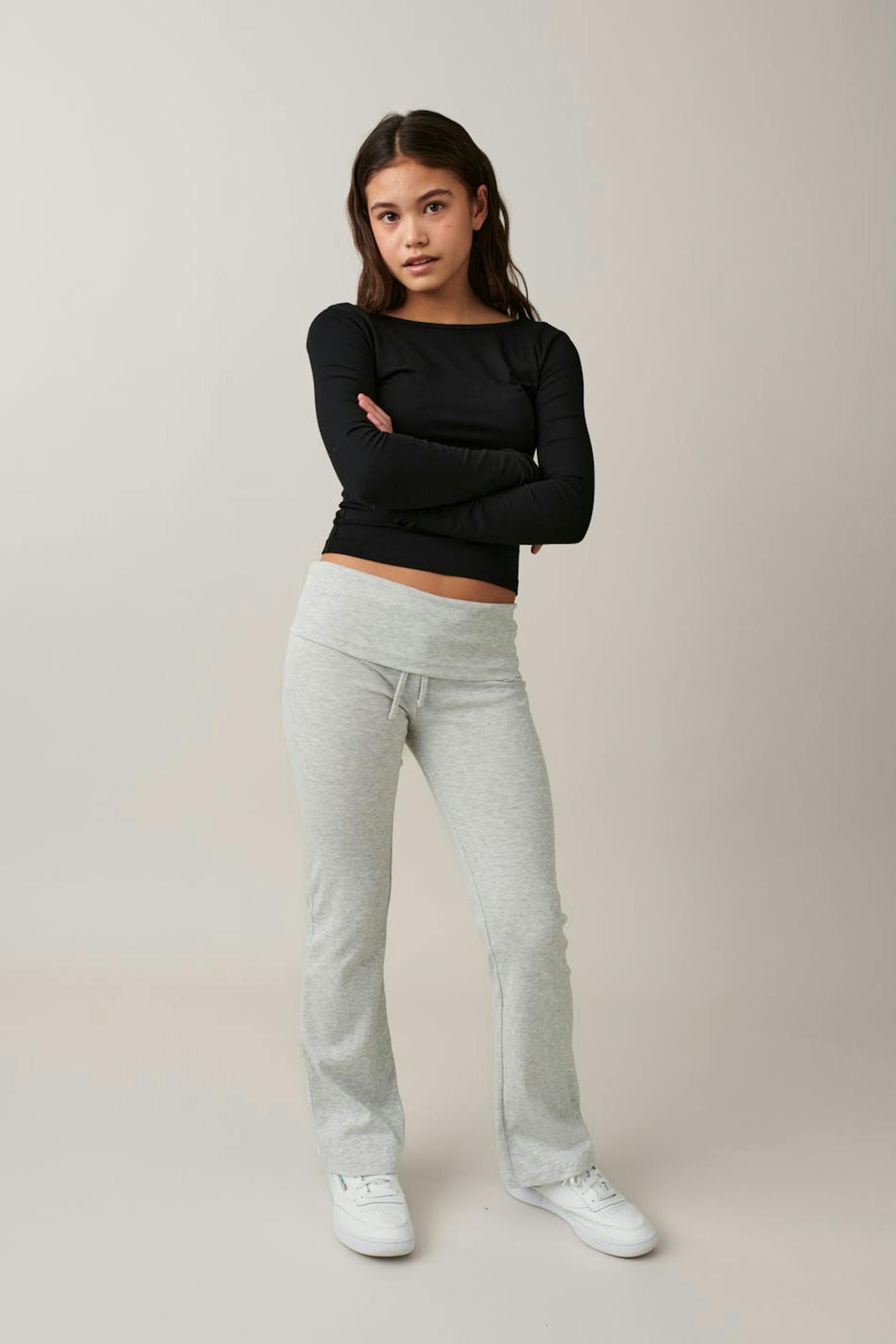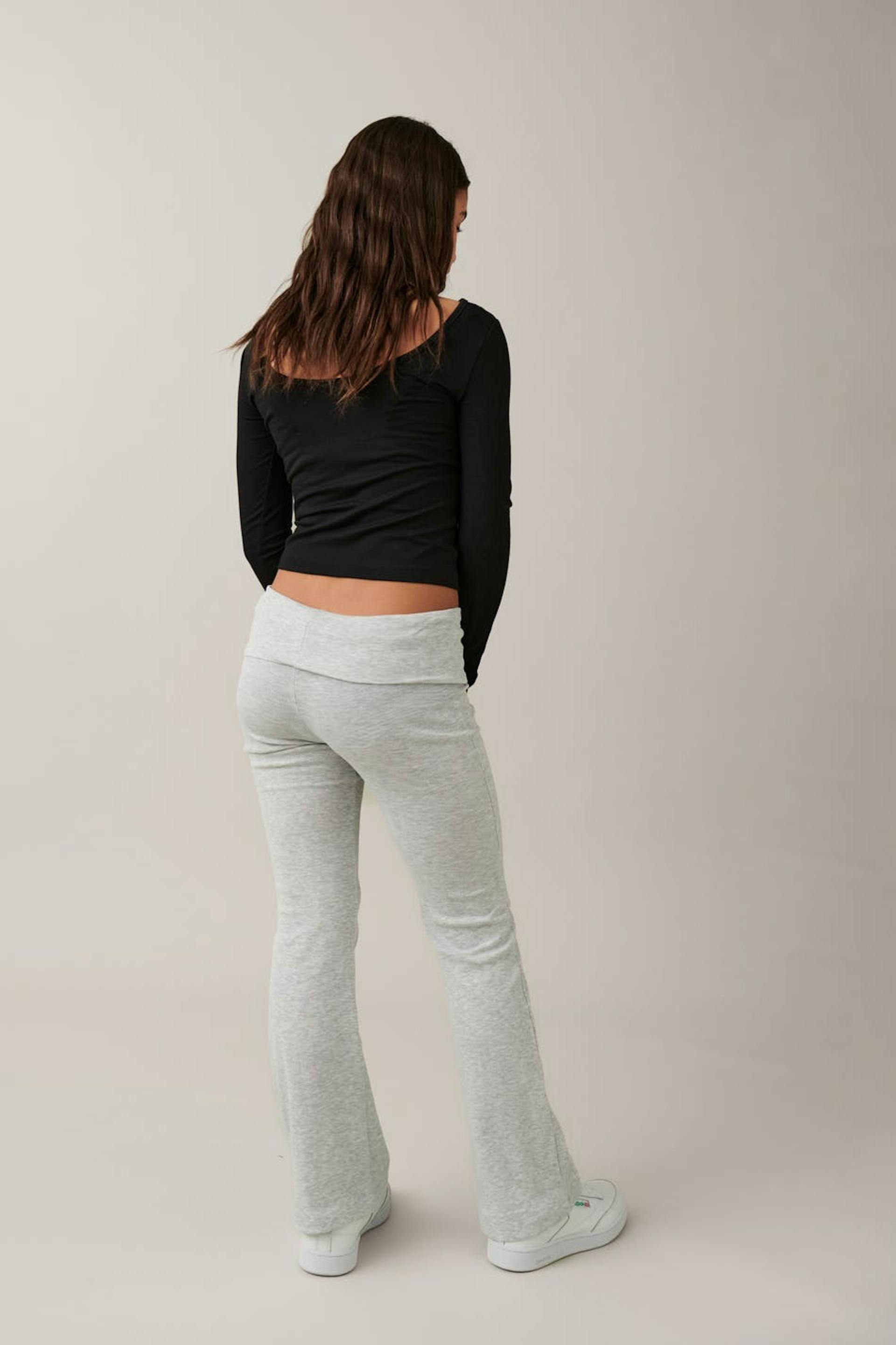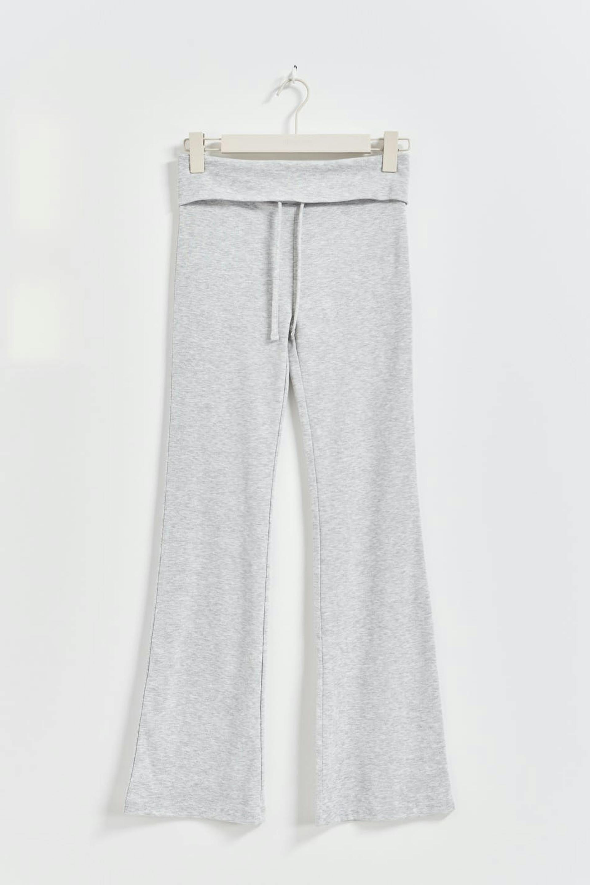 Flared tracksuit trousers in jersey with turn-down waistband. The trousers are grey and have low waist.