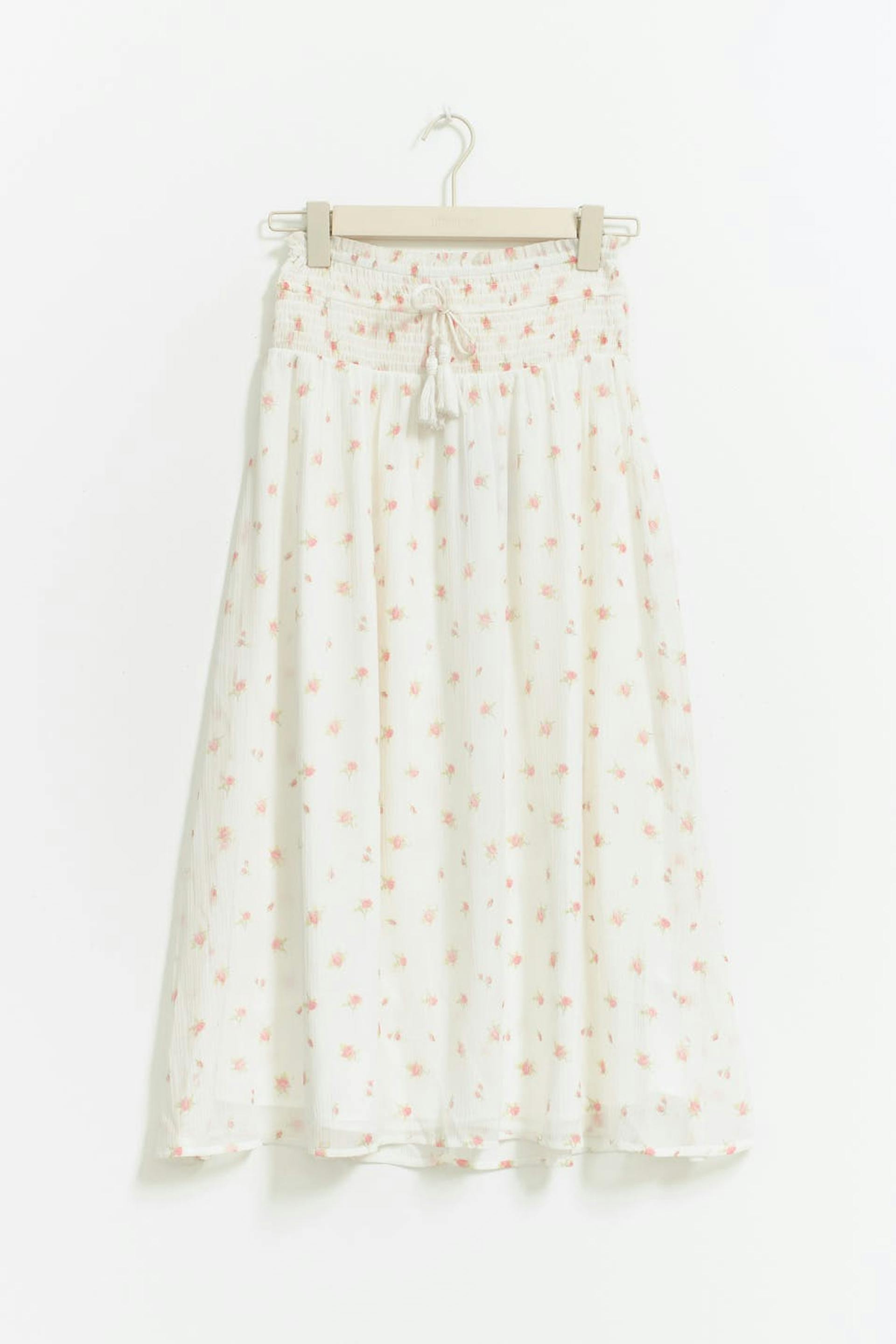 Floral maxi skirt with smocking at the waist. The skirt is pink and has self-tie at the front.