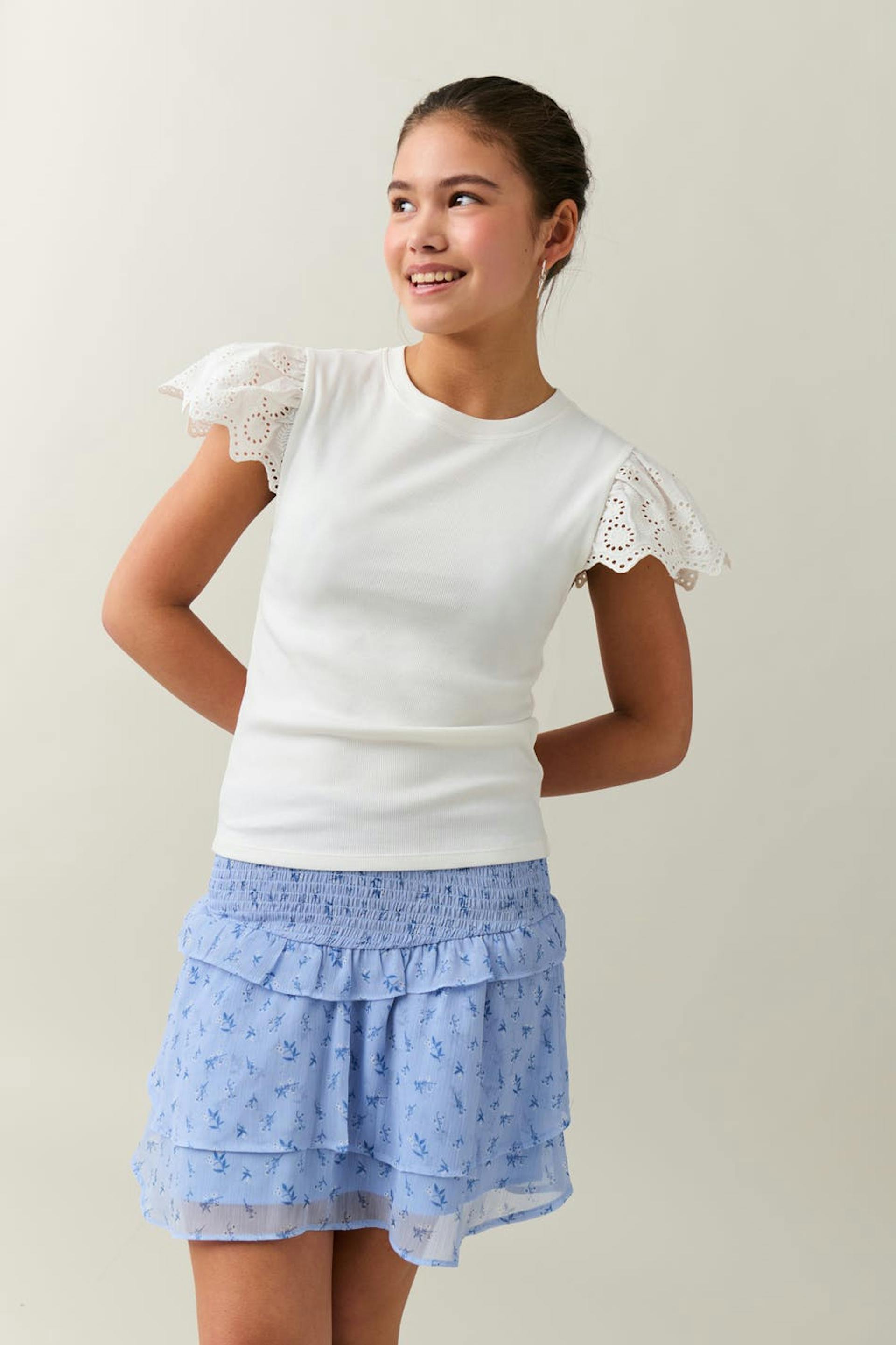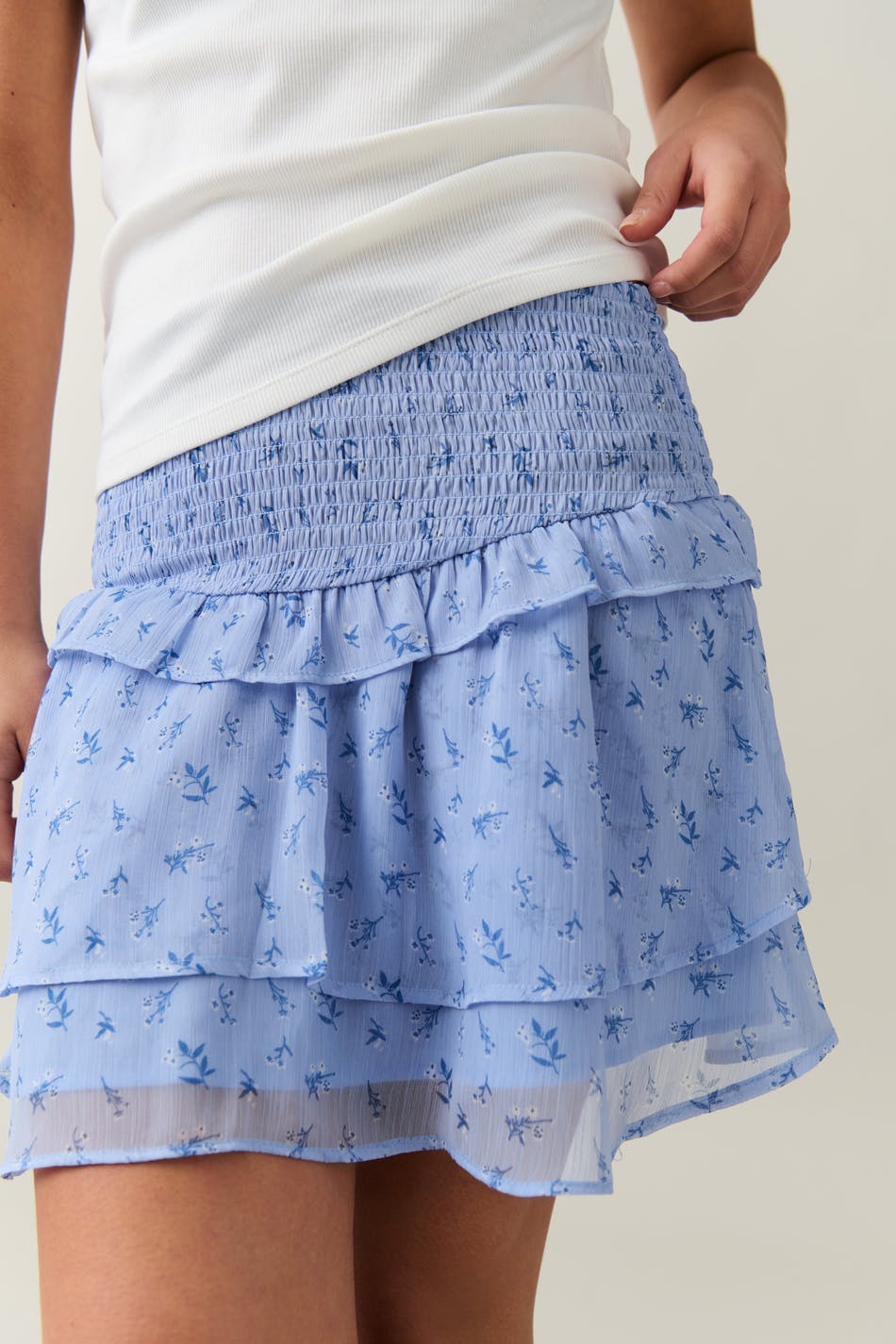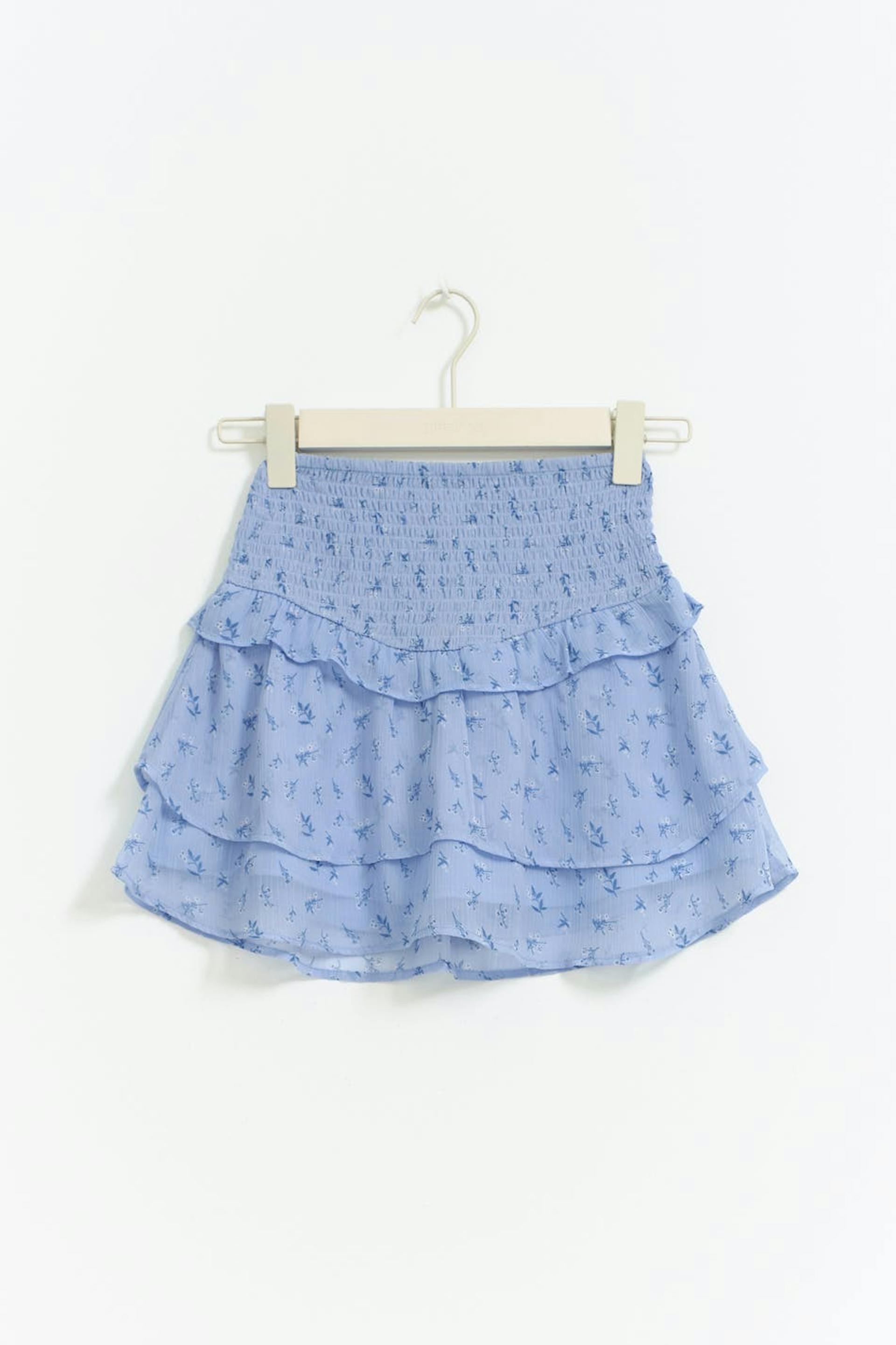 Floral frill skirt with smocked waist. The skirt is blue and short and has regular fit.