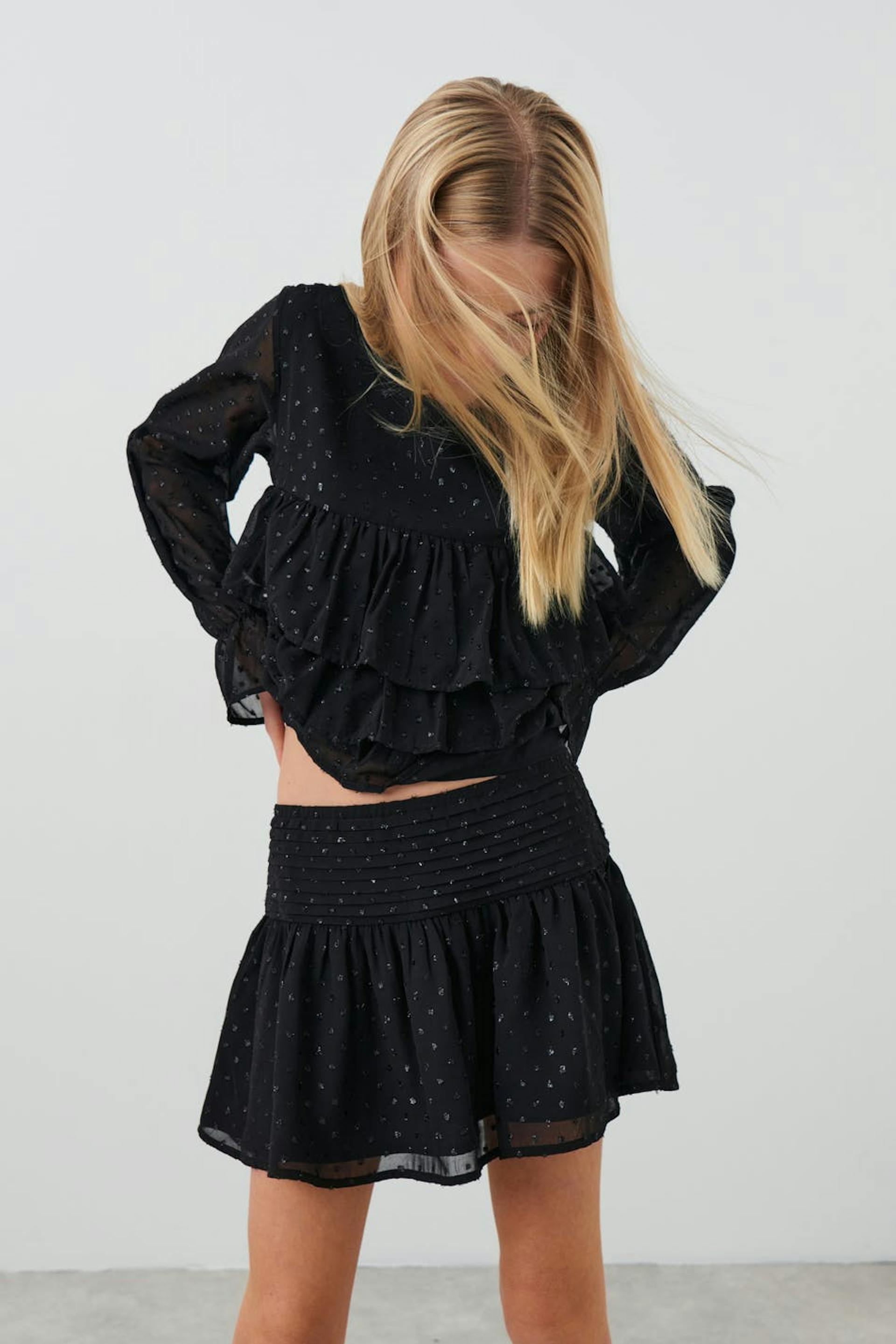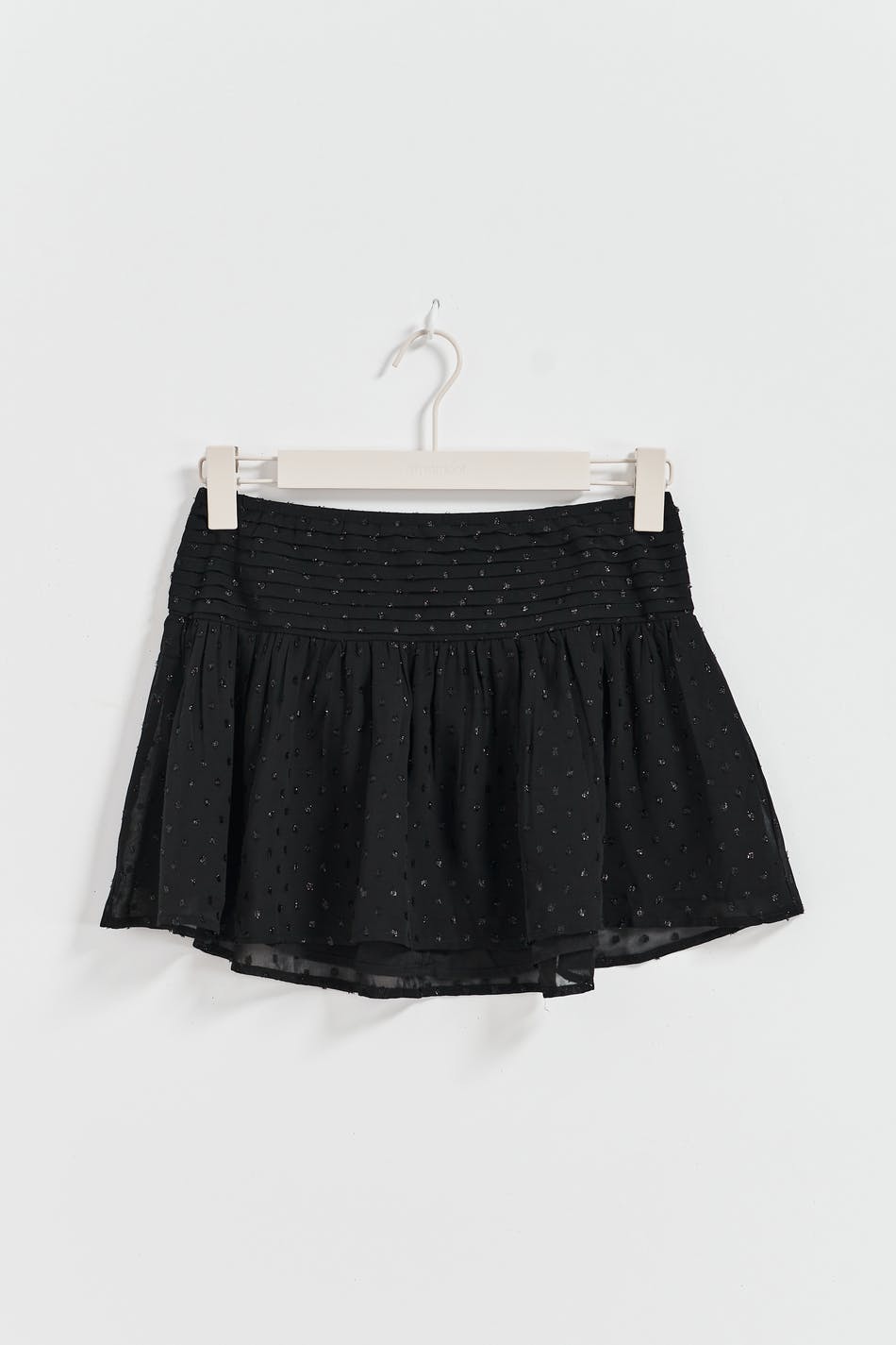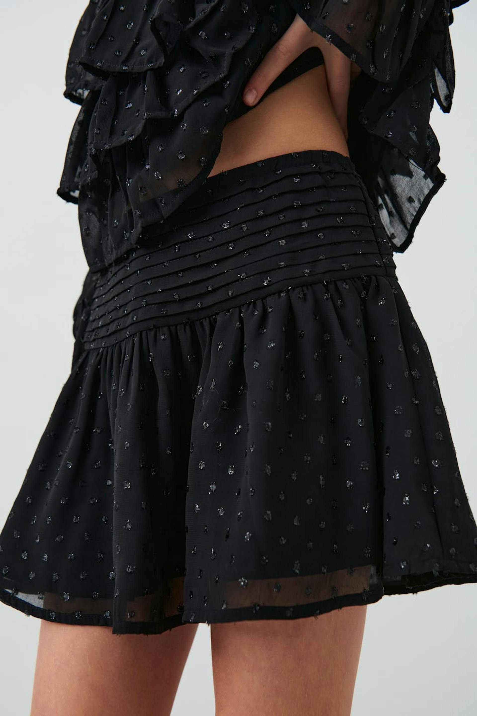Short frill skirt with structured material. The skirt is black and has pleat details at the waistband.