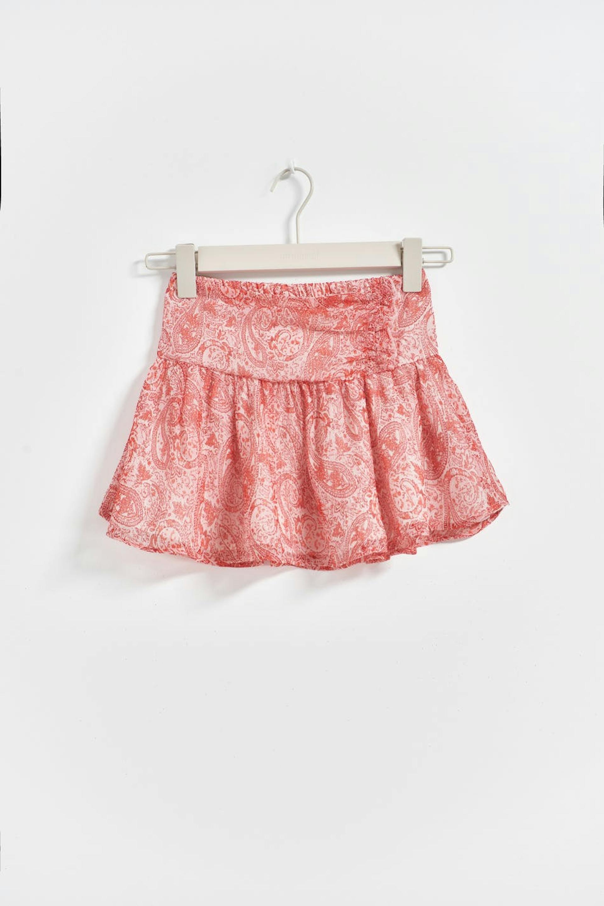Patterned skirt with low waist. The skirt is red, short and fully lined. It has ruching at waist and elastic at the back.