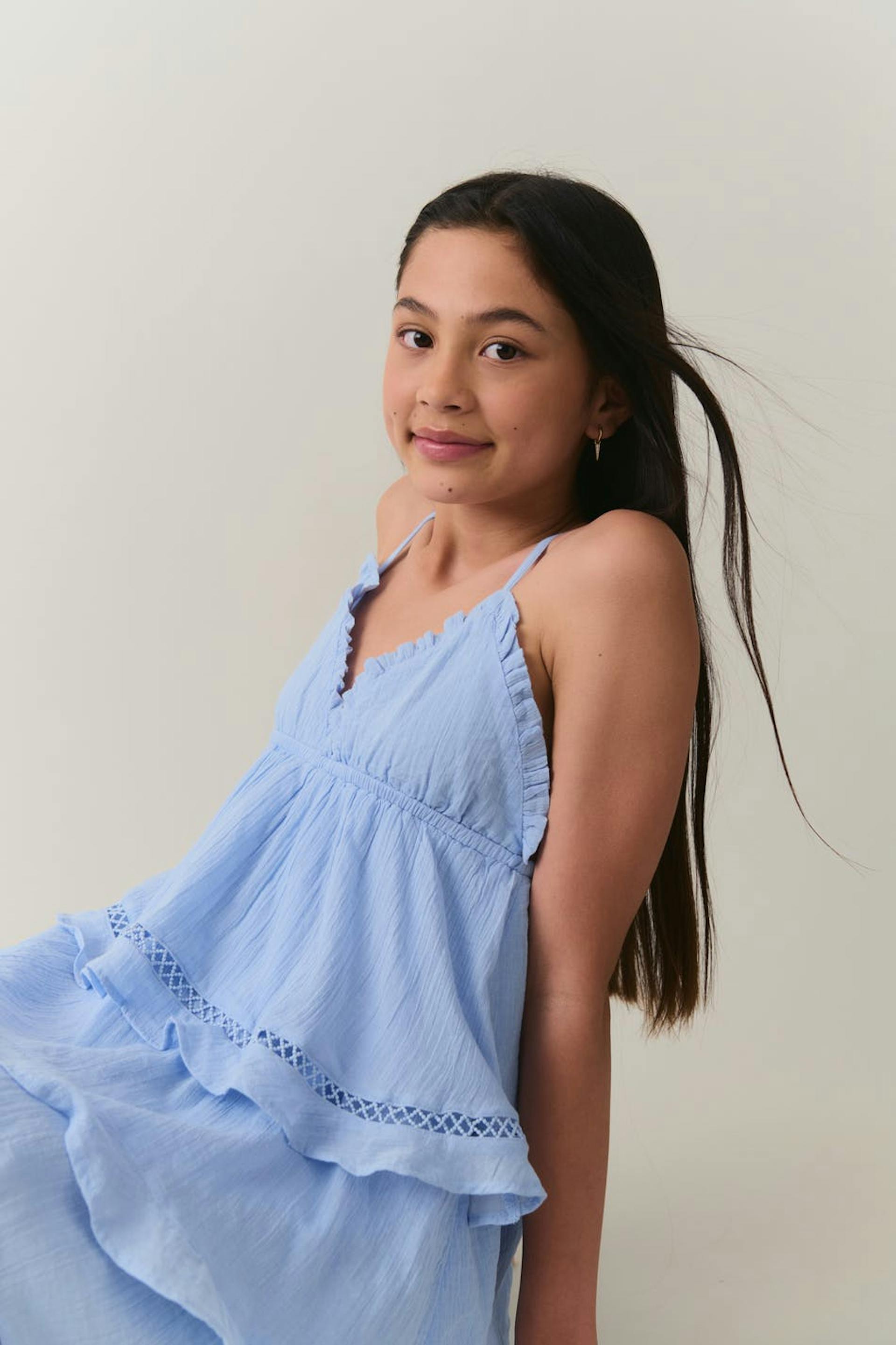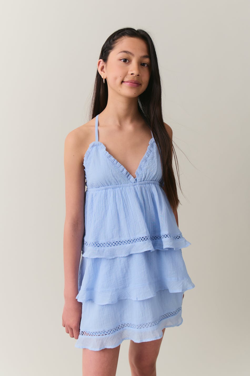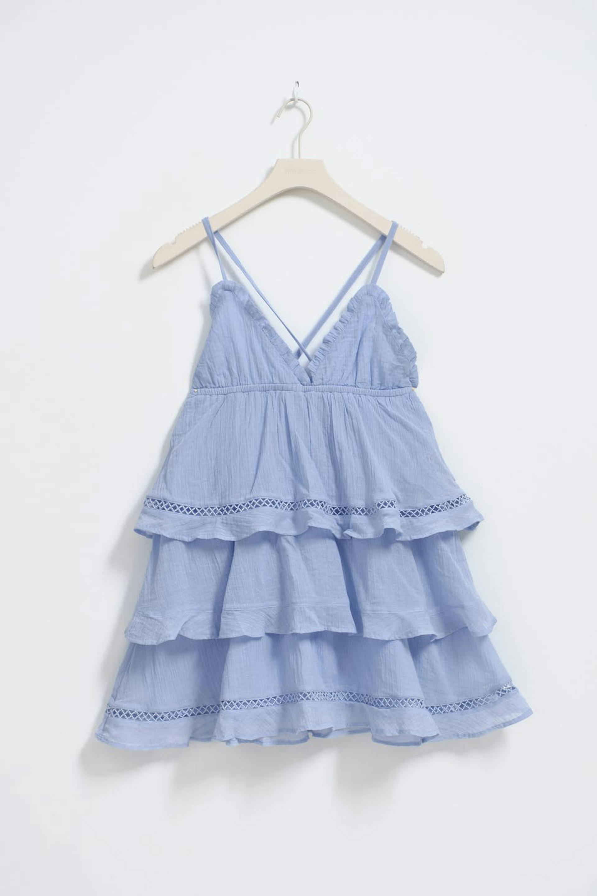 Sleeveless dress by Gina Tricot Young with flounces at the bottom and around the neckline. The dress is short, lined and blue. It has regular fit, v neckline, structured material with lace details and thin shoulder straps crossing at the back.