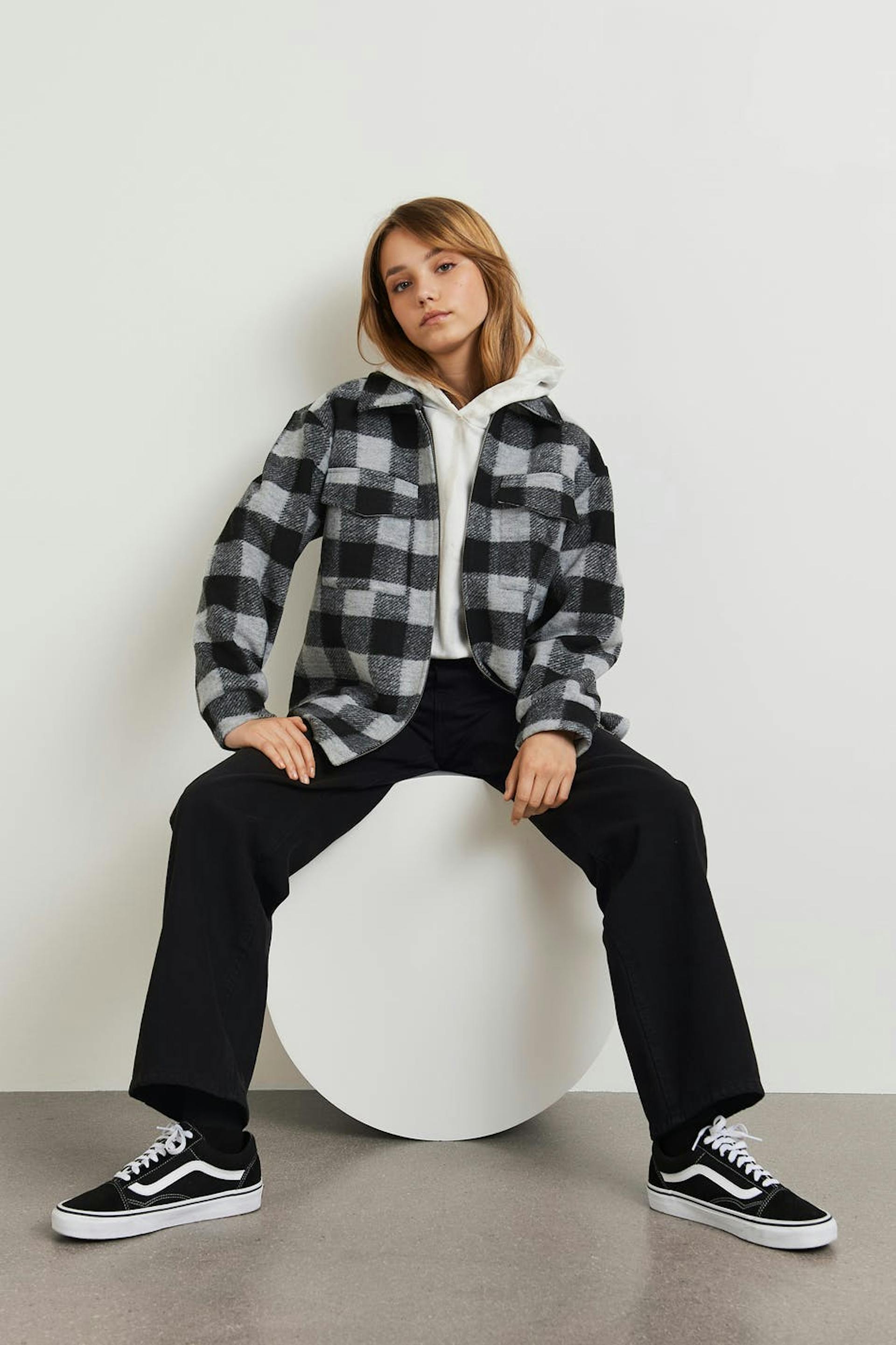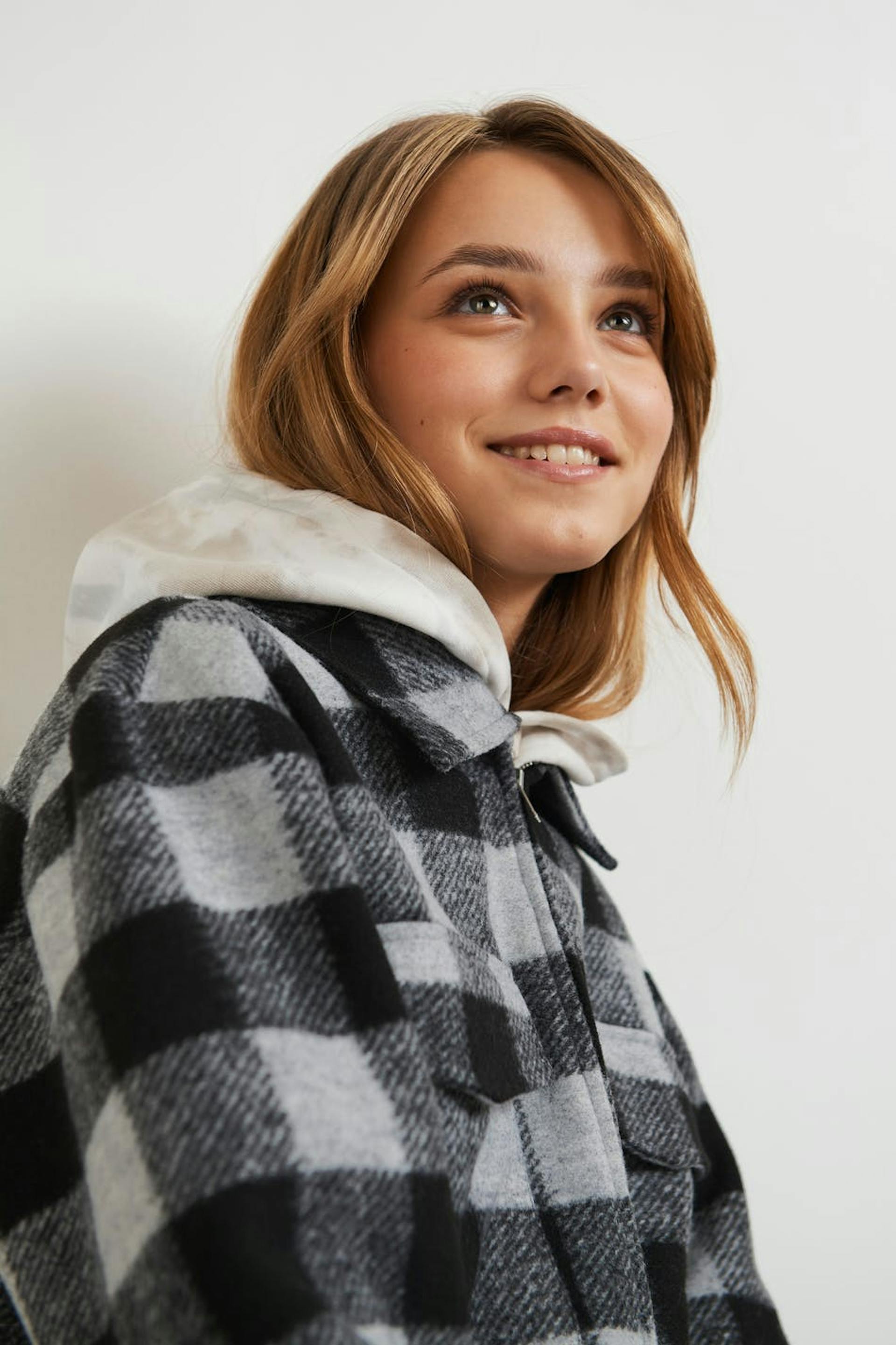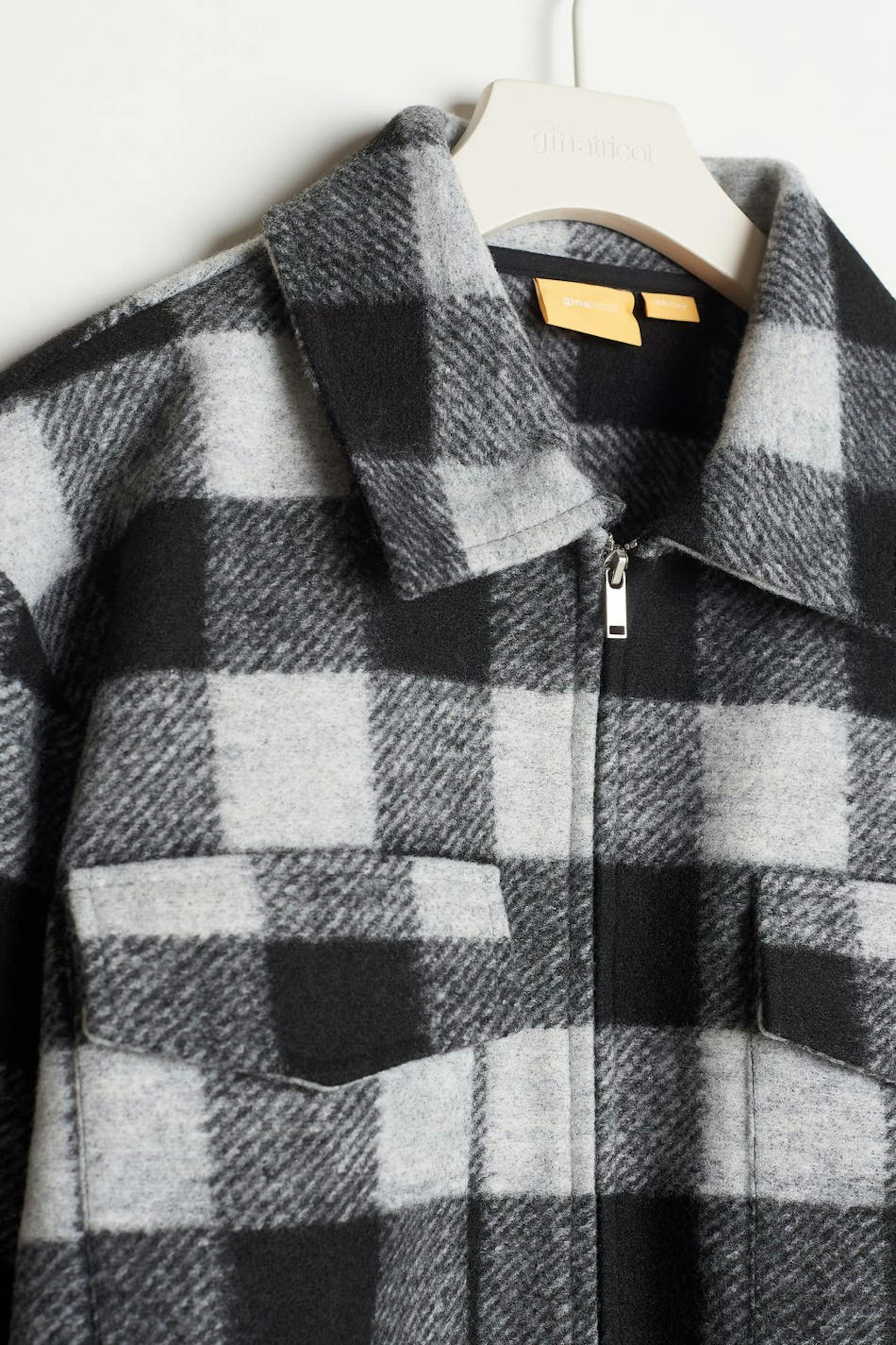 Chequered shacket by our Young assortment with a collar. The shirt jacket is grey and has two chest pockets at the front. It has a zip closure.