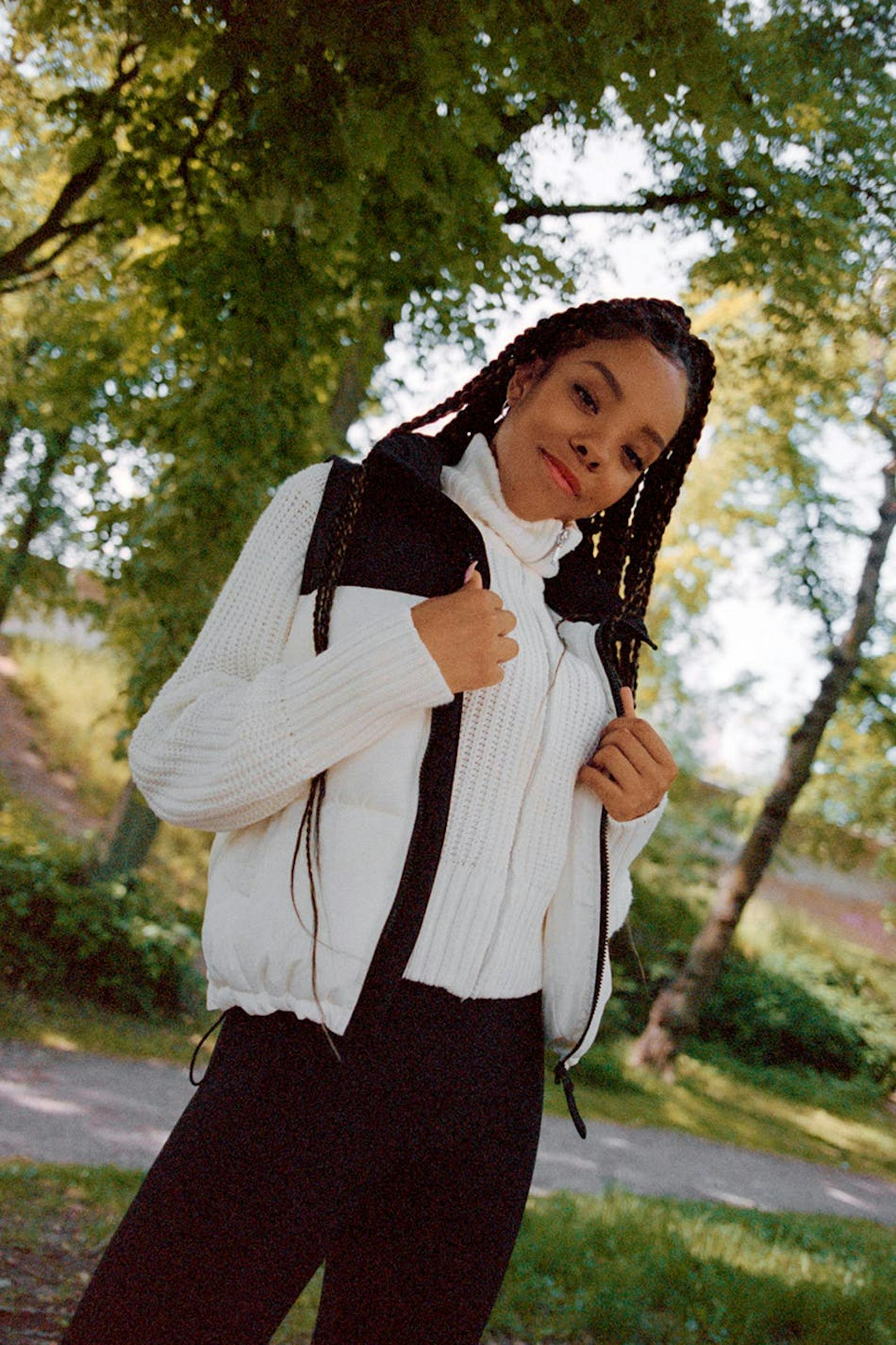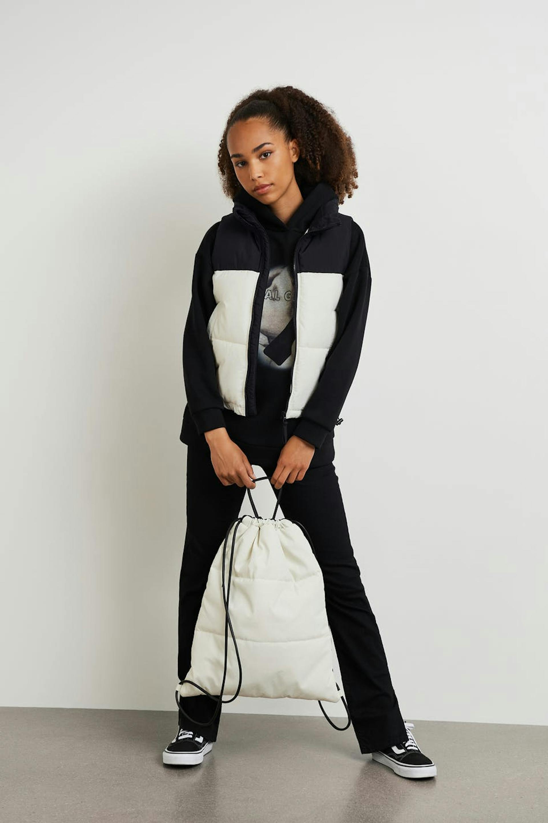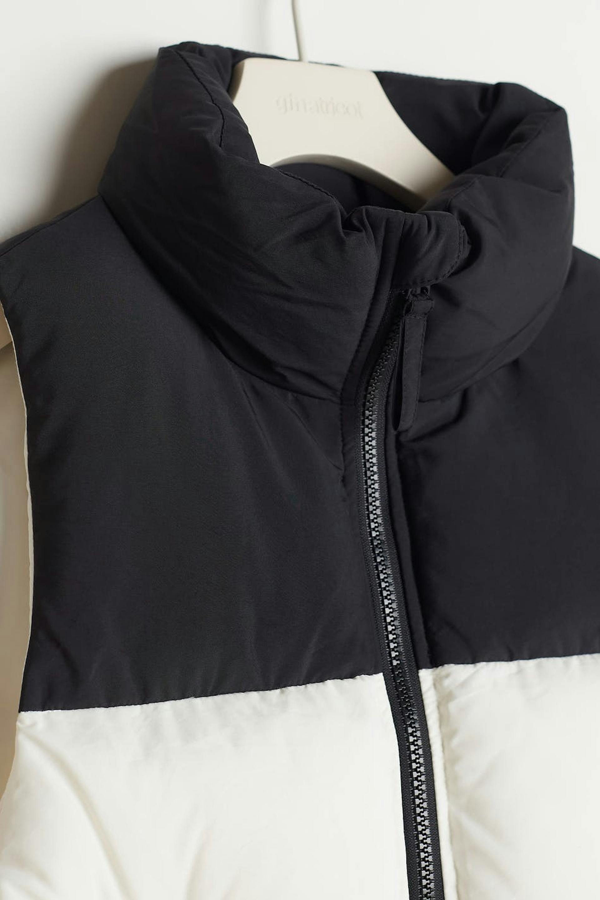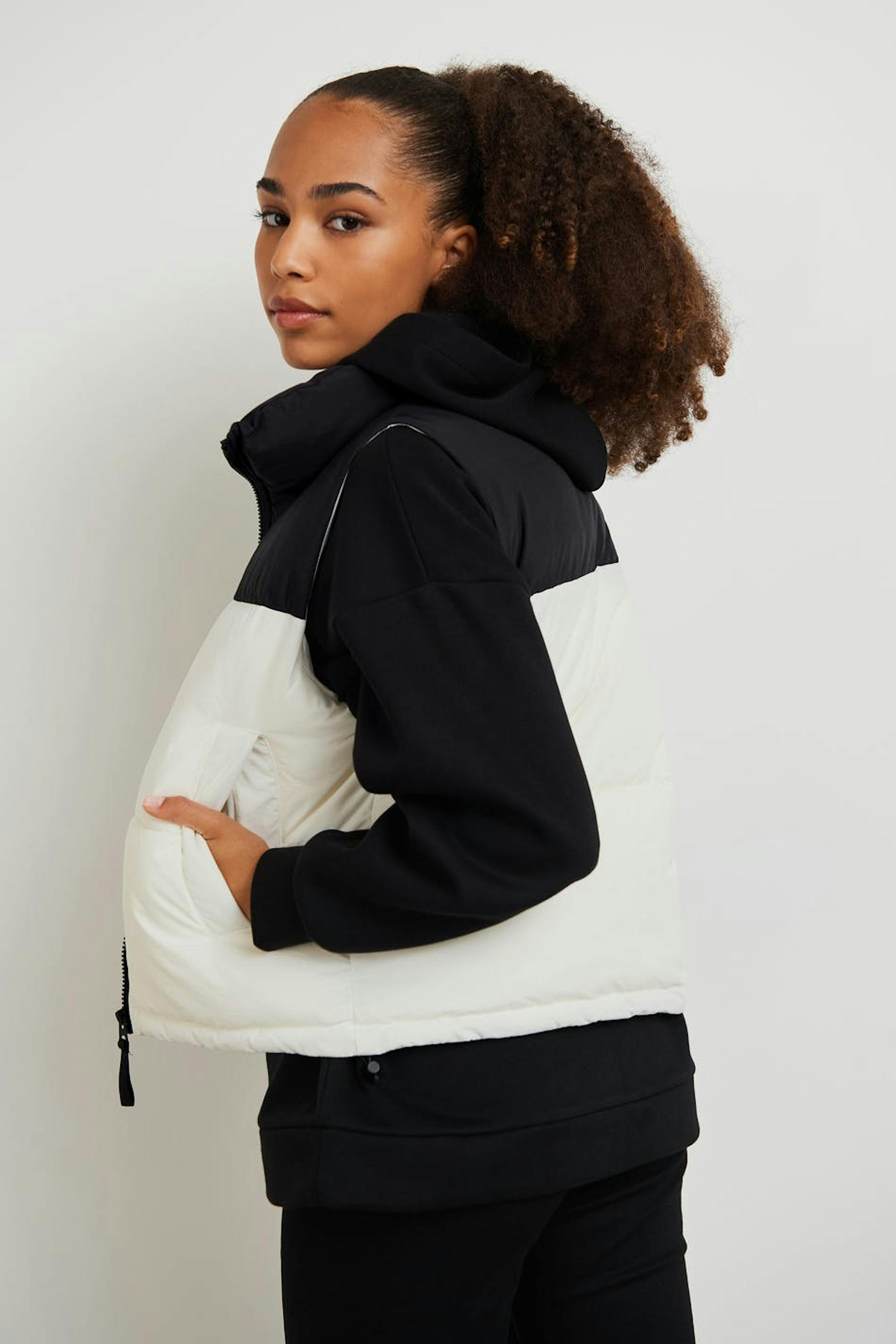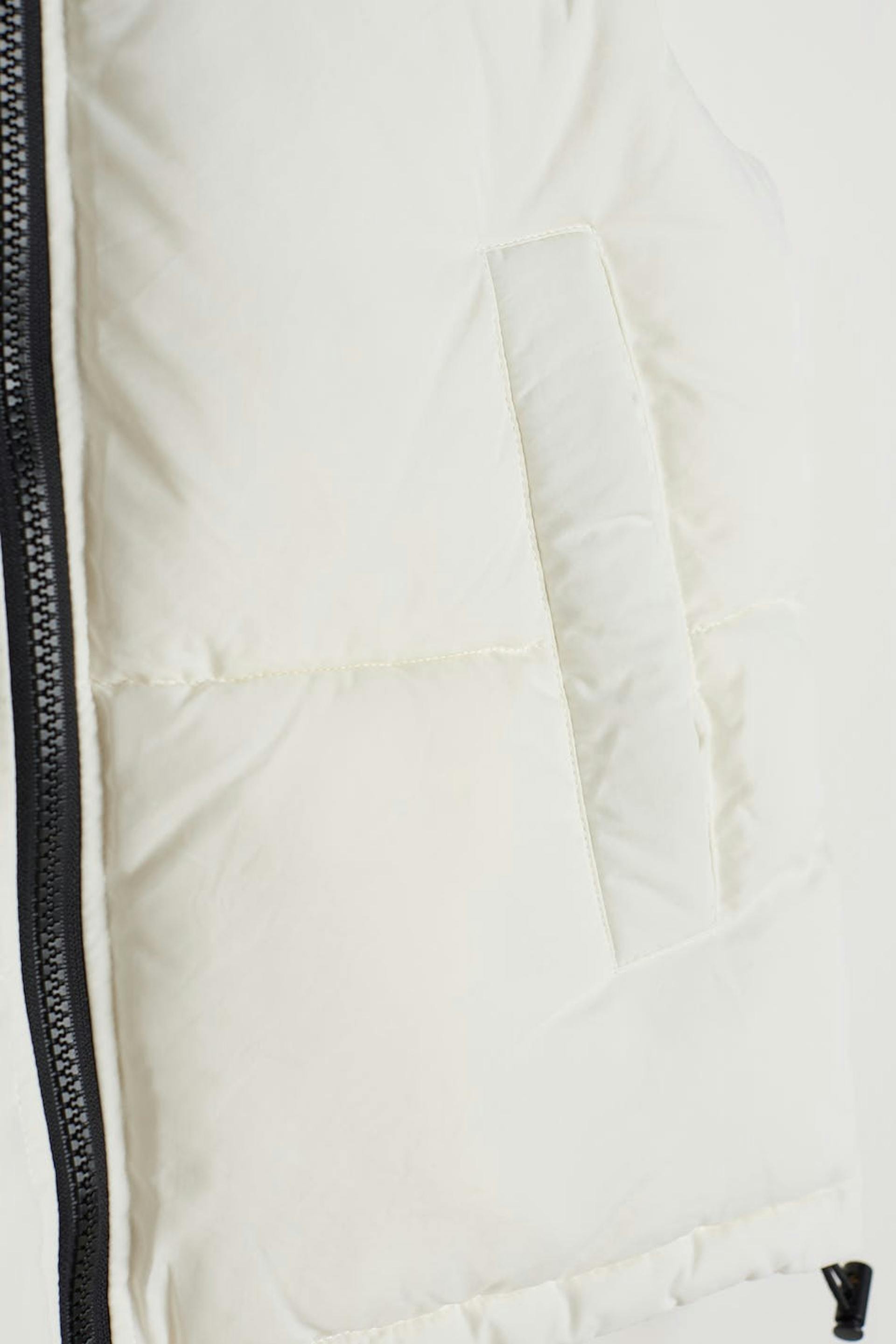 Puffer waistcoat by our Young assortment with a high collar. The waistcoat is white and has side pockets with snap buttons. It has a zip at the front and an adjustable drawstring at hem.