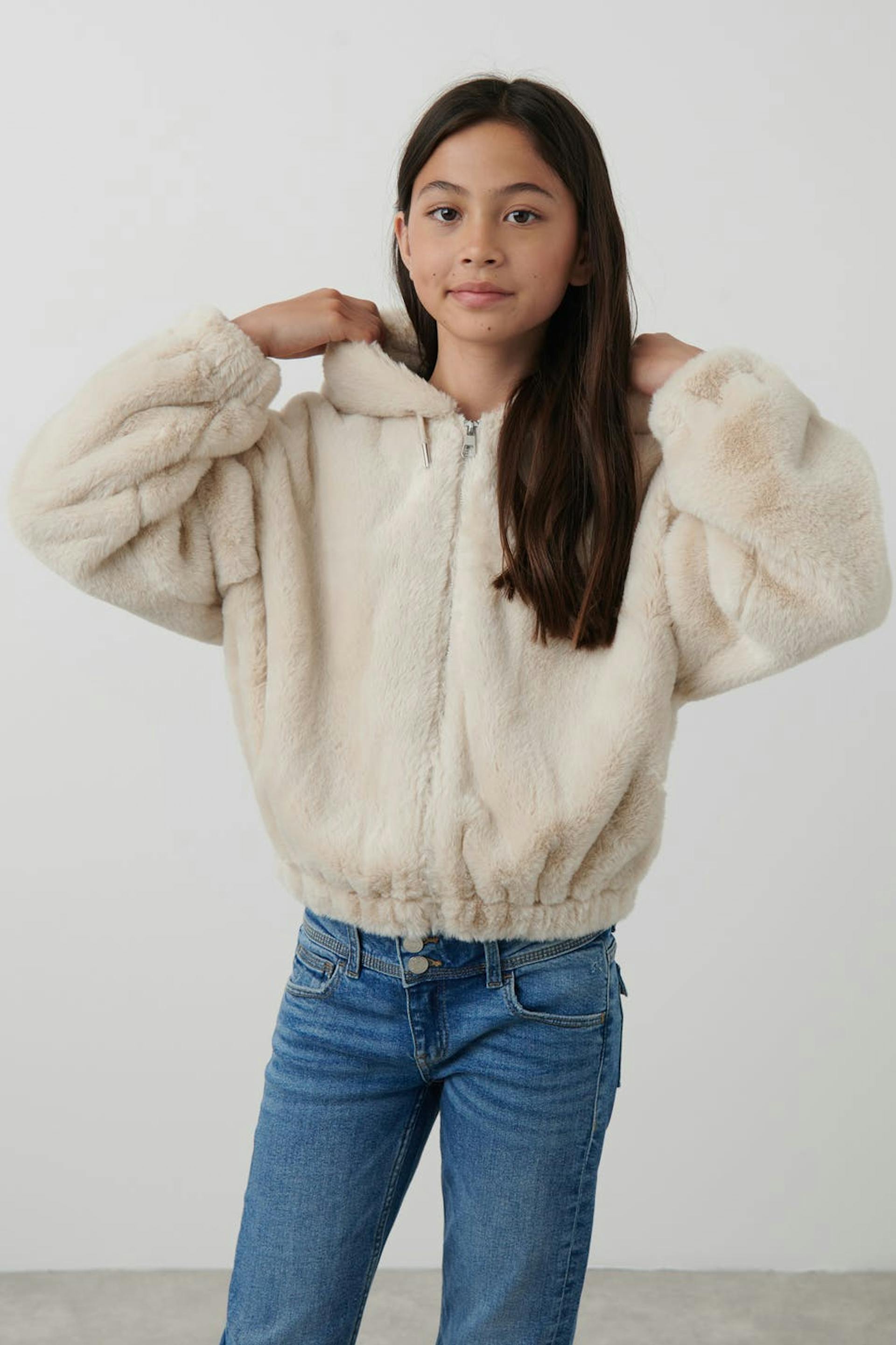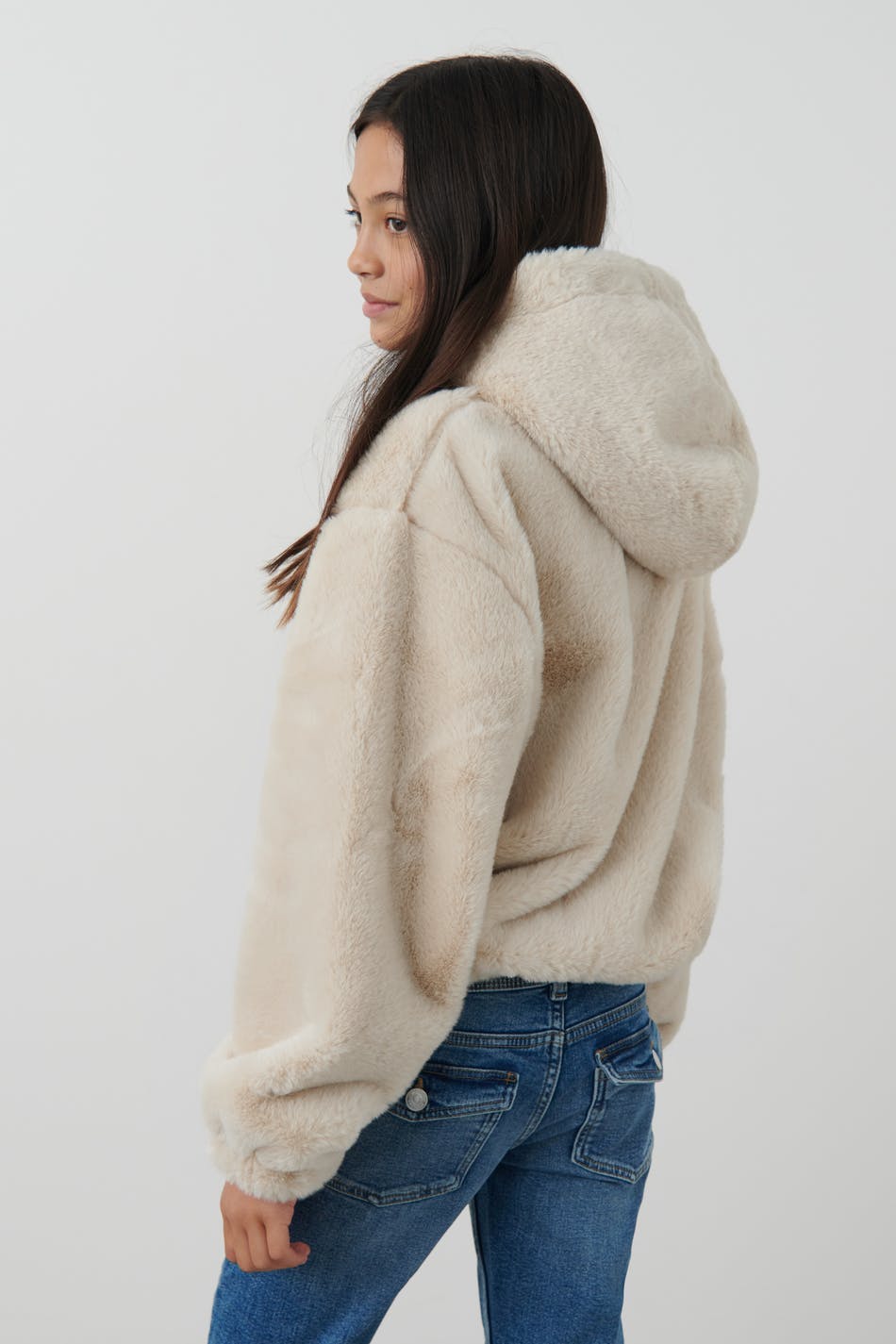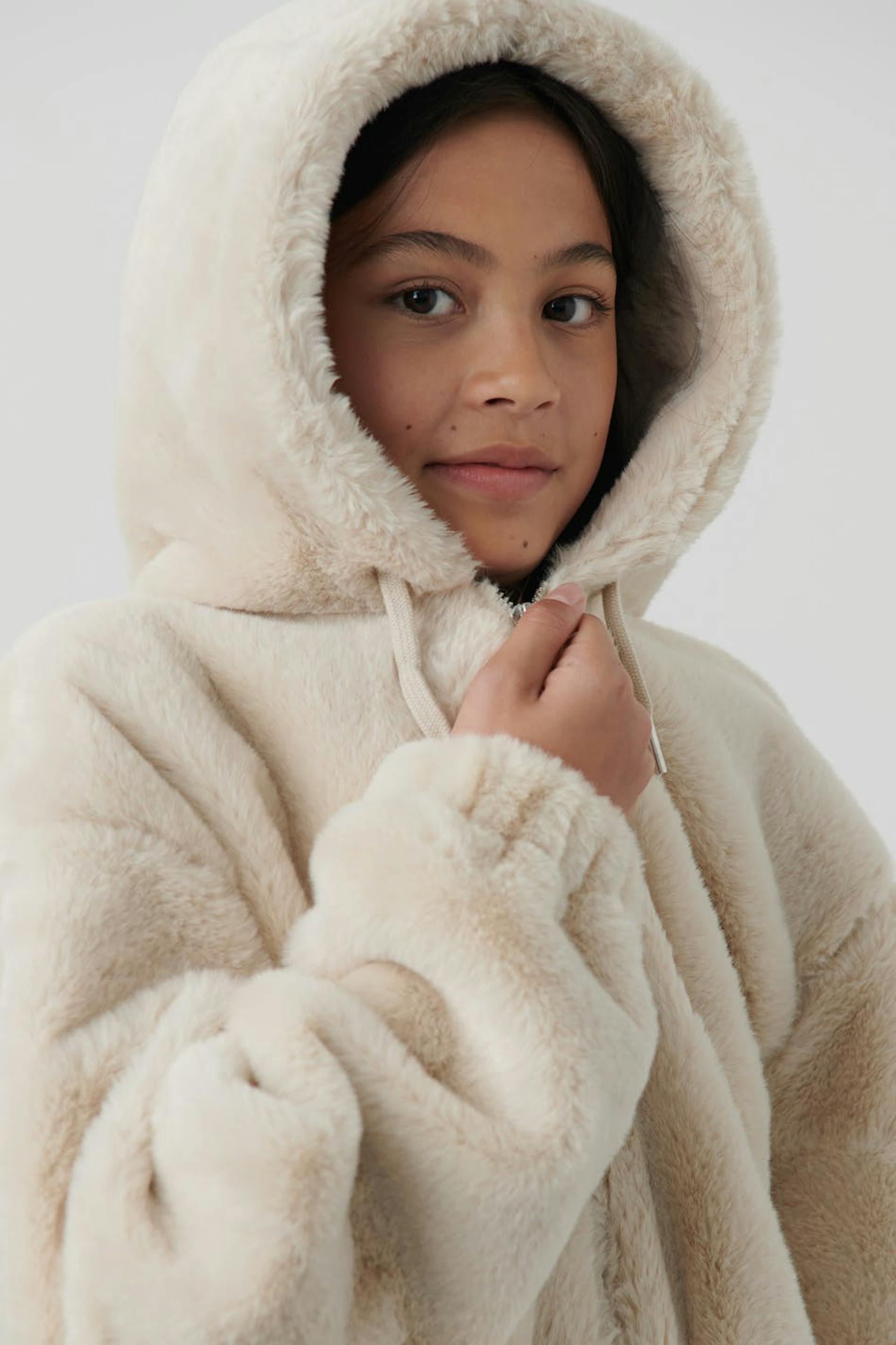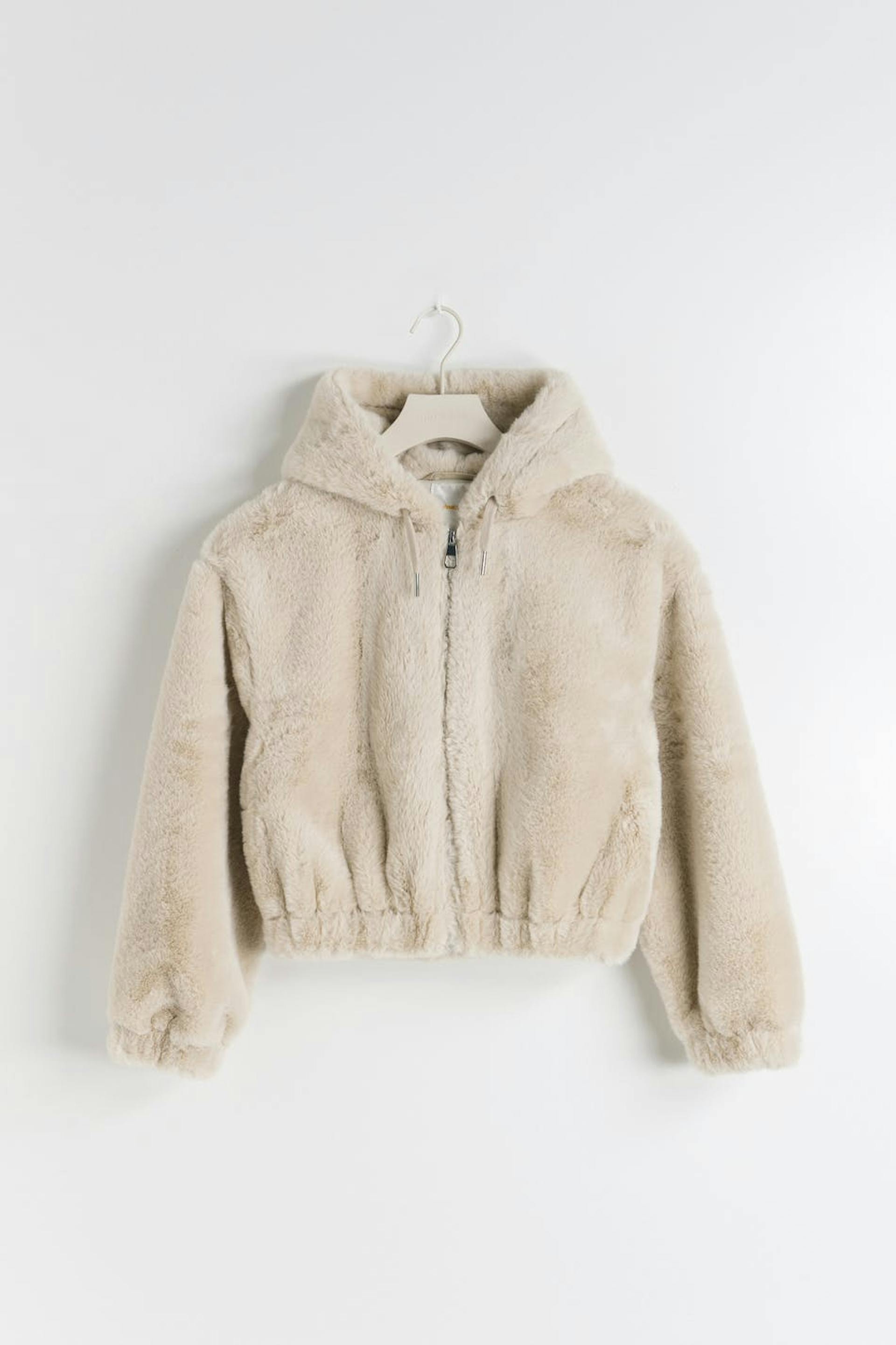 Hoodie in faux fur with hood at the back. The hoodie is beige and has boxy fit. It has warm, cosy quality and zip closure at the front.