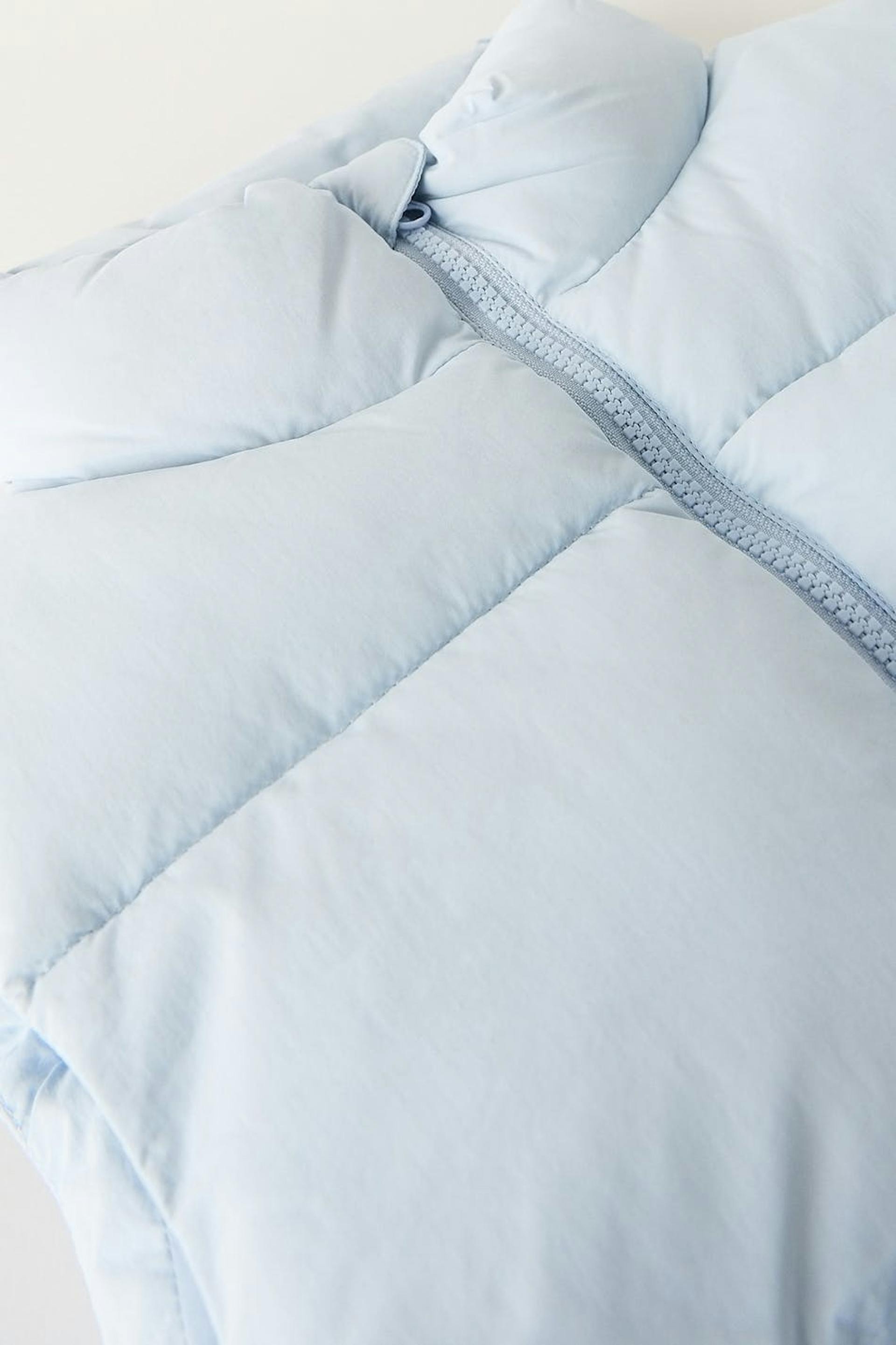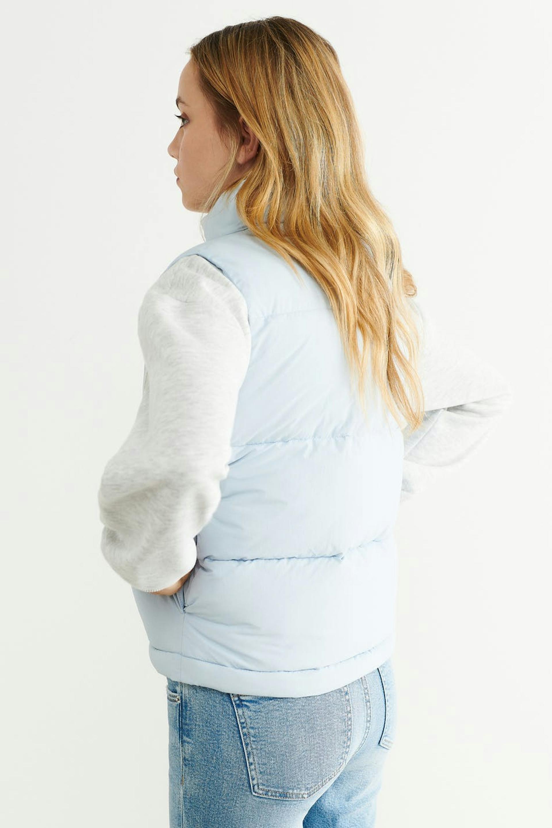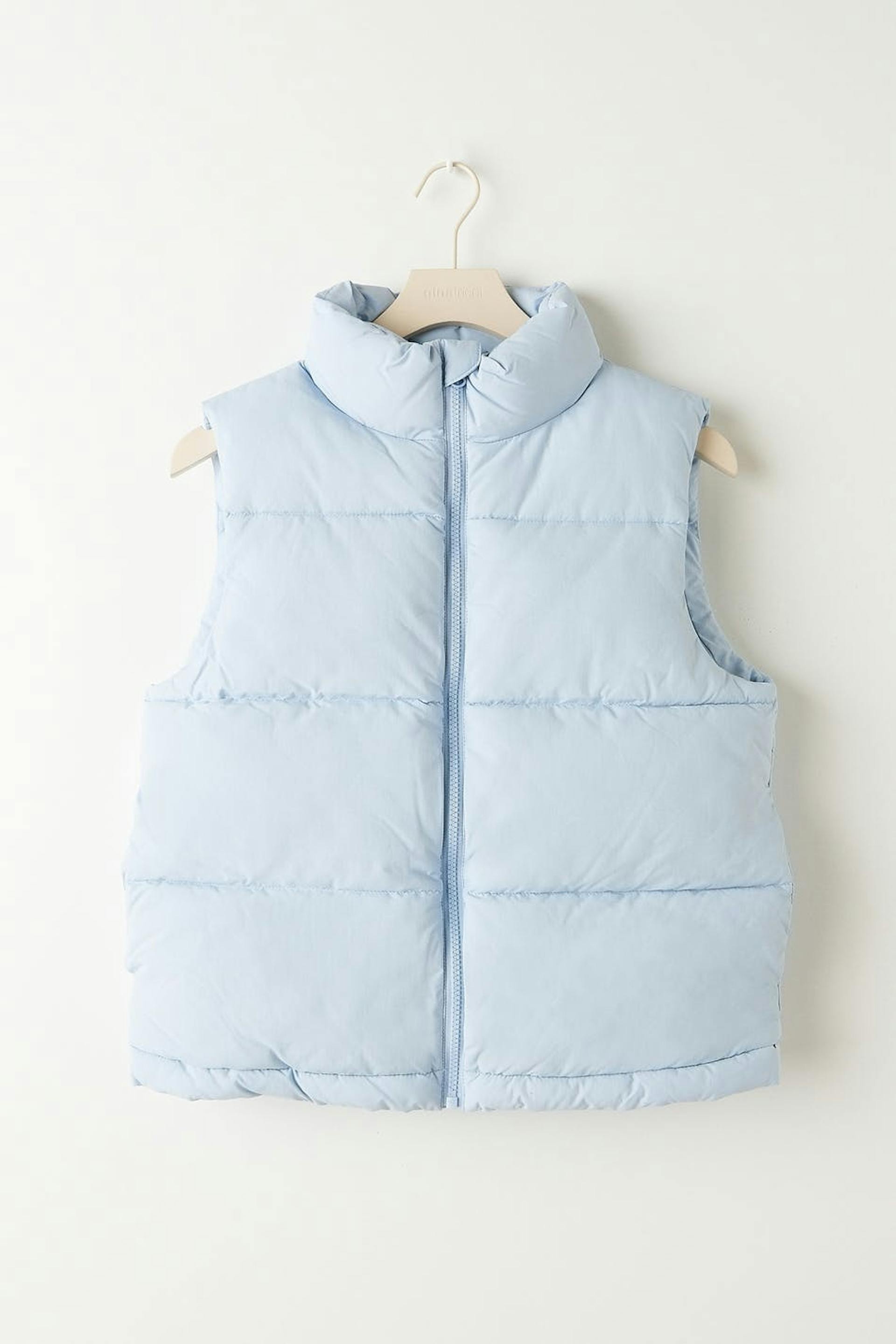 Short puffer vest with zip closure in front. The waistcoat is blue and has an oversize fit. It has side pockets and an elasticized drawstring at the bottom hem.