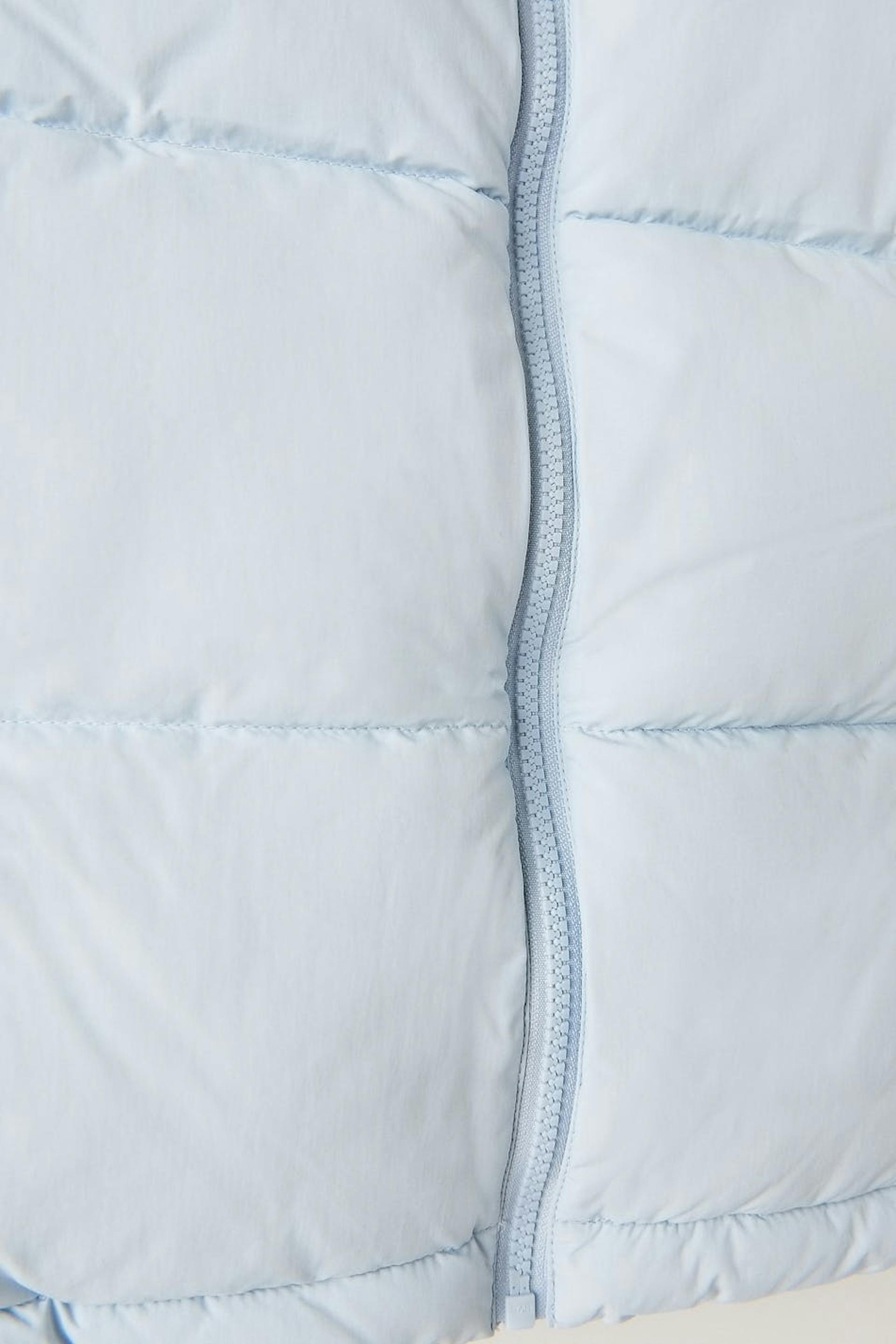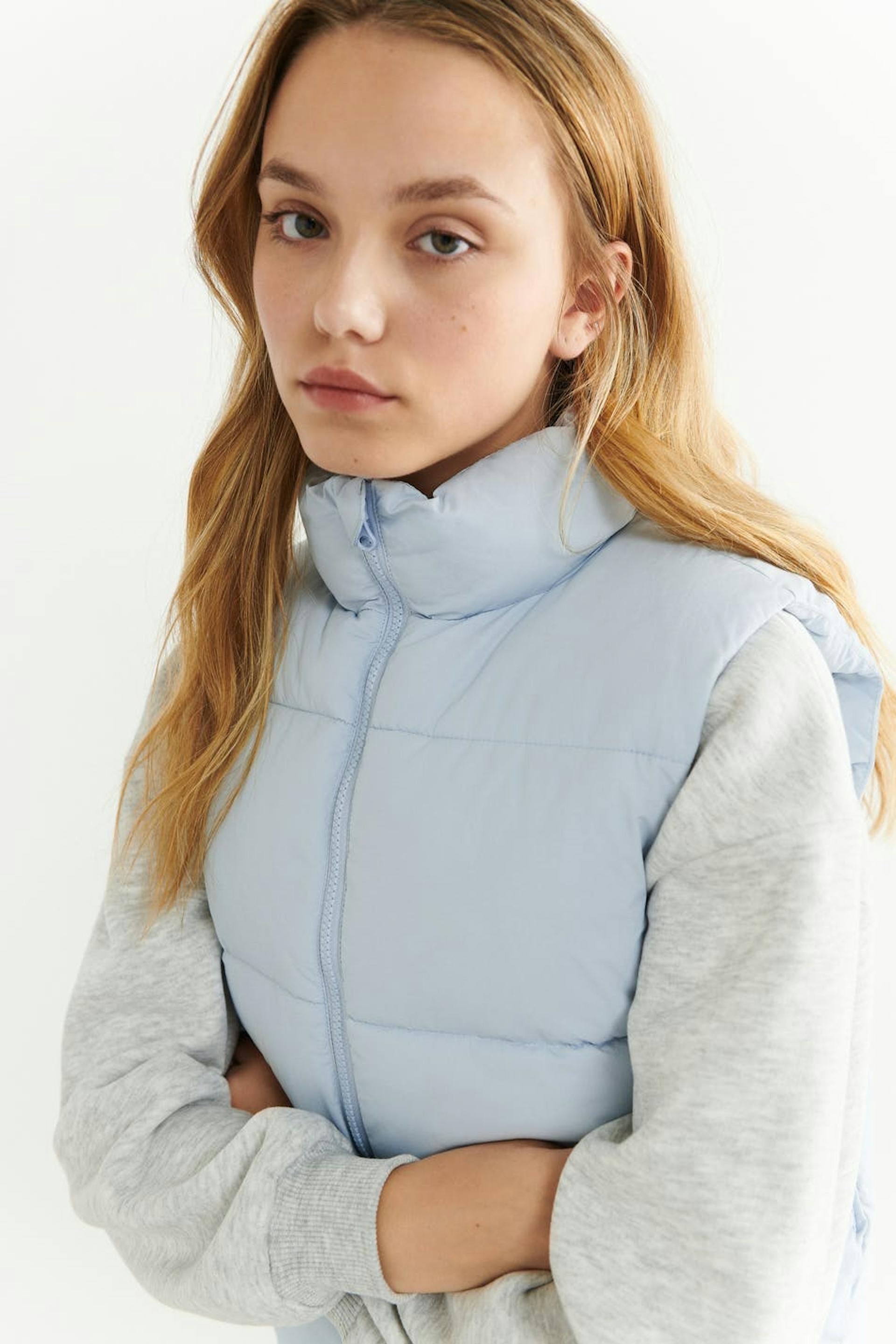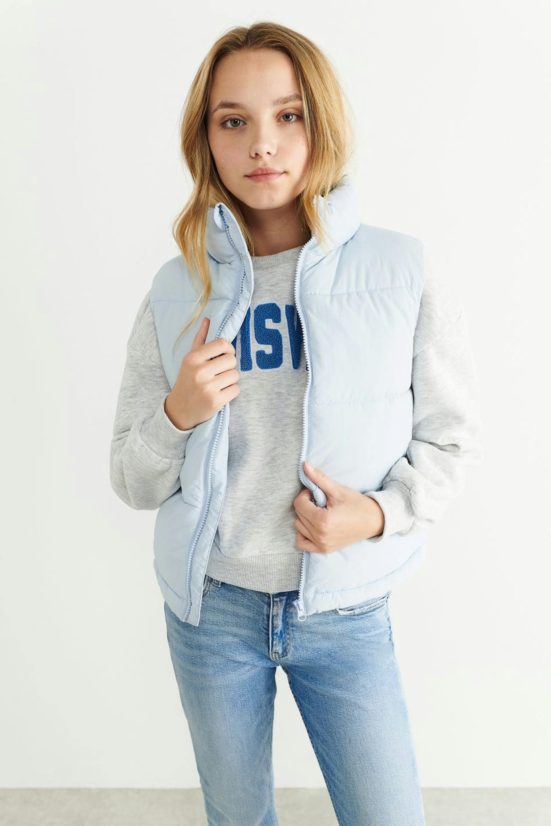 Short puffer vest with zip closure in front. The waistcoat is blue and has an oversize fit. It has side pockets and an elasticized drawstring at the bottom hem.