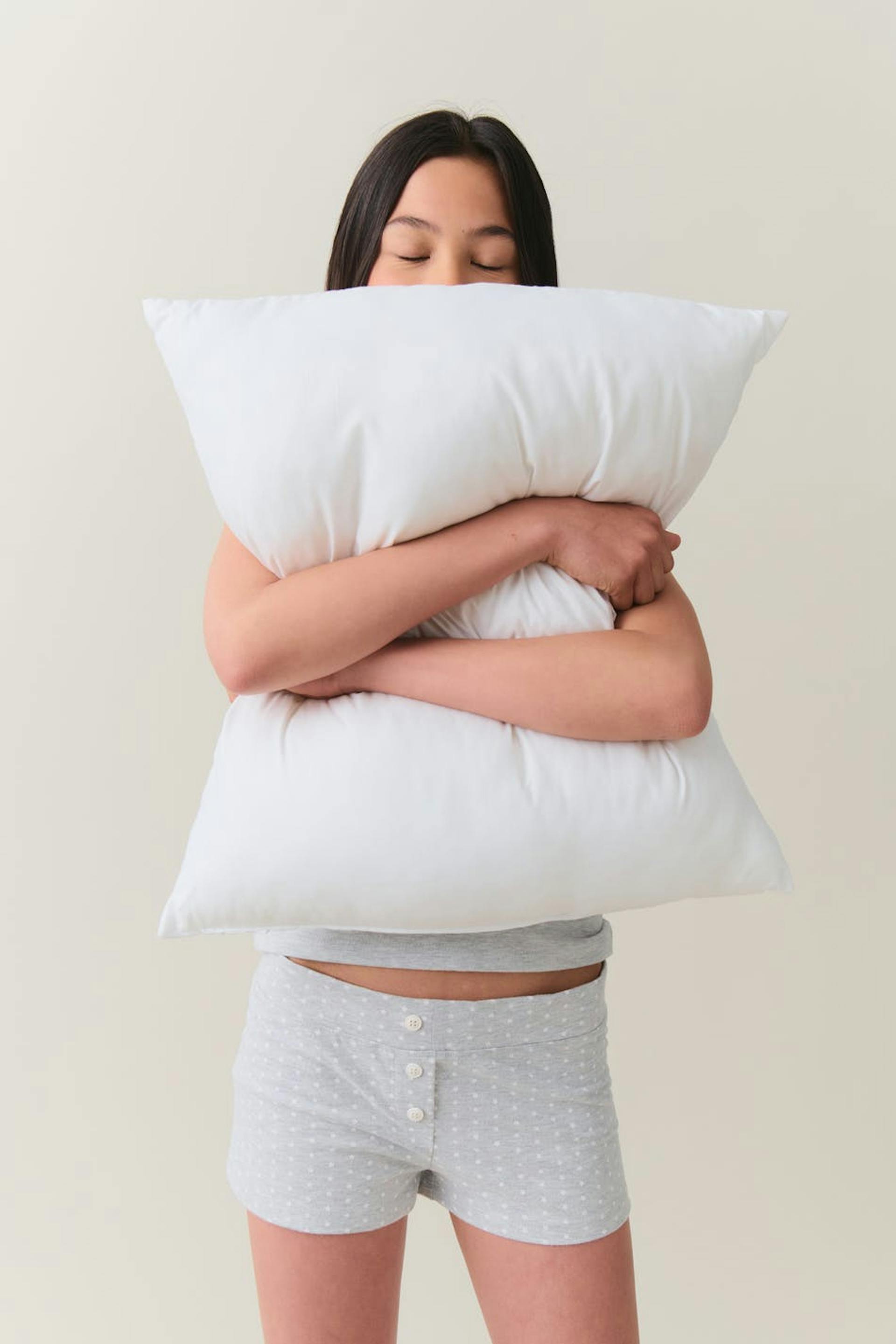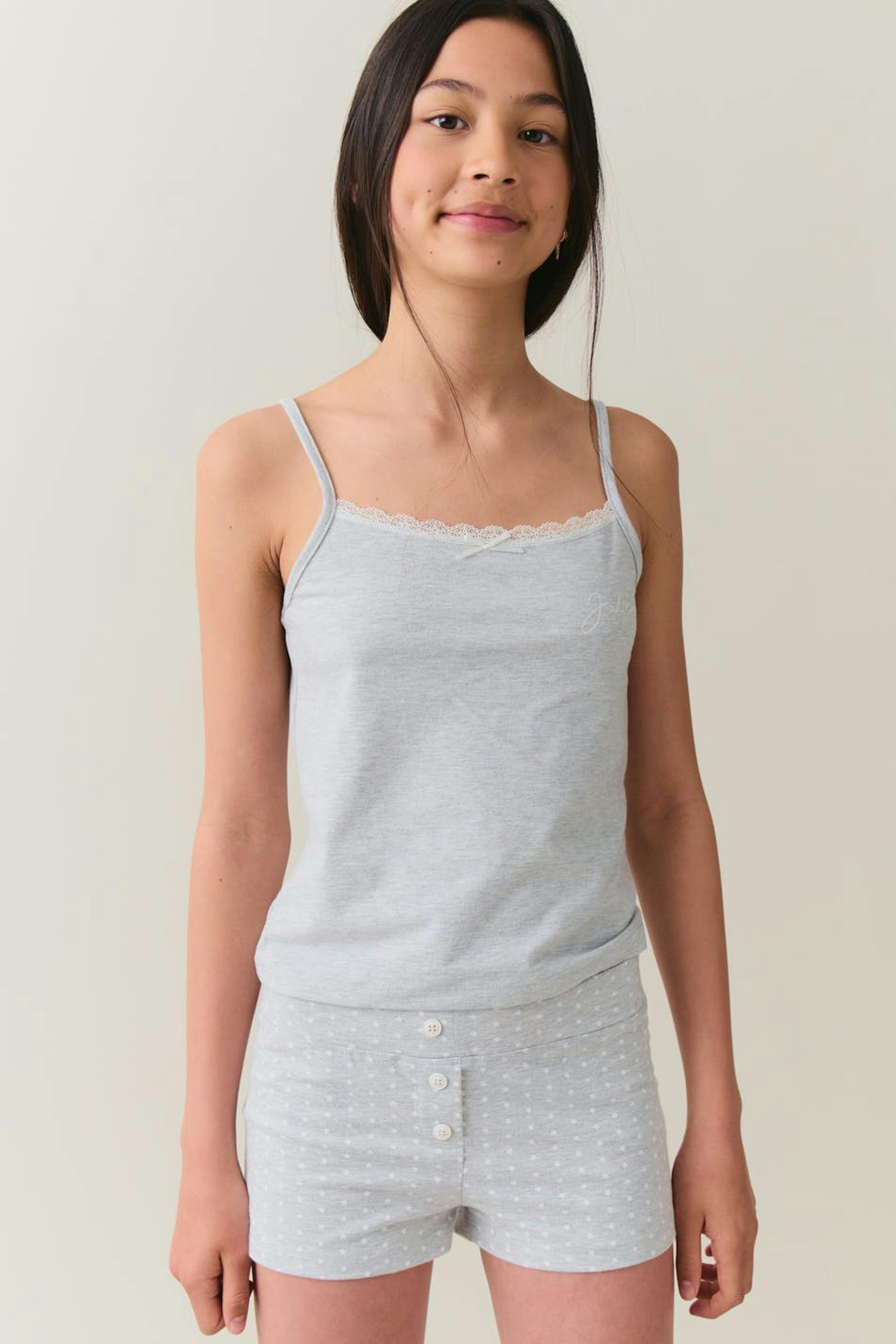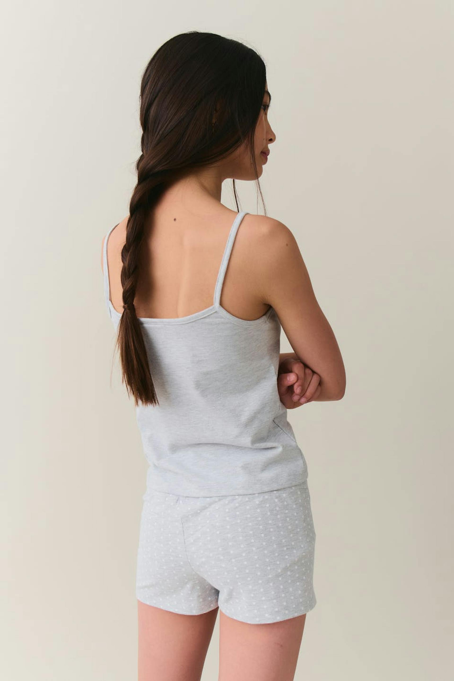 Short pyjama shorts with decorative buttons at the front. The shorts are grey and have figure-hugging fit. They have soft elastic at the waist.