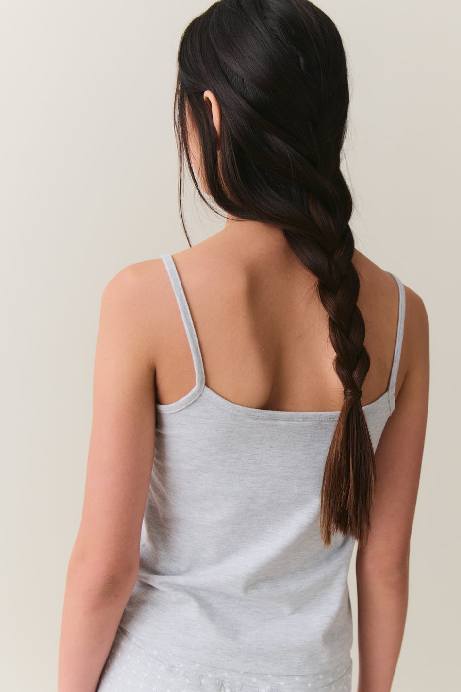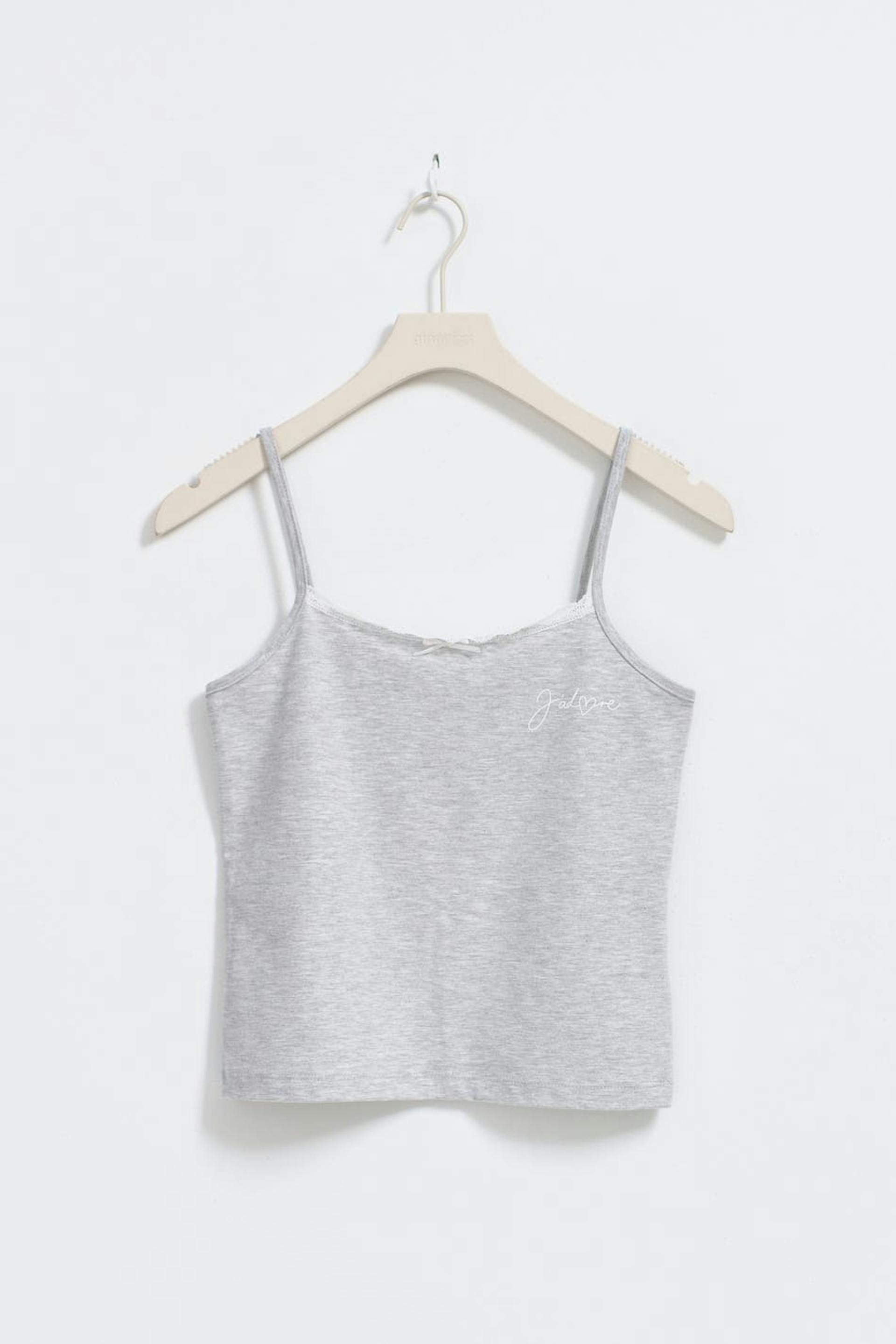 Pyjama singlet with print at the front. The slip singlet is grey and has lace on the neckline. It has figure-hugging fit, bow at the front, thin shoulder straps and cropped length.