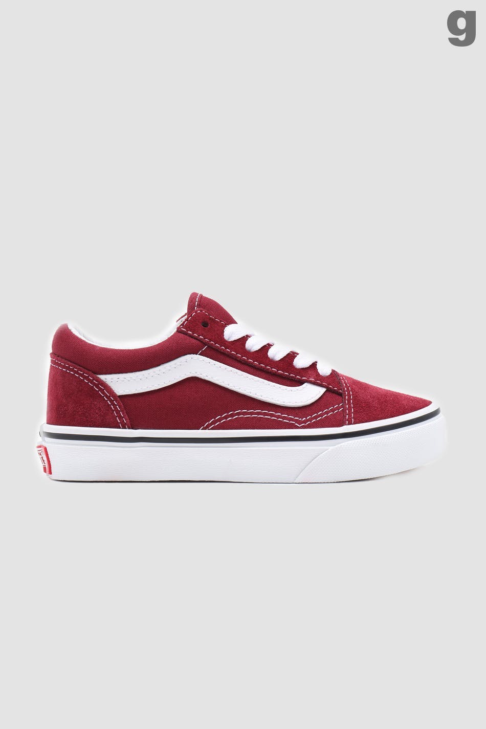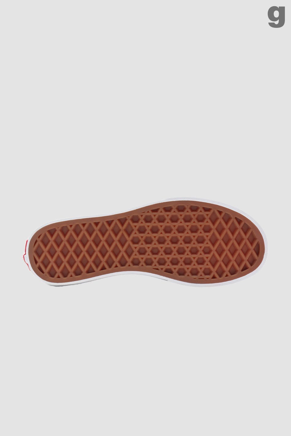 Low sneakers by Vans with lacing at the front. The shoes are red and have a white platform with a black stripe. They have decorative seam details on the sides.