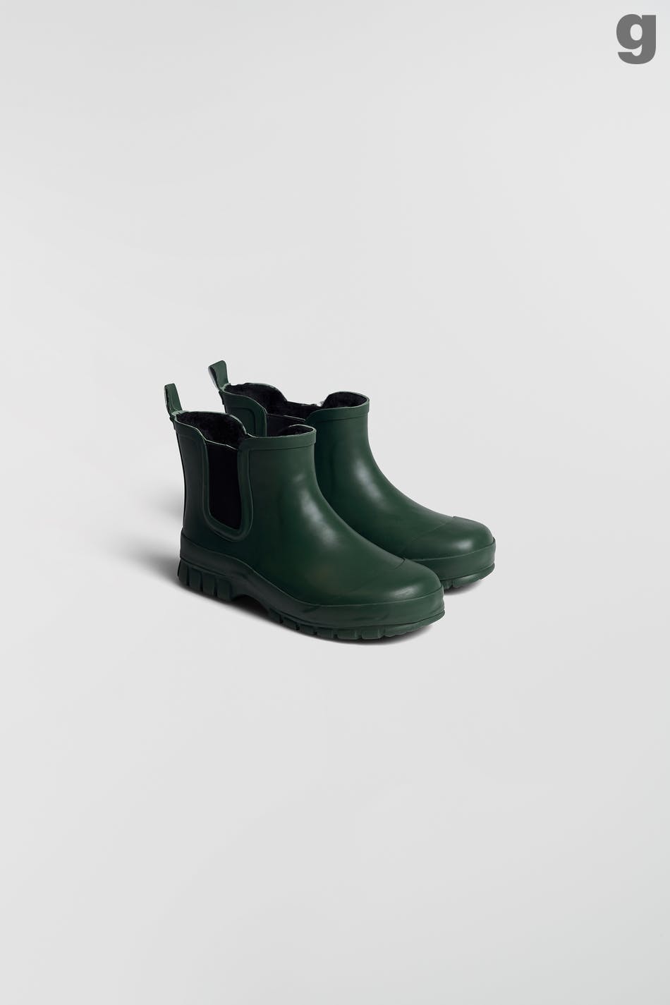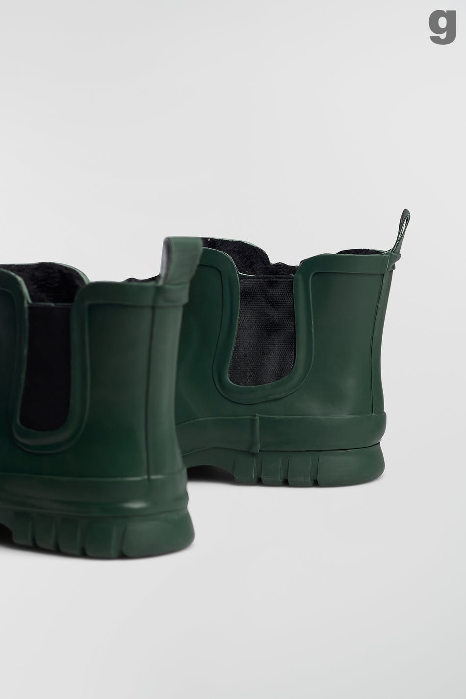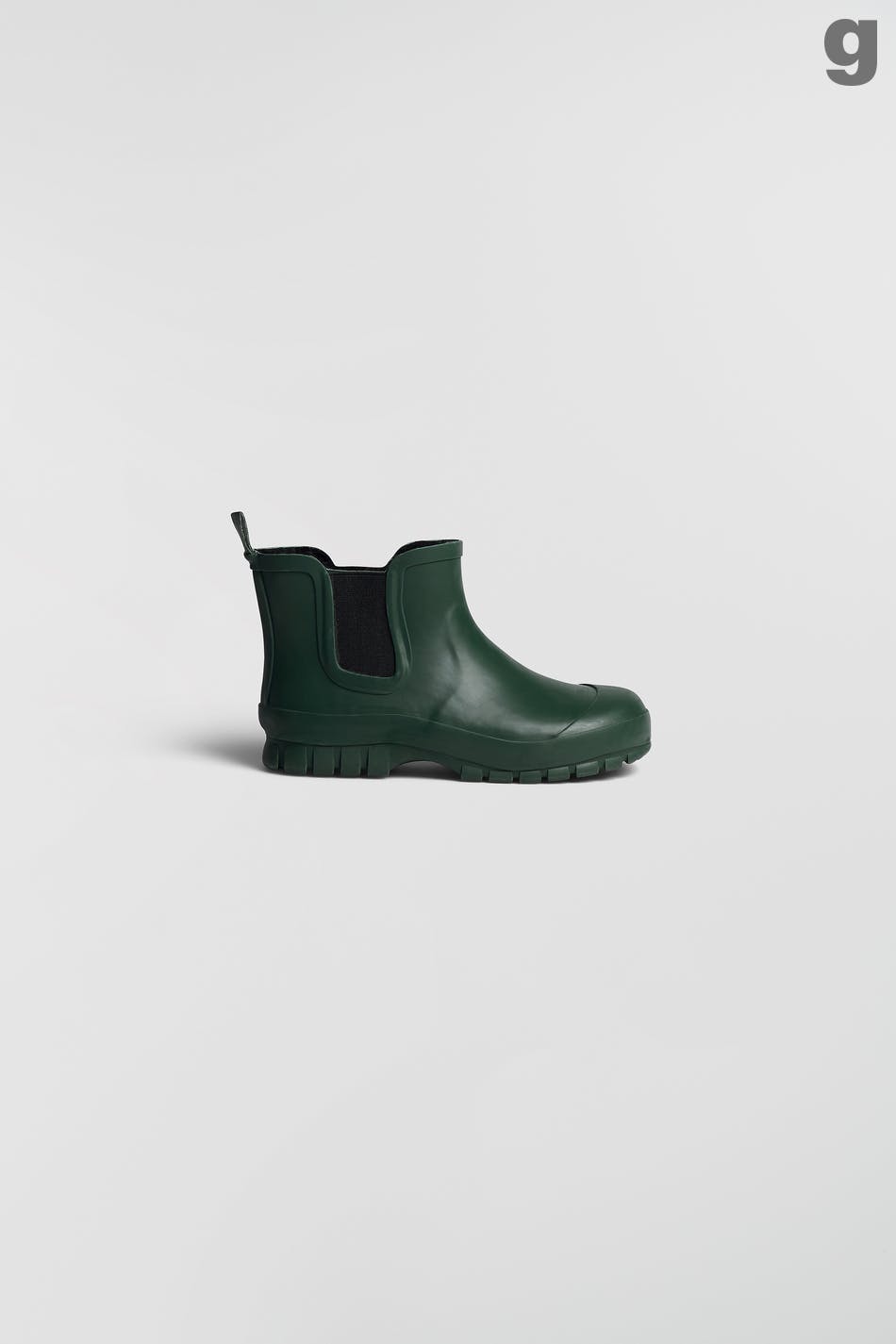 Boots with low shaft. The boots are green and have a chunky sole. They are made of rubber and have a soft lining on the inside and elastic on the sides.