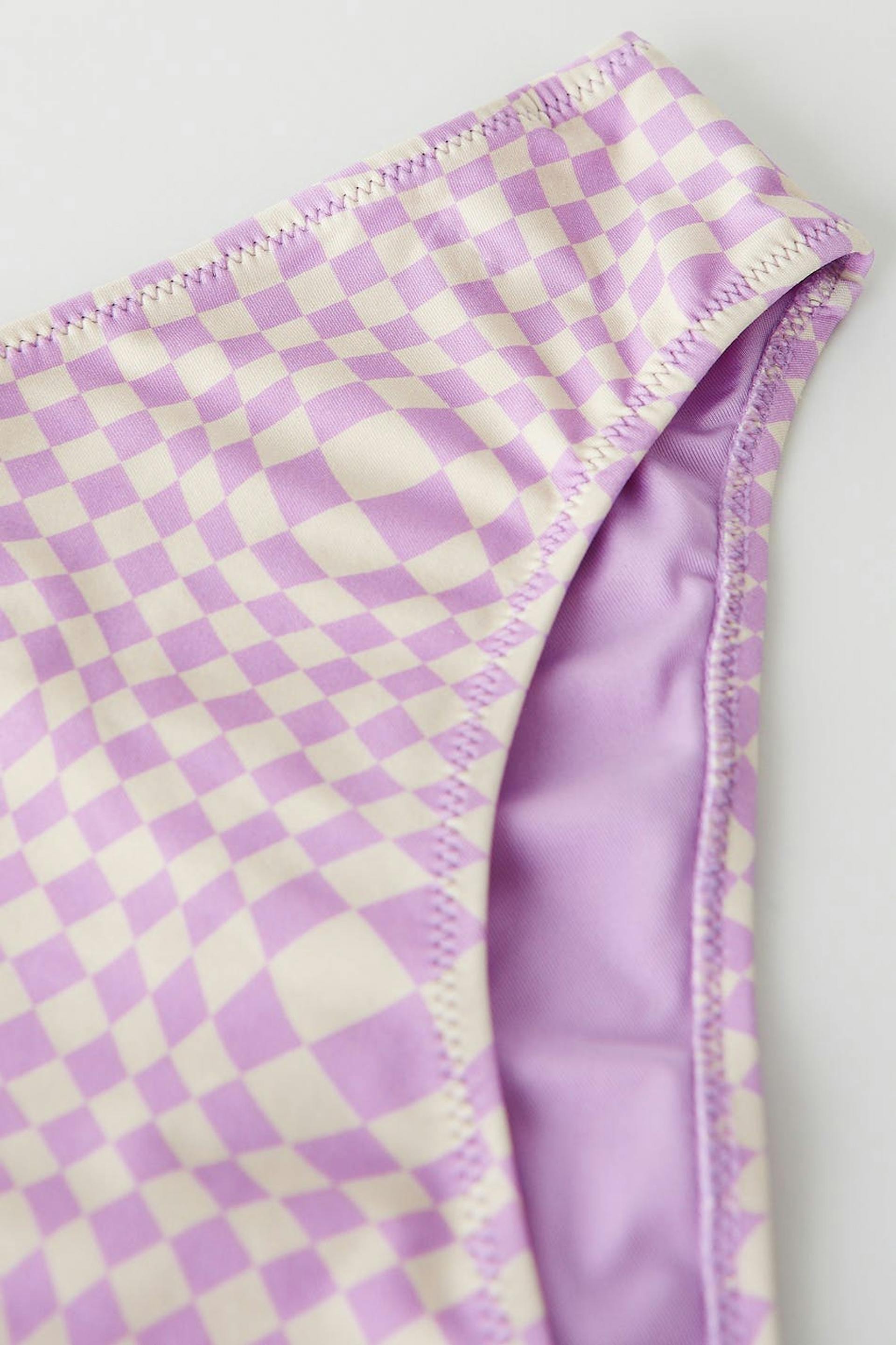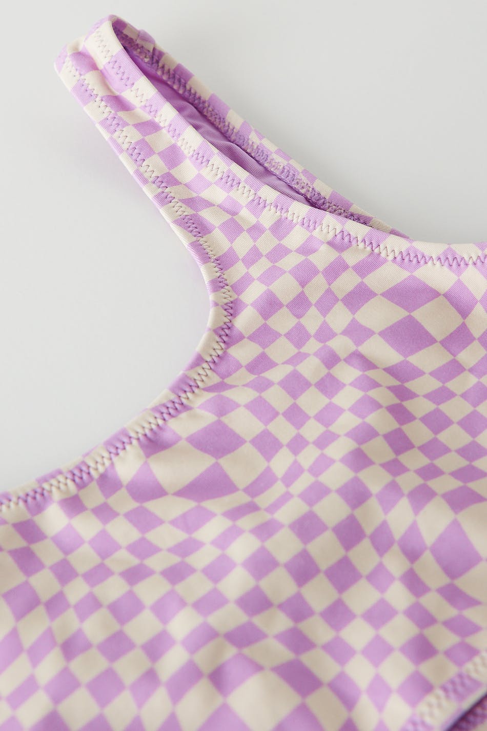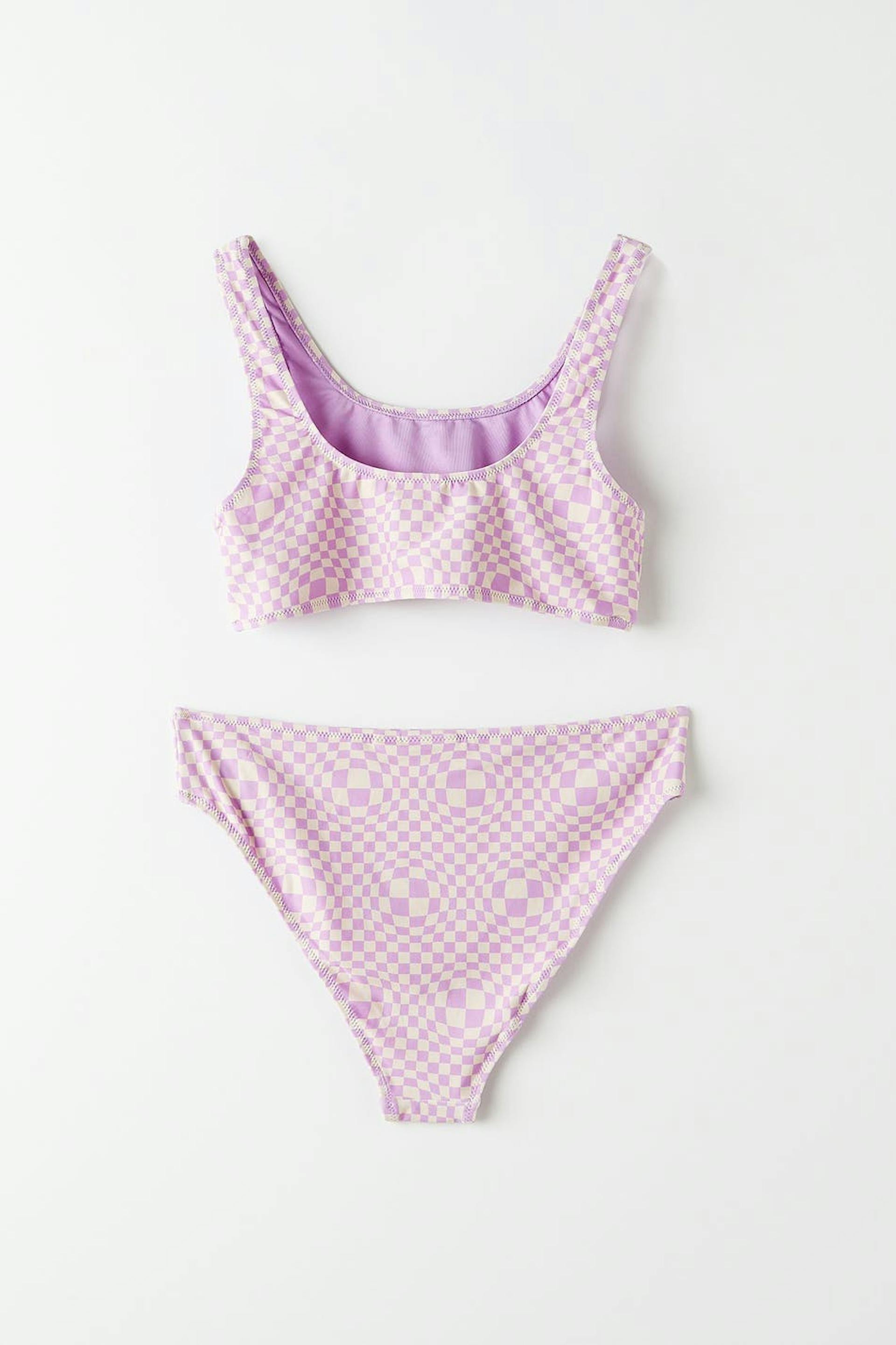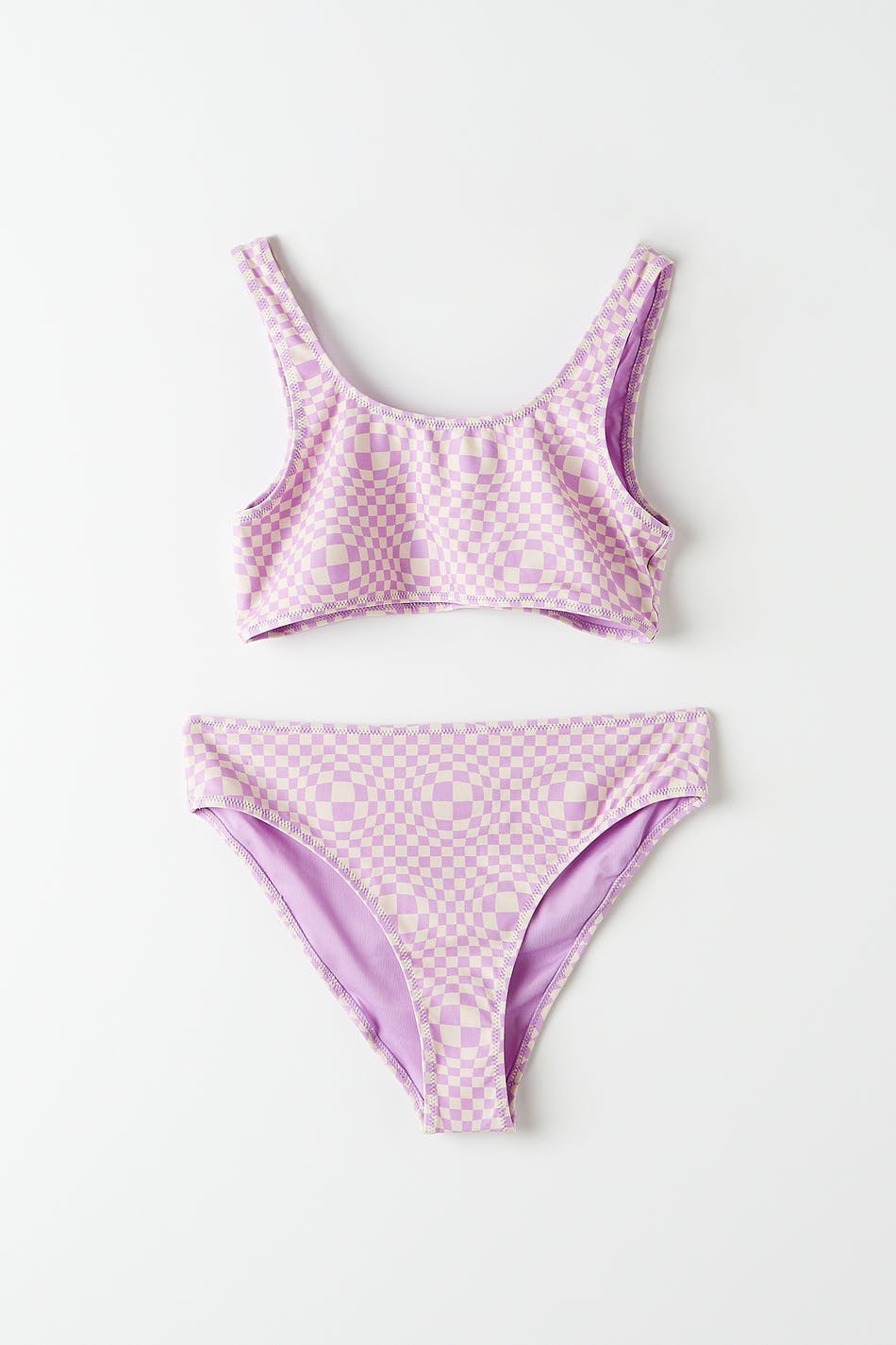 Sporty bikini set by our Young assortment with lined inside. The bikini set is purple and has a patterned bikini bra with matching bikini bottoms.