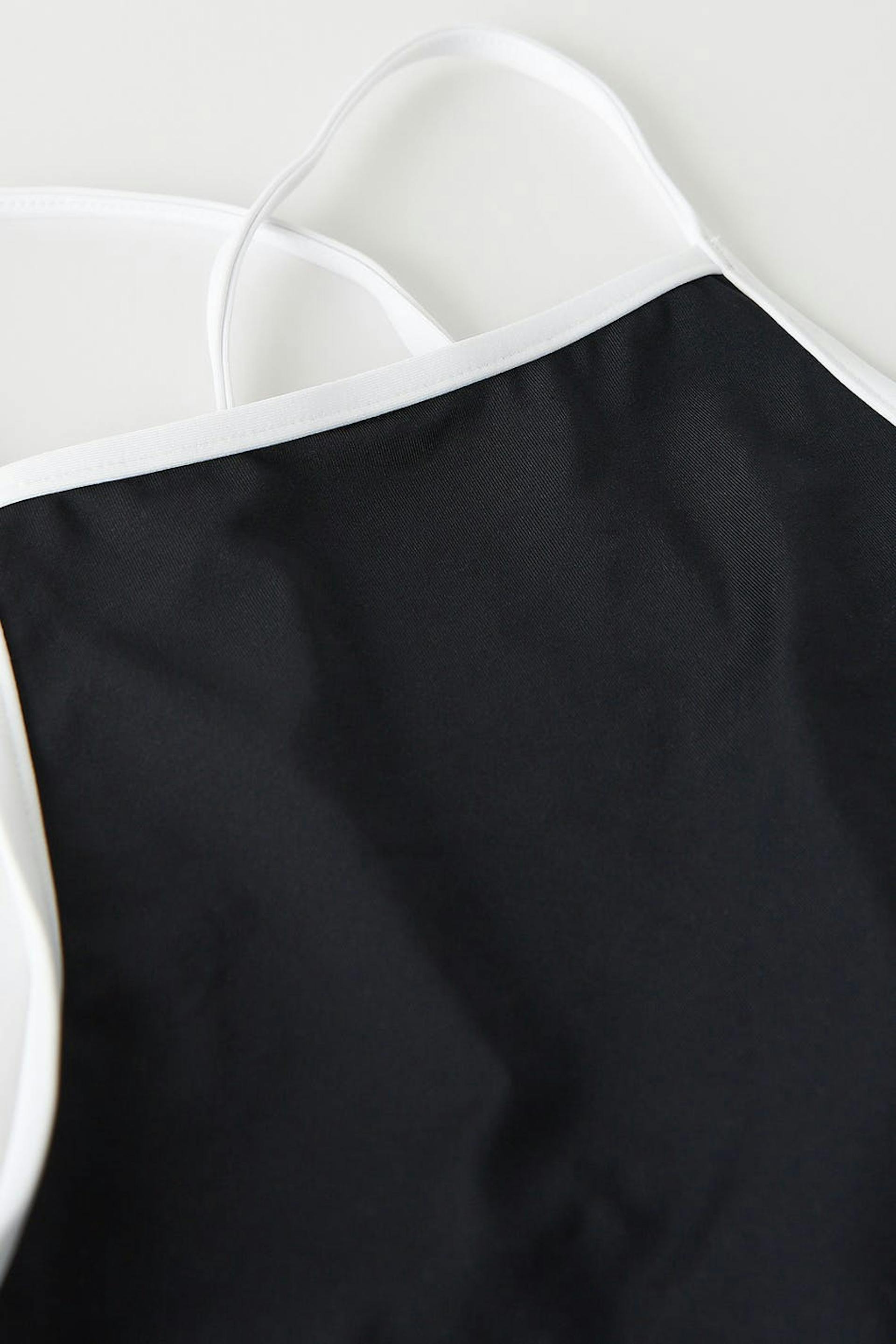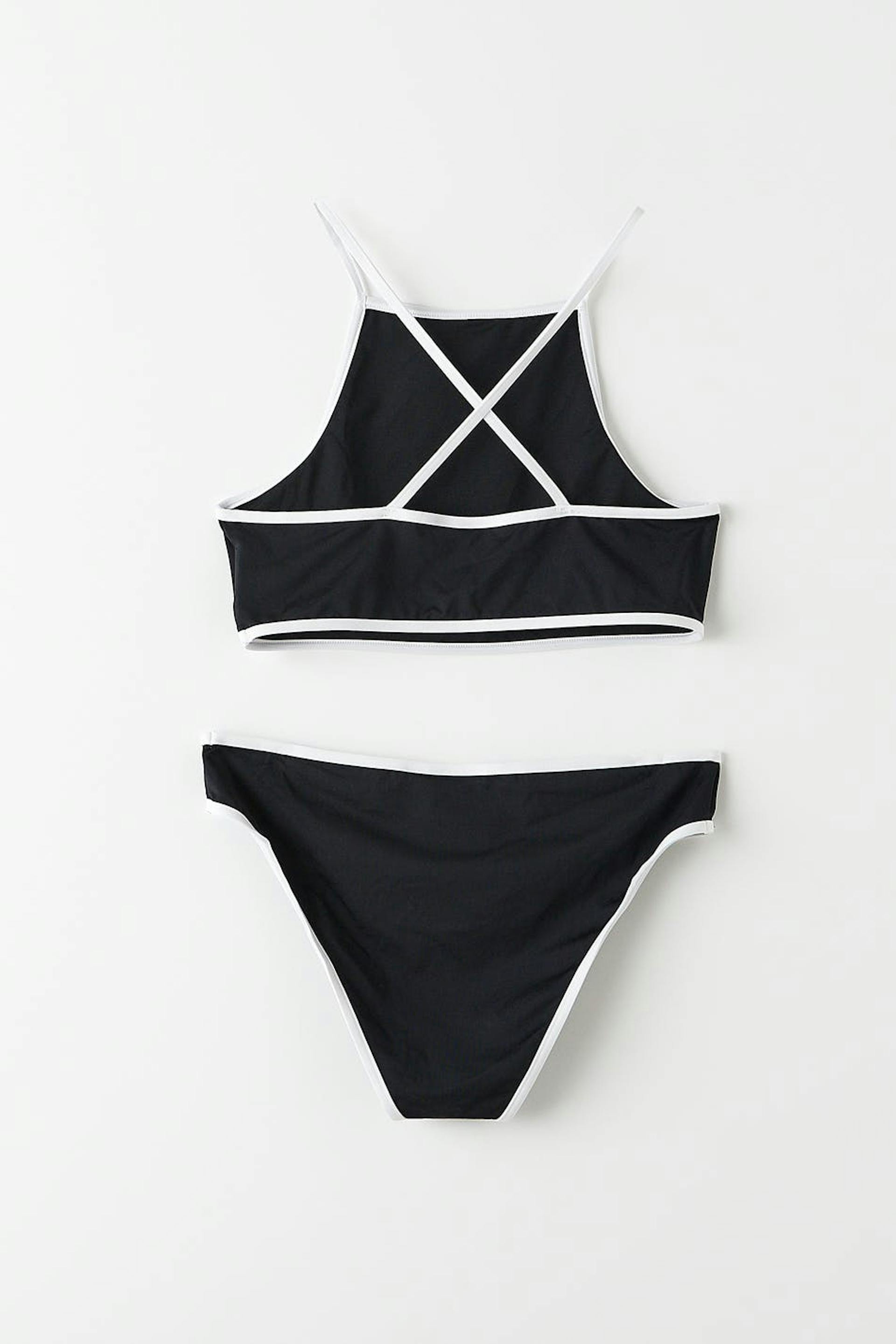 Bikini set by our Young assortment with lined inside. The bikini set is black and has contrast stitches. It has a bikini bra with thin shoulder straps crossing at the back and matching bikini bottoms.