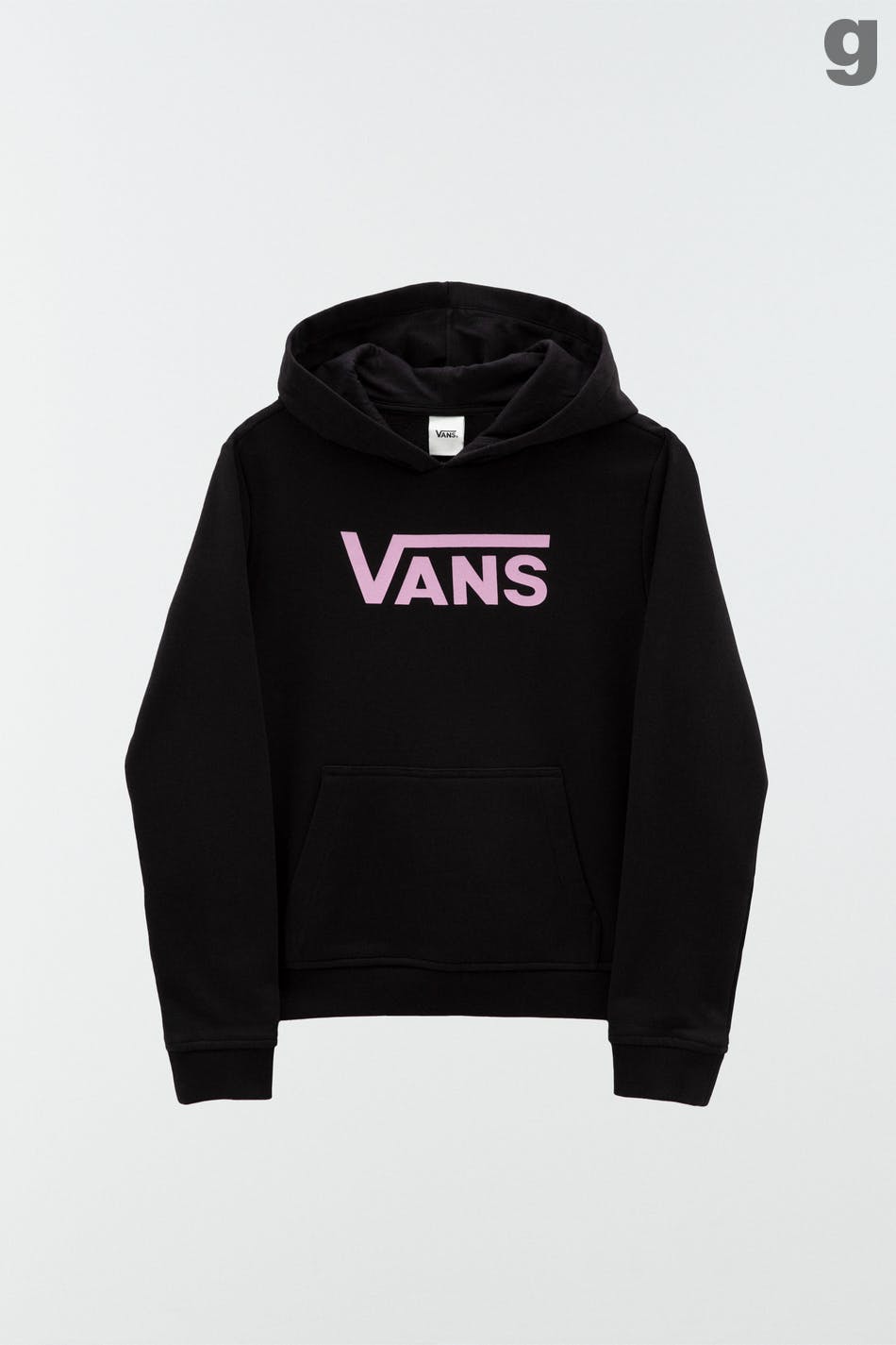 Hoodie by Vans with a printed, pink logo at the front. The hoodie is black and has a pouch pocket.