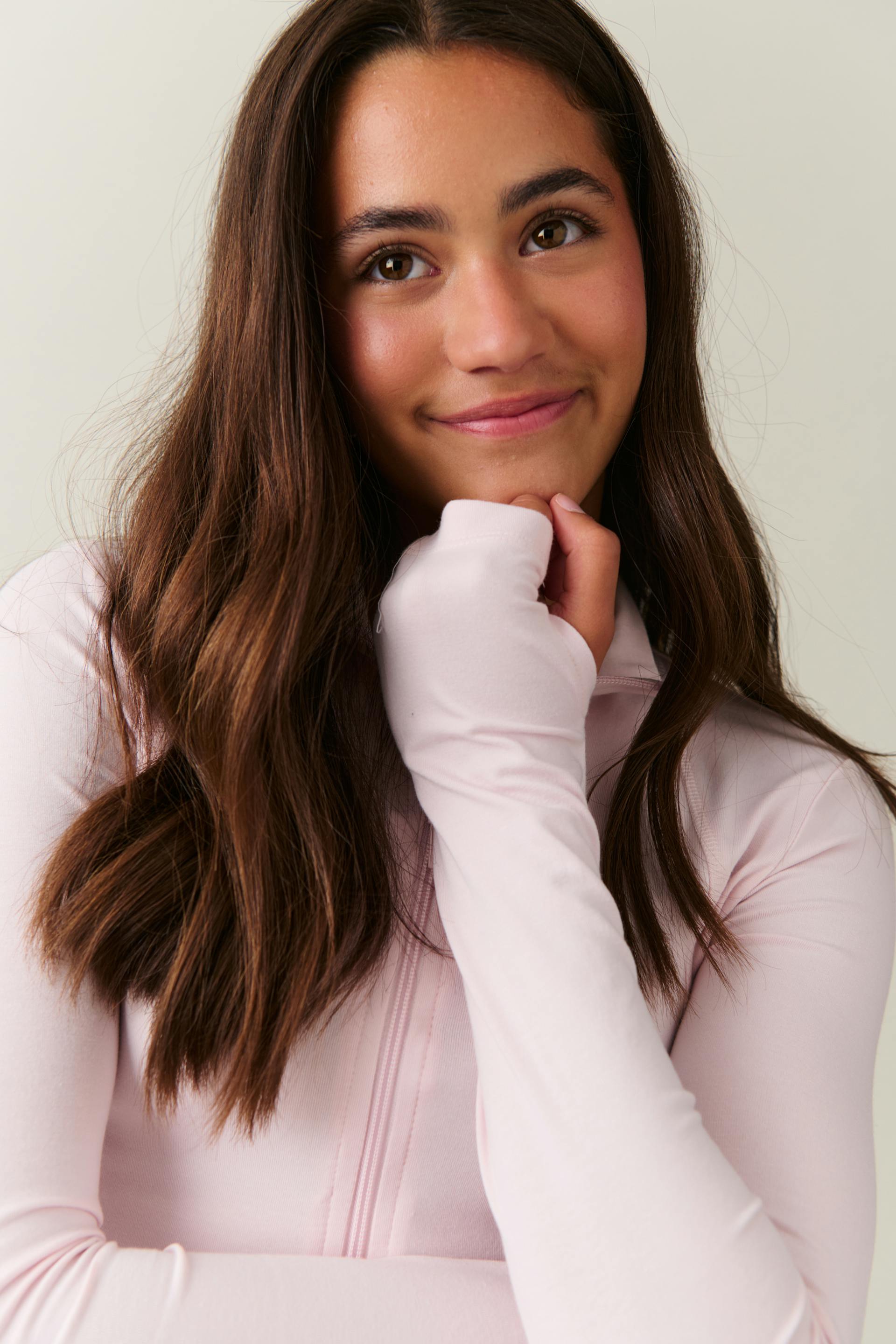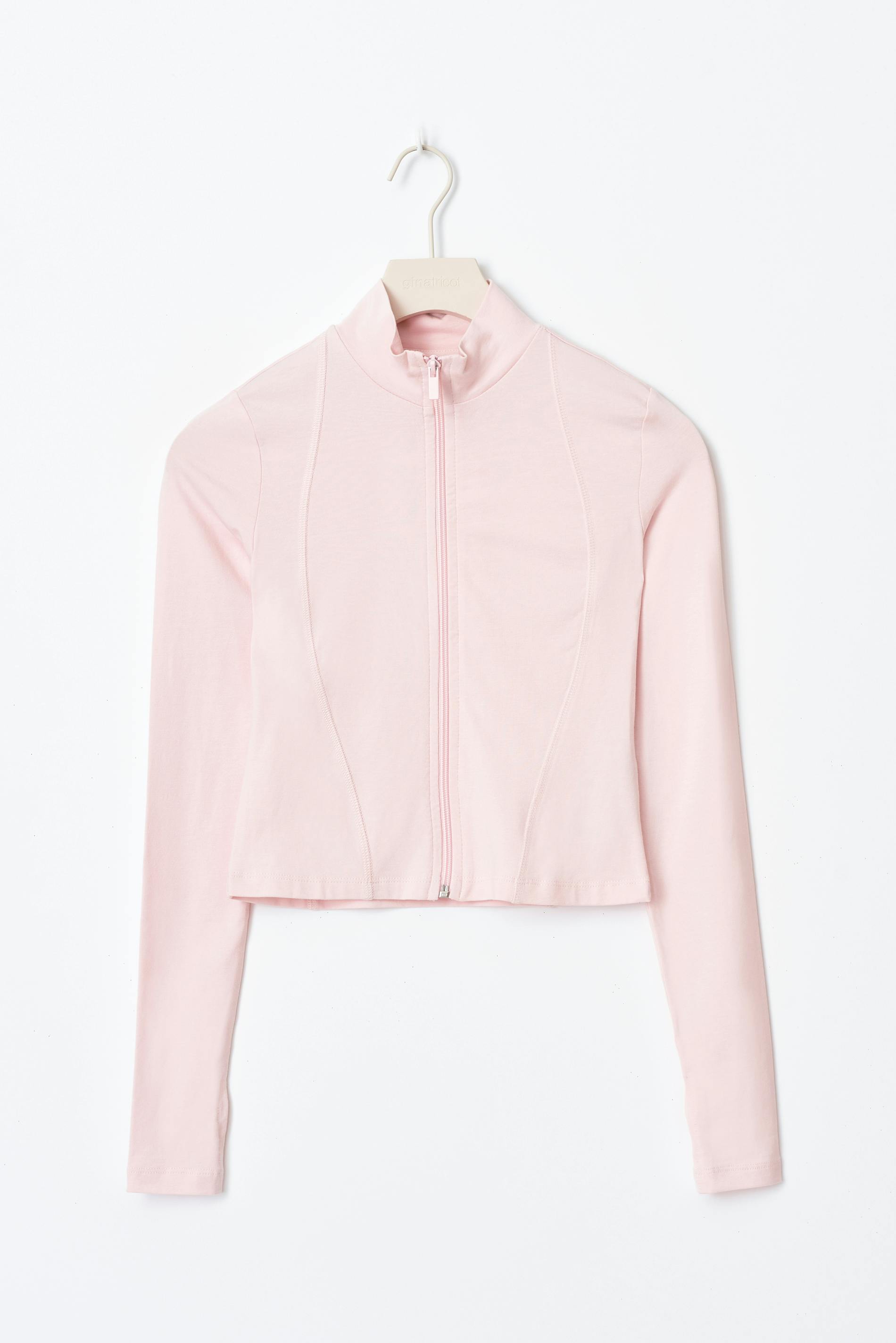 Sporty jacket with figure-hugging fit. The jacket is pink and has zip at the front. It has soft quality, high neck, long sleeve and thumbholes.