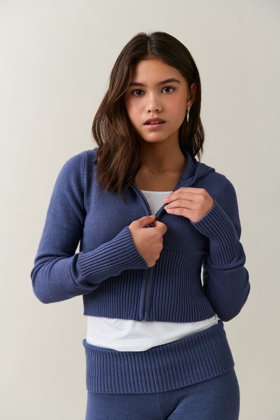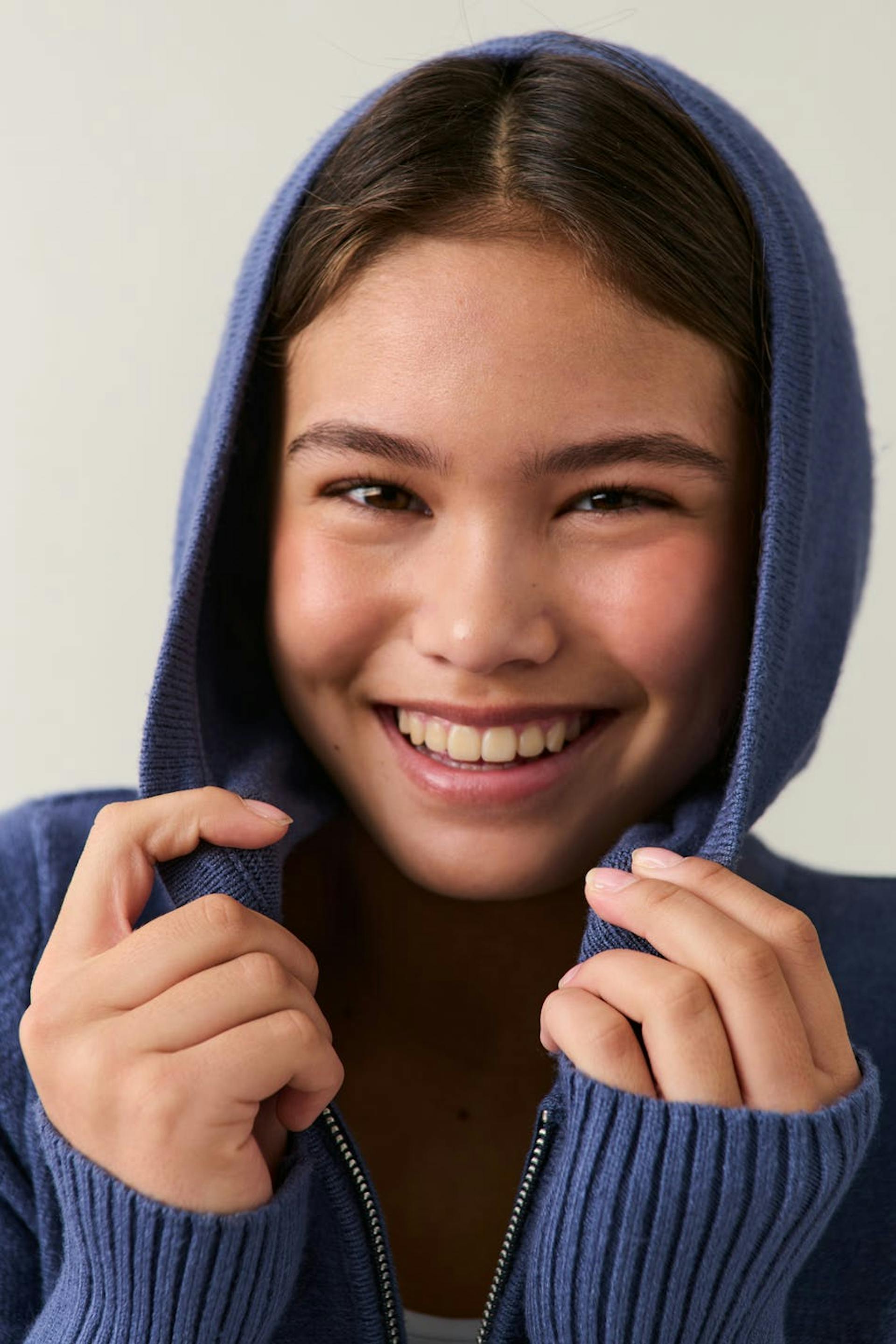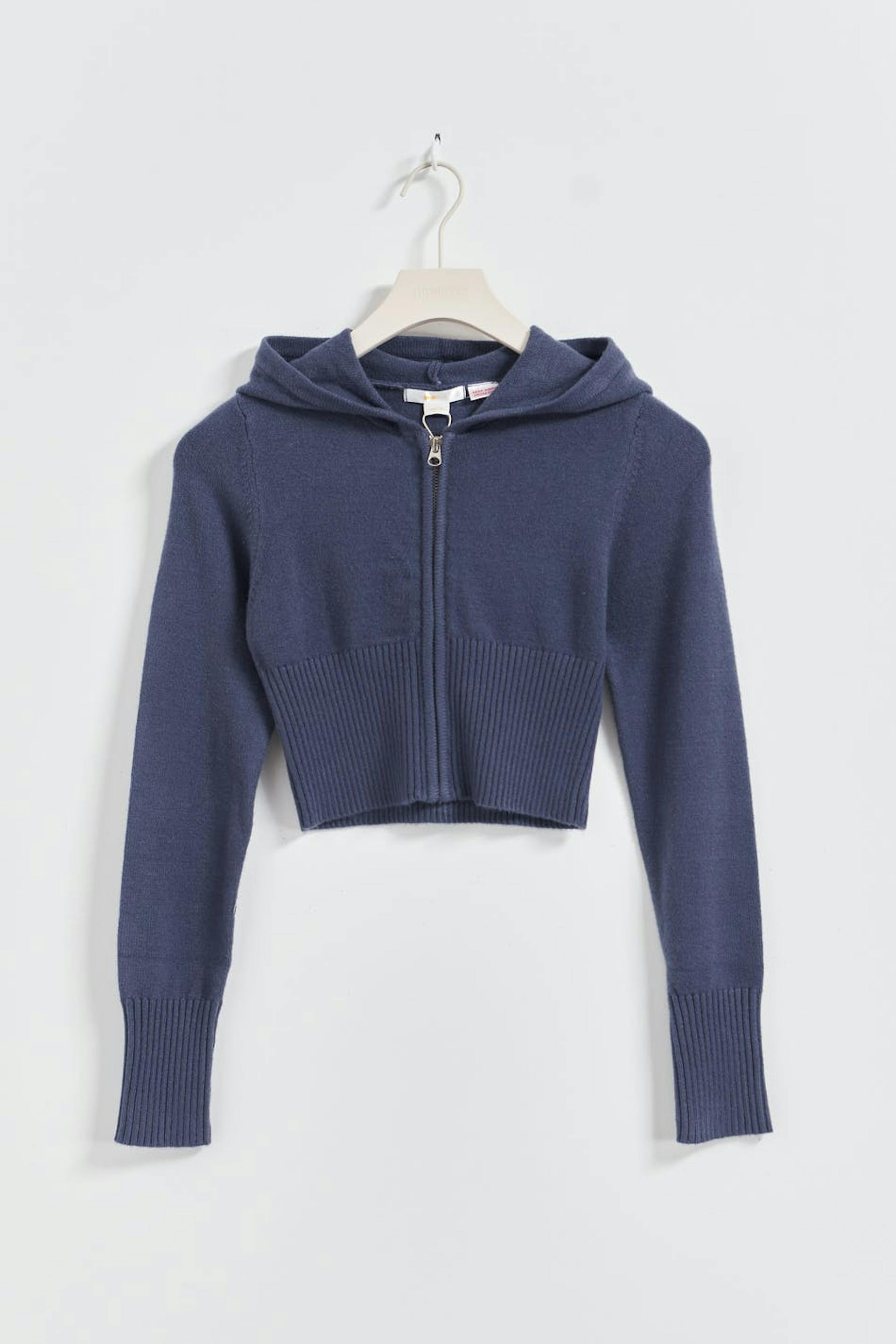 Knitted hoodie with an oversize fit. The hoodie is blue and has a zip.