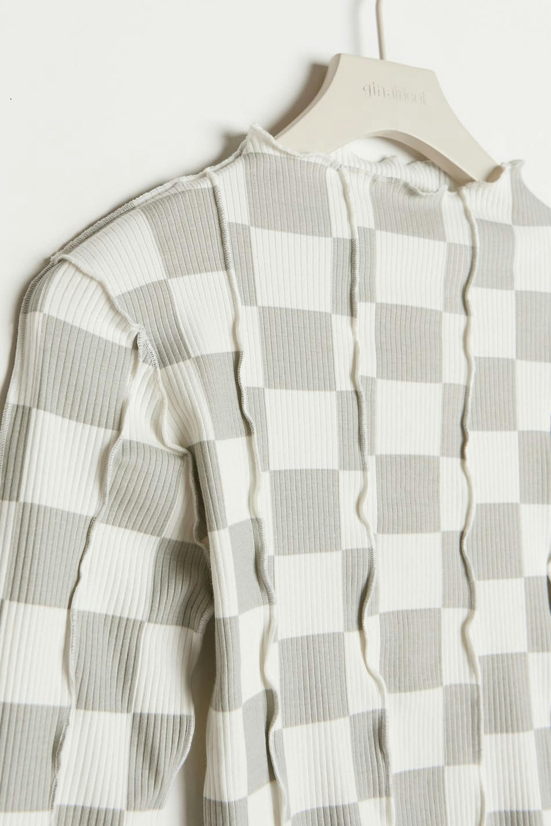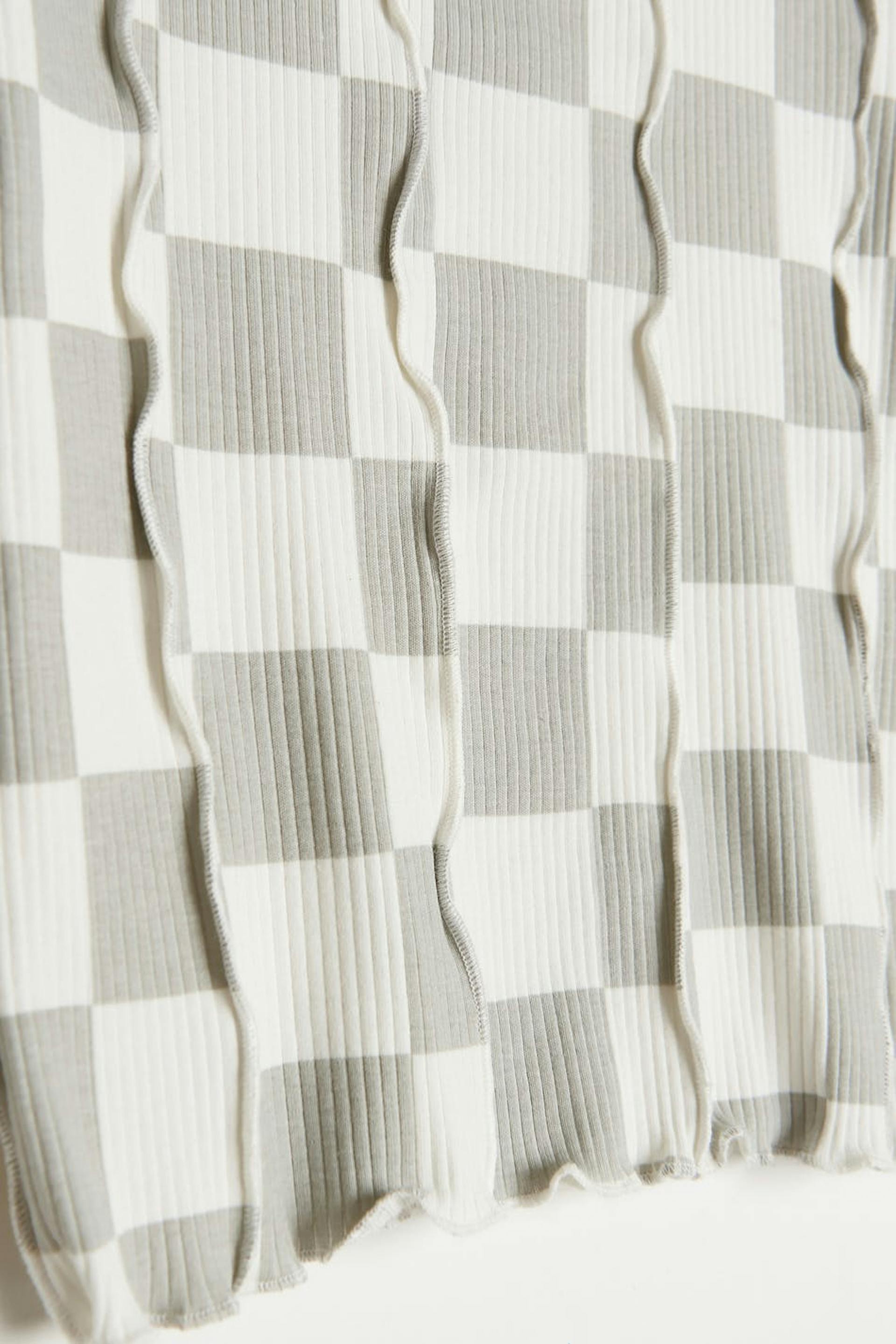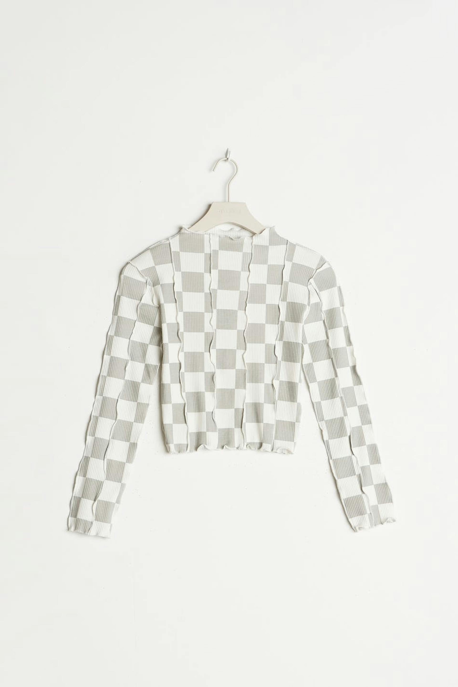 Checked top by our Young assortment with ruffle details. The top is grey, ribbed and long-sleeved. It has a high neckline, a fitted fit and a soft material in cotton.