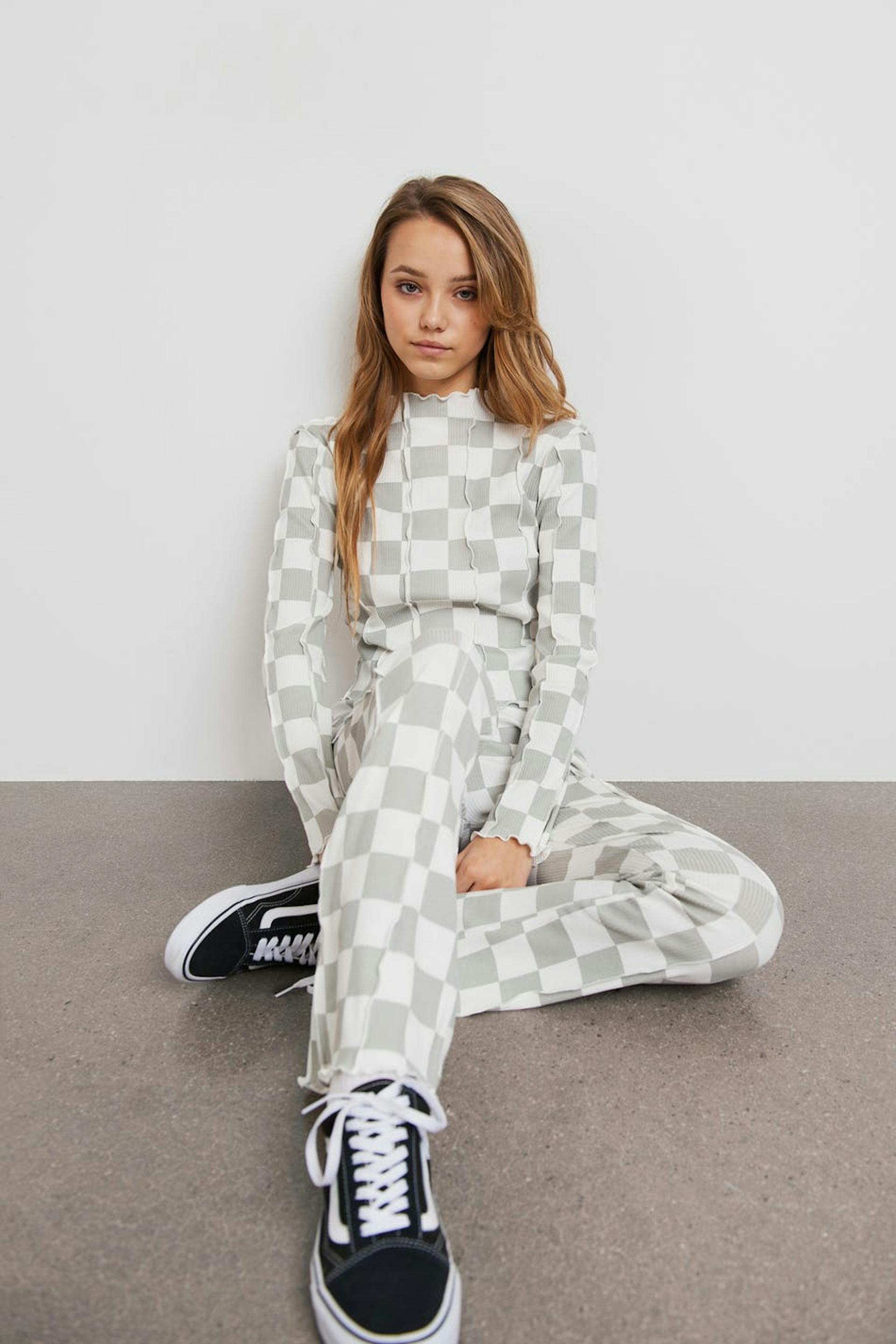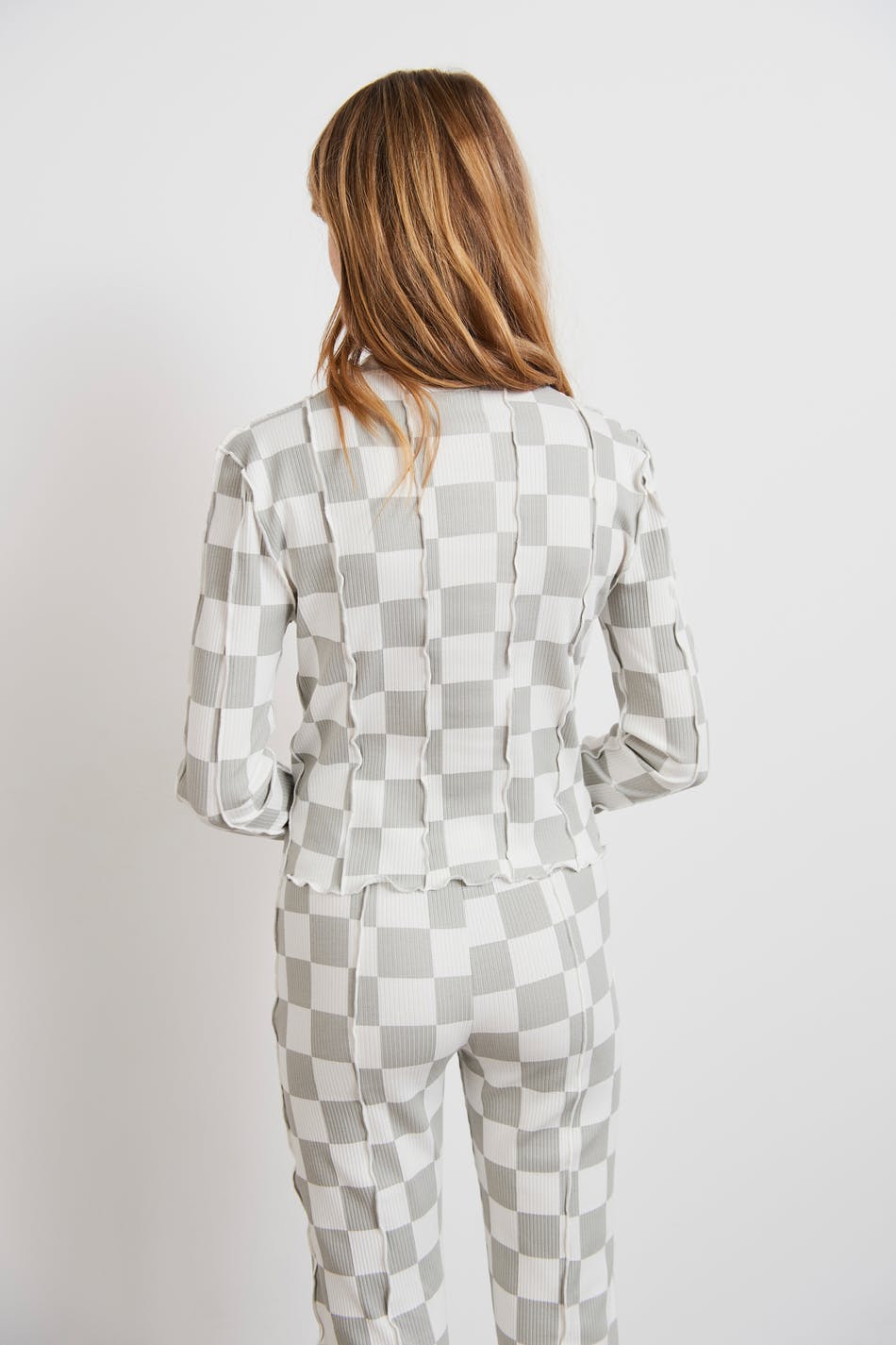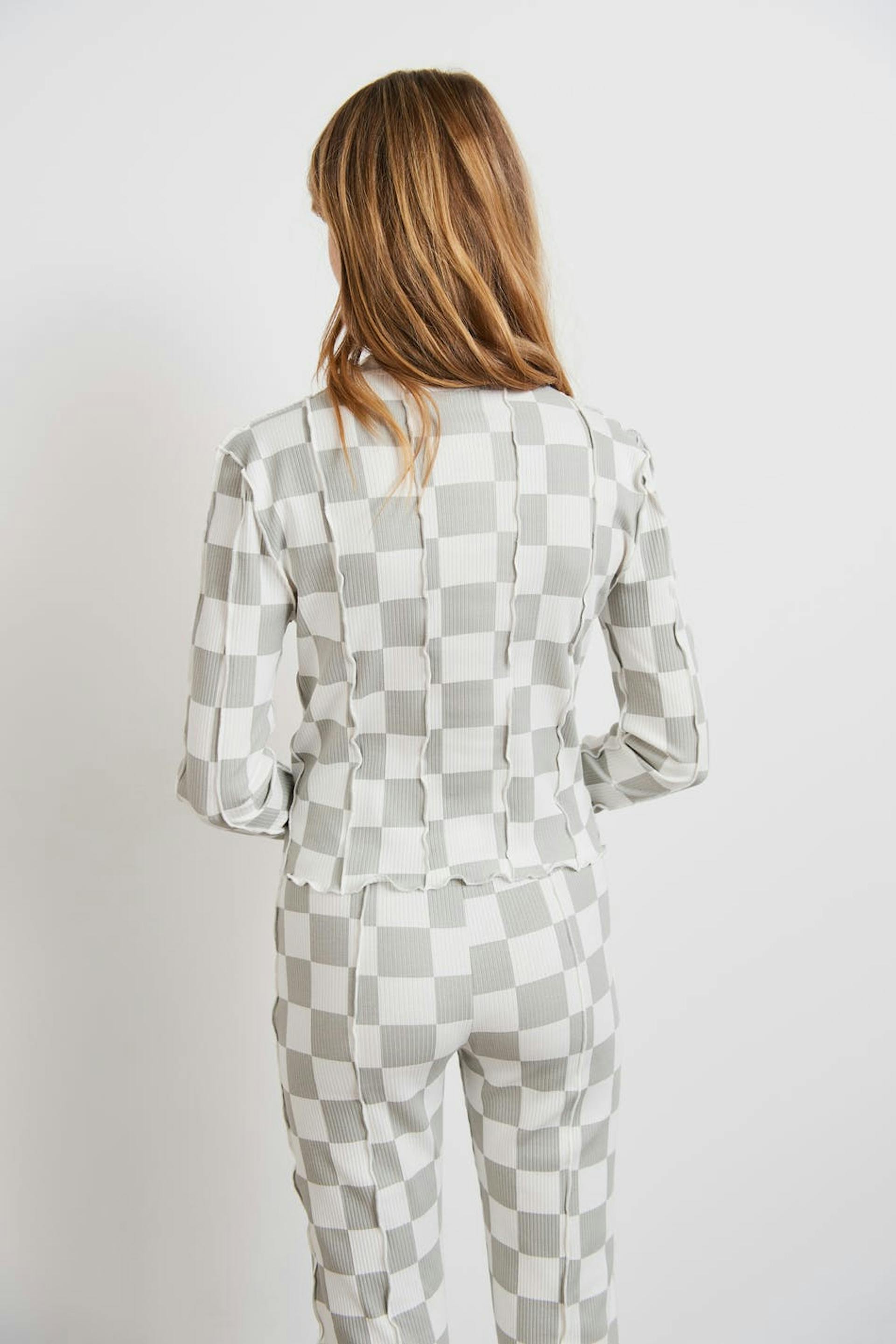 Checked top by our Young assortment with ruffle details. The top is grey, ribbed and long-sleeved. It has a high neckline, a fitted fit and a soft material in cotton.