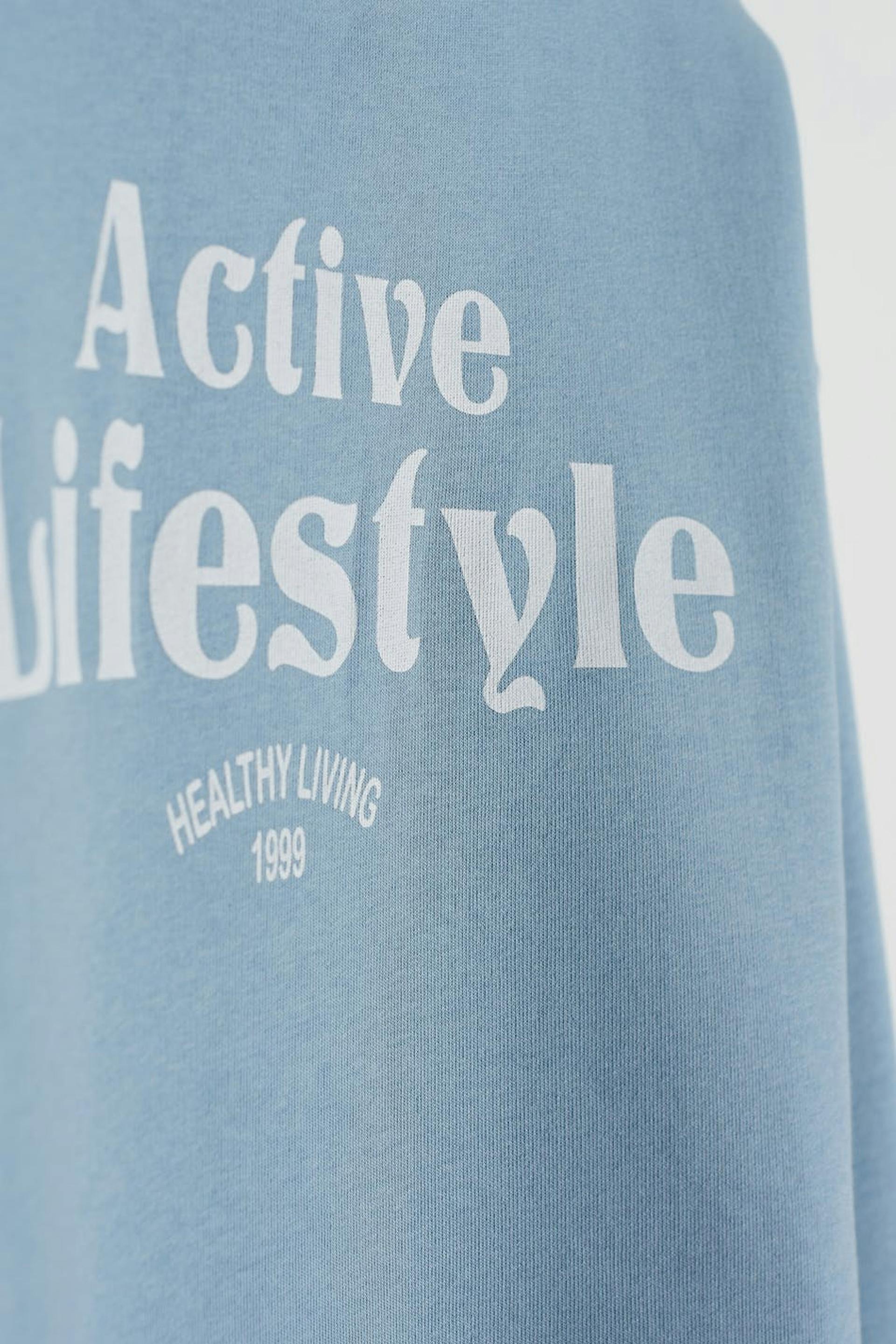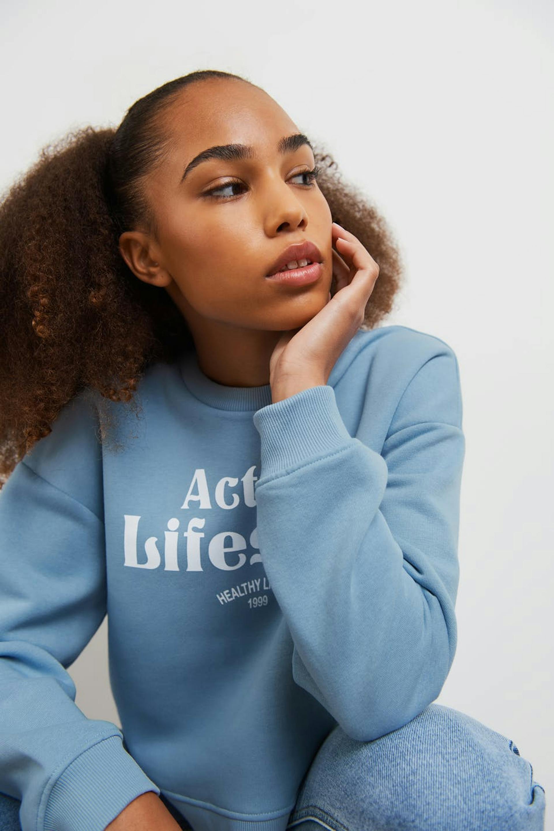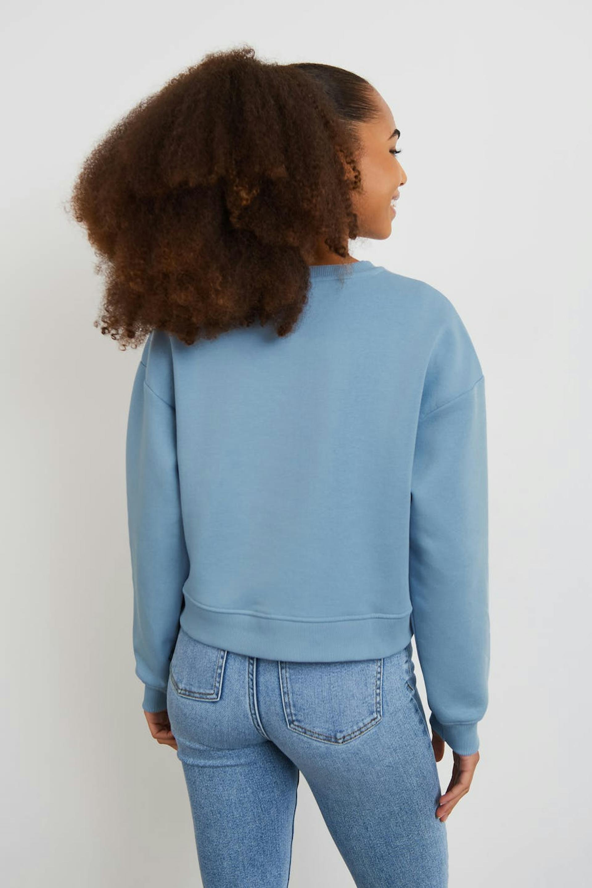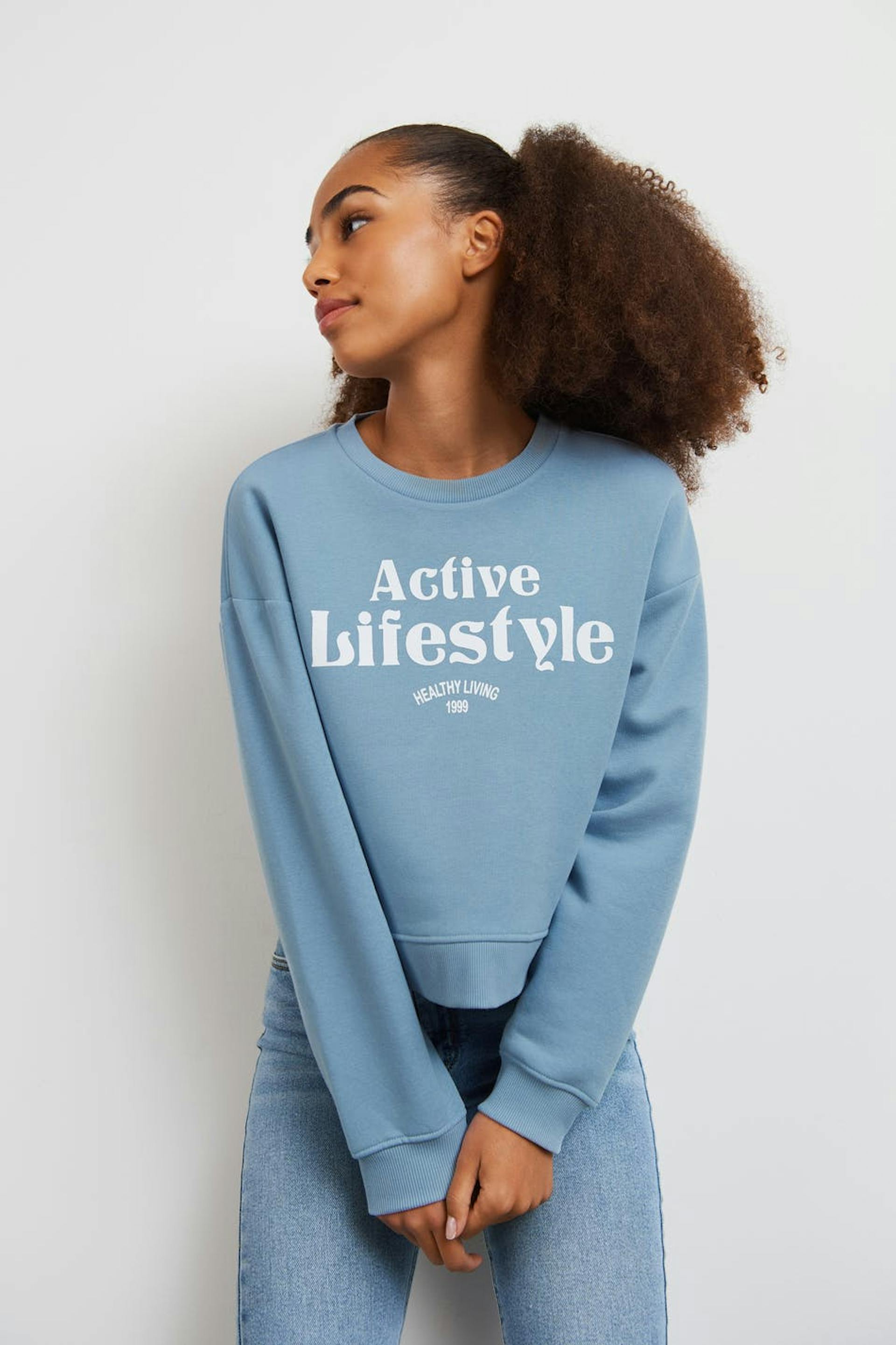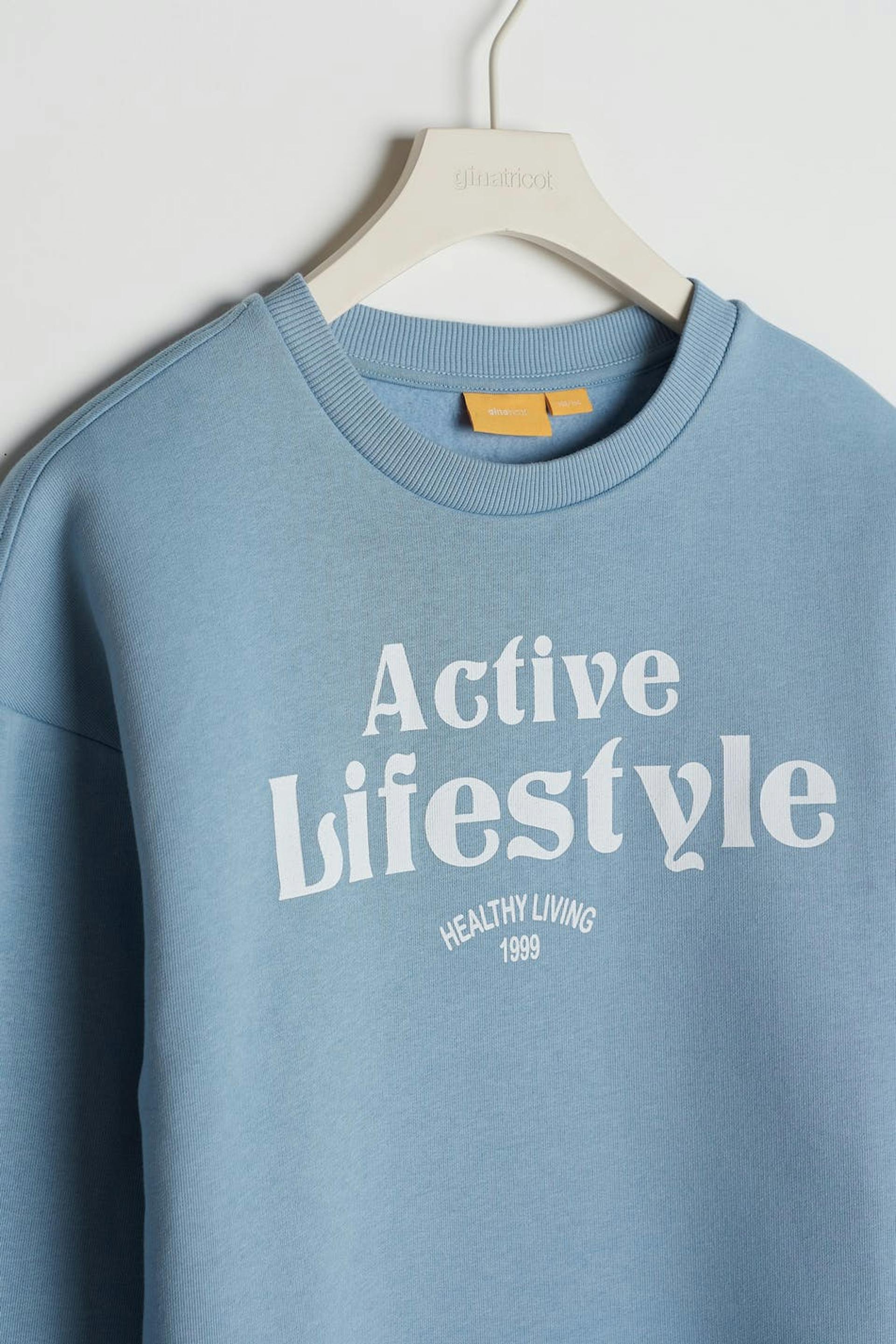 Long-sleeved sweatshirt by our Young assortment with an oversize fit. The sweatshirt is blue and has a sporty print at the front. It has a rounded neckline, dropped shoulders and a ribbed cuff on the sleeve ends and at the bottom hem.
