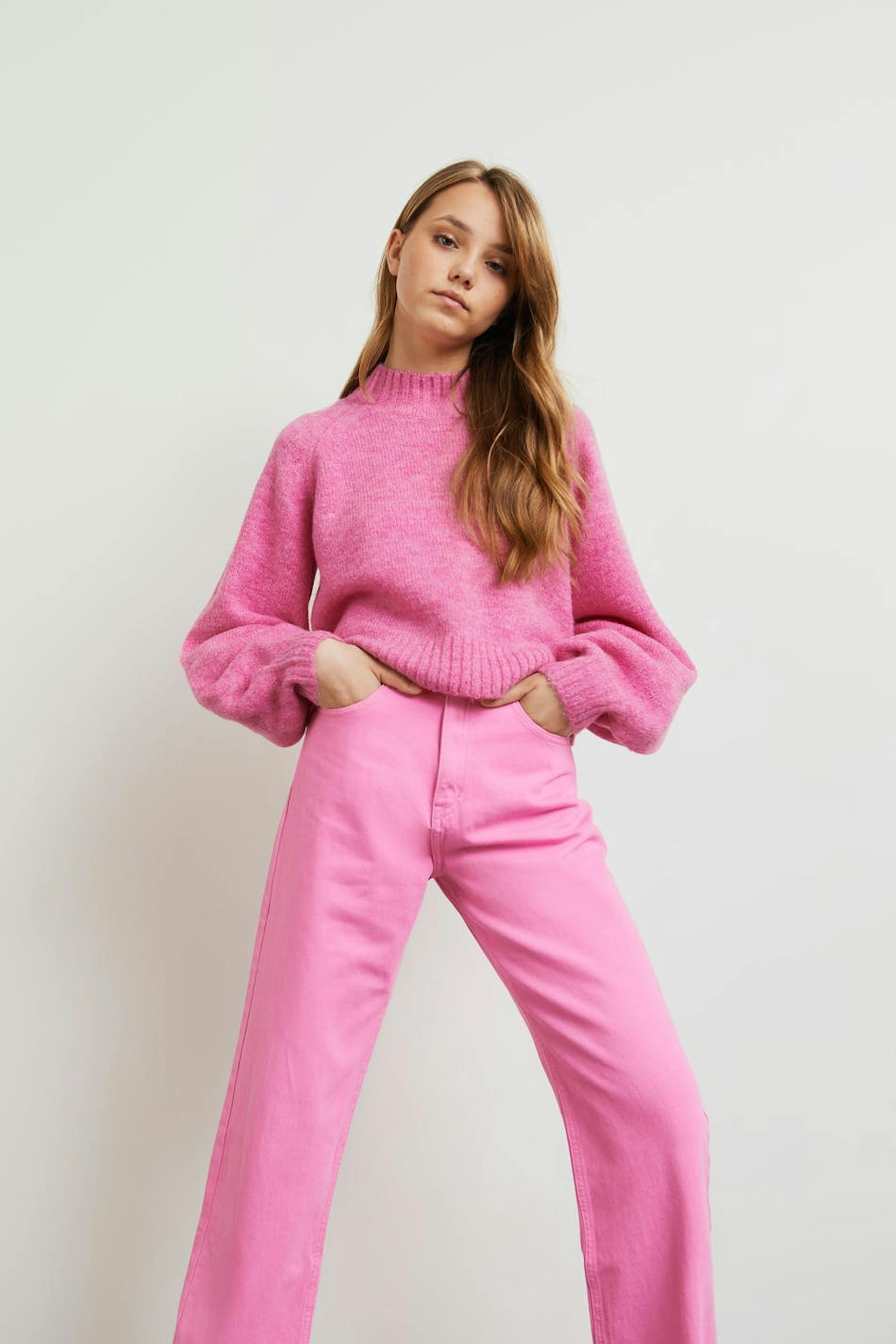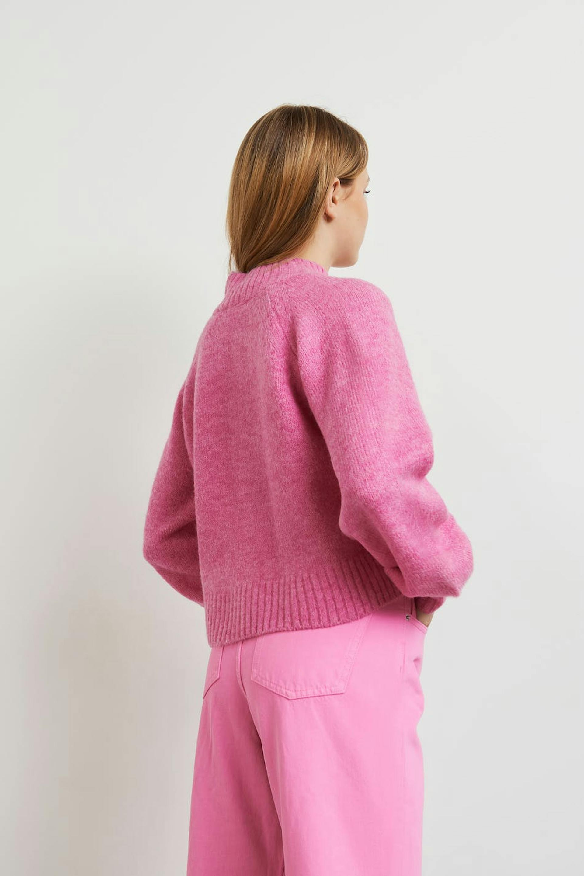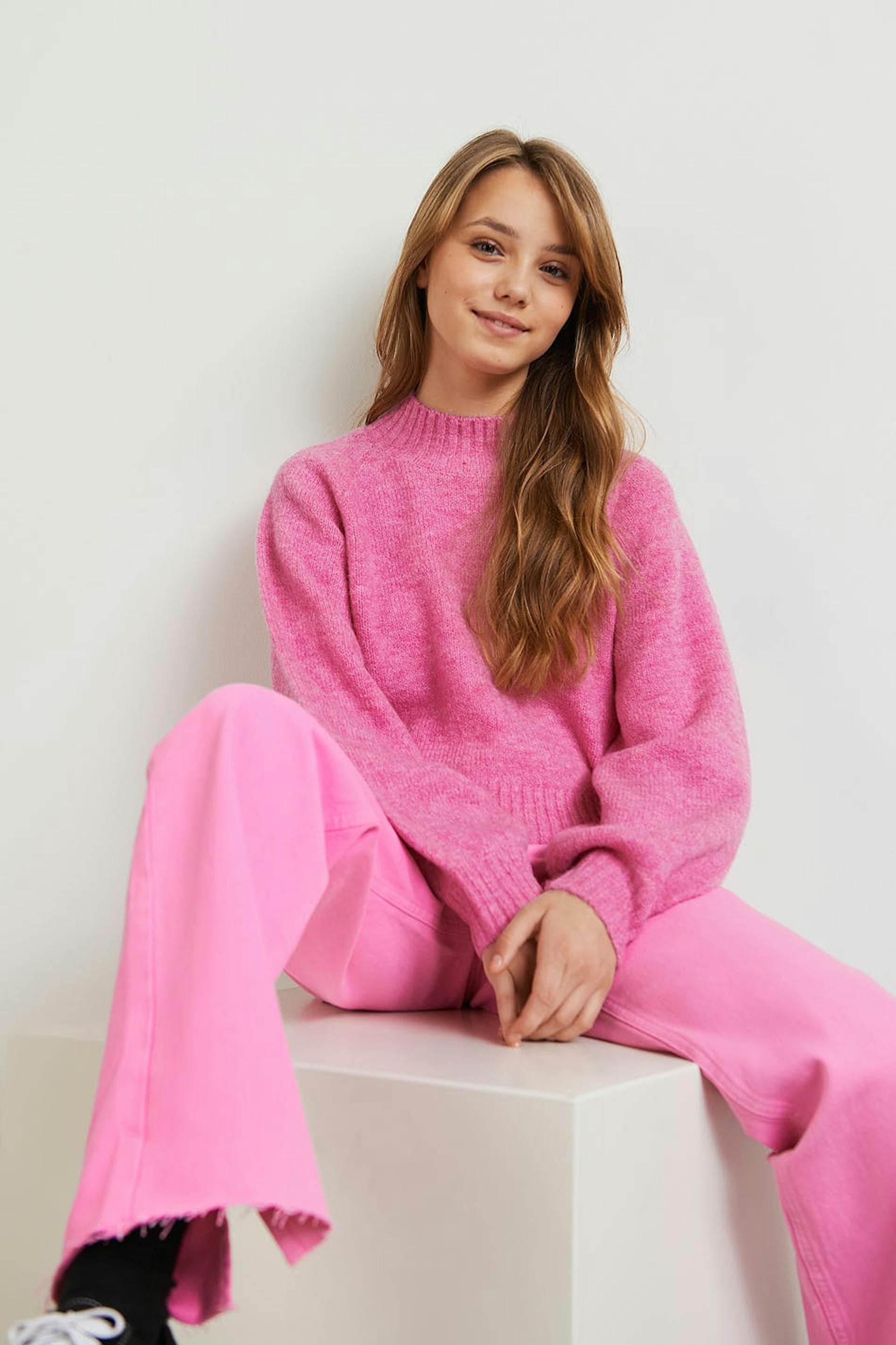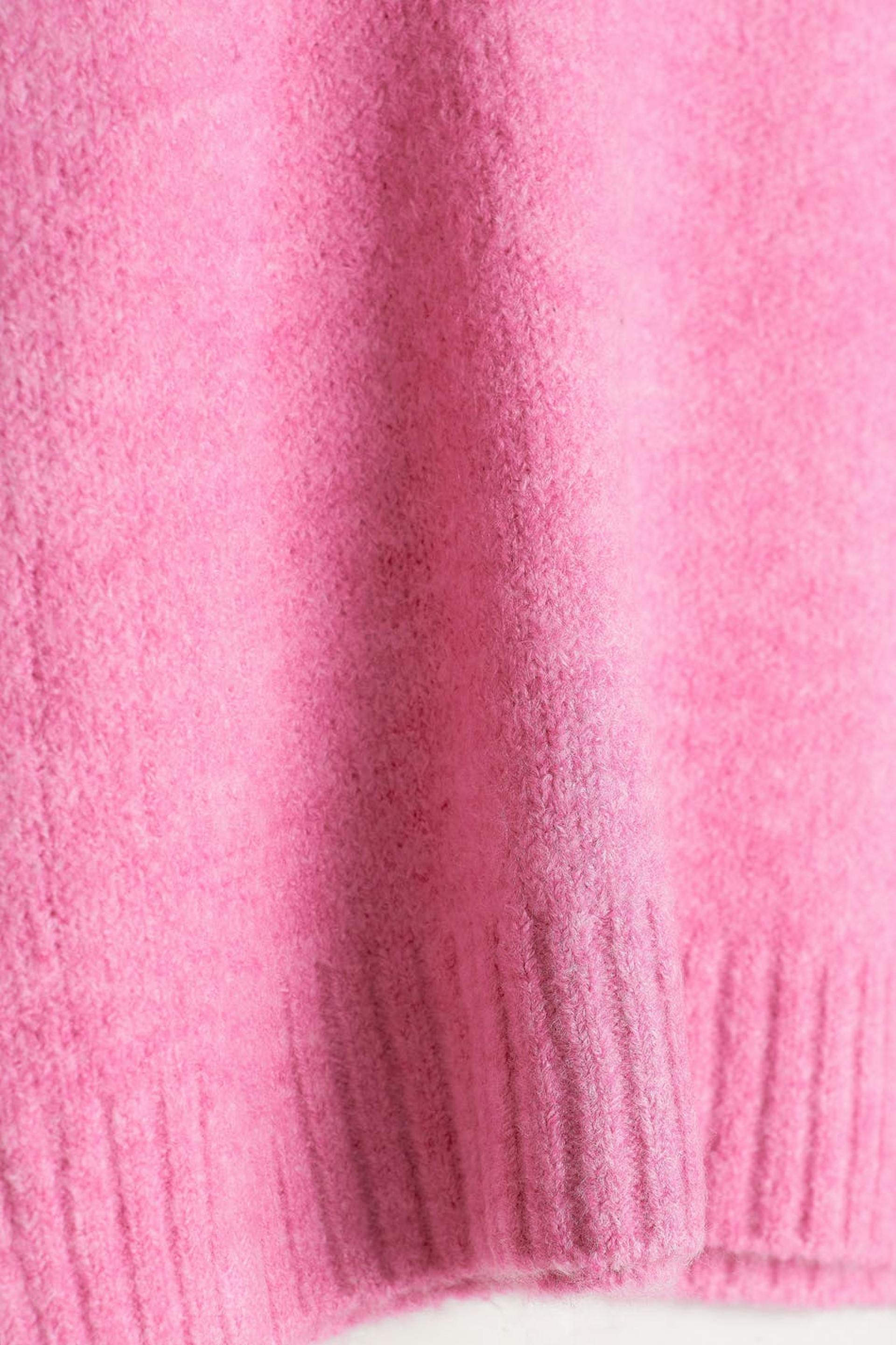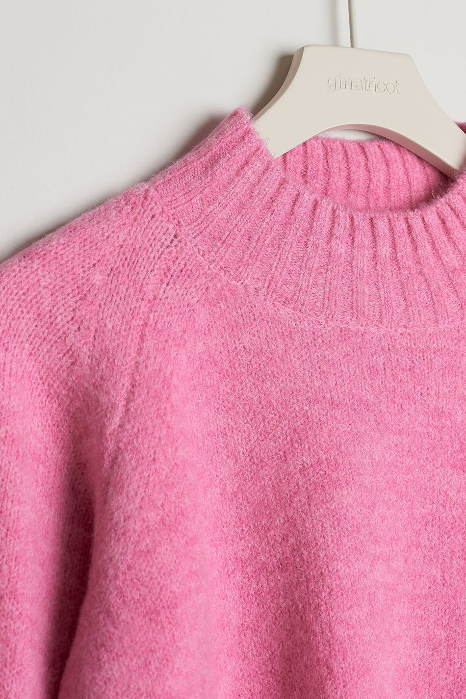 Knitted jumper by our Young assortment with a boxy fit. The jumper is pink and long-sleeved and has a high neckline.