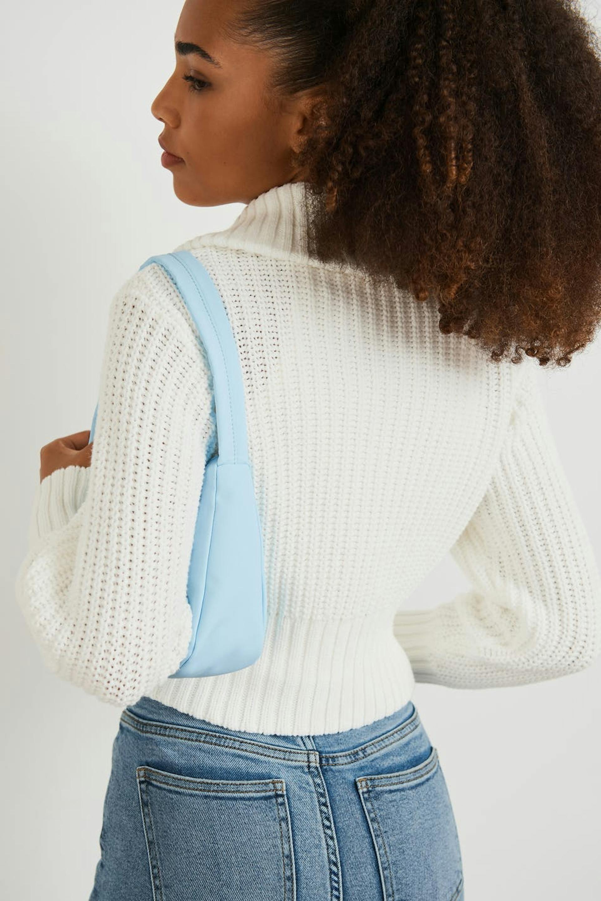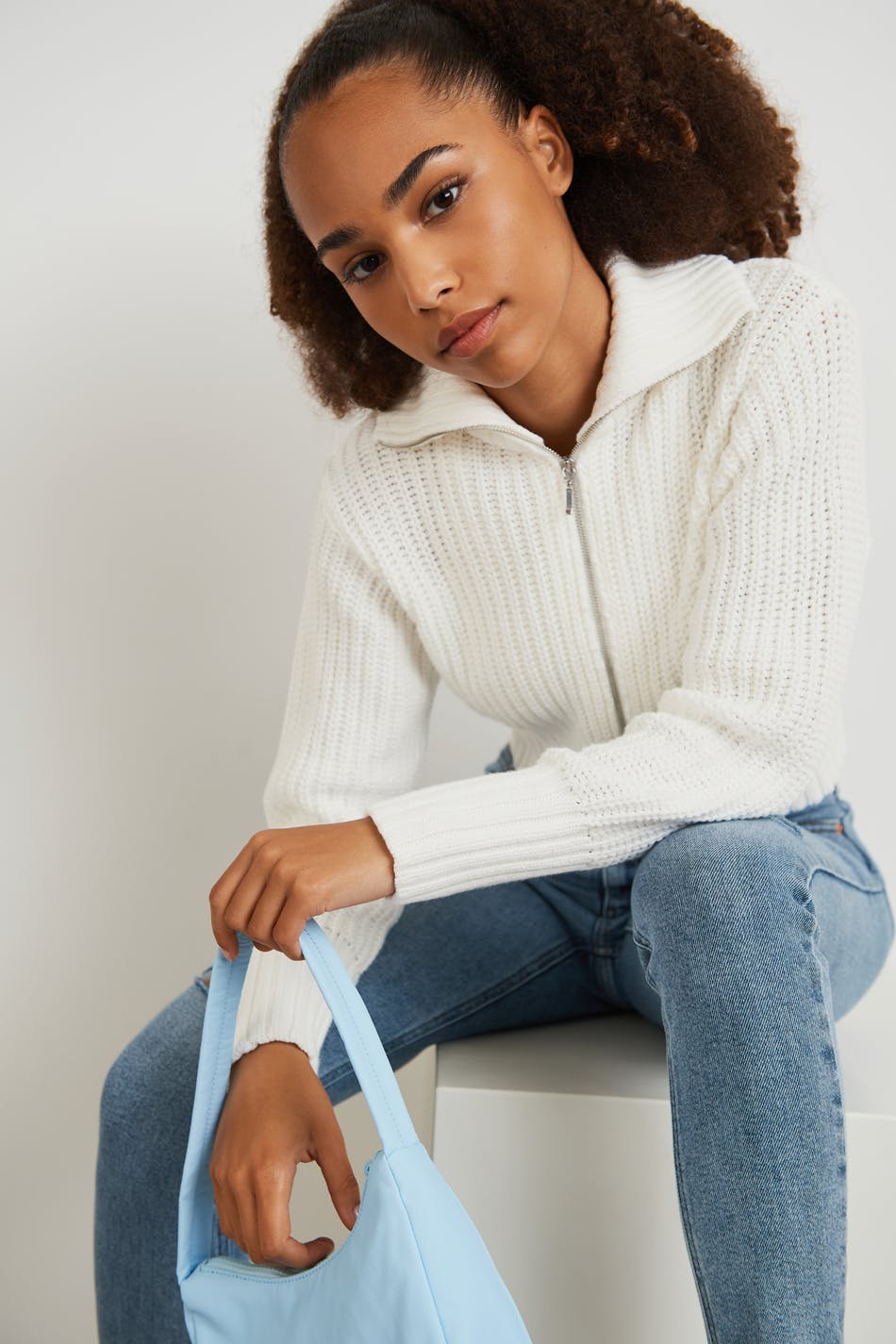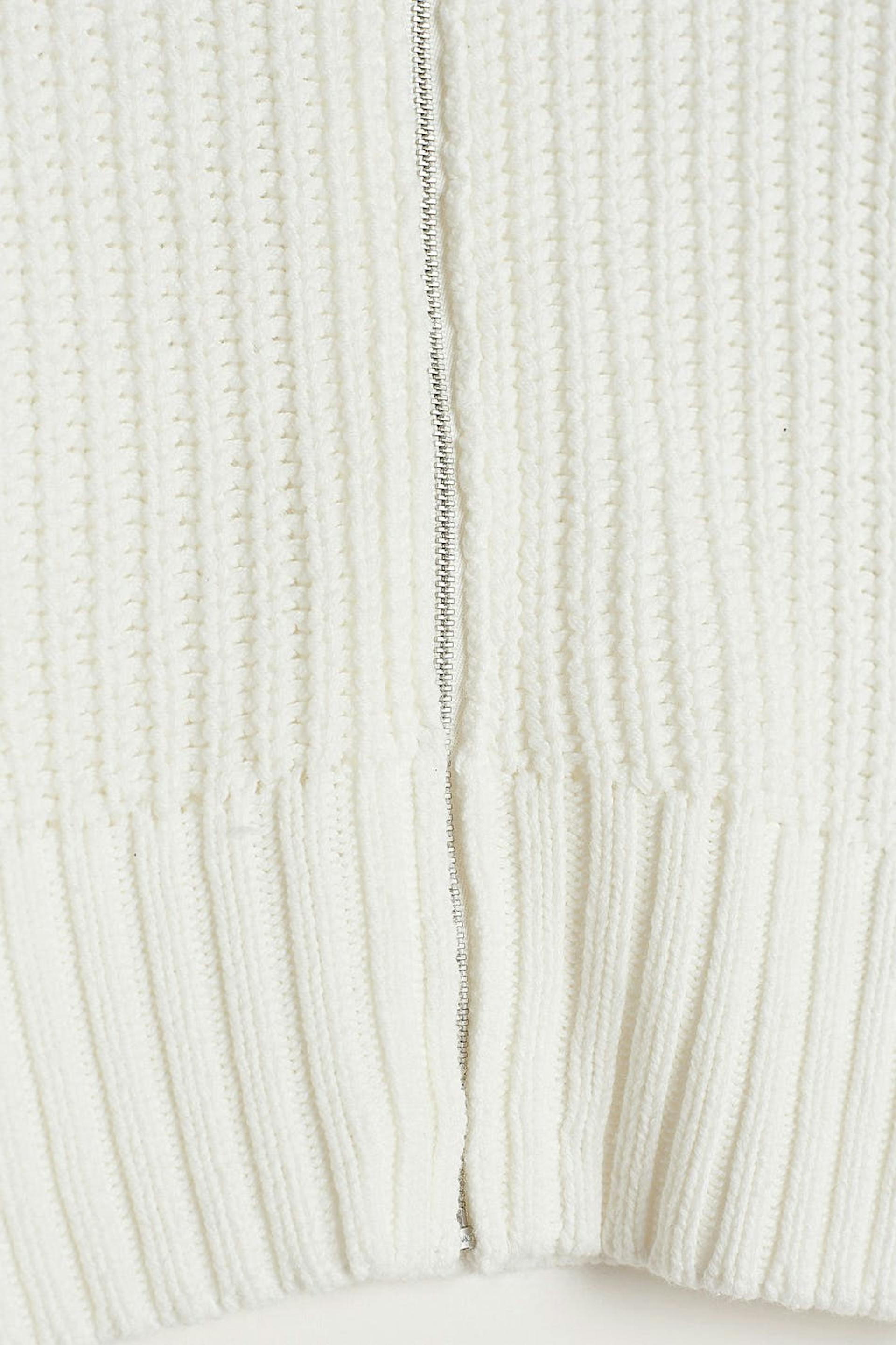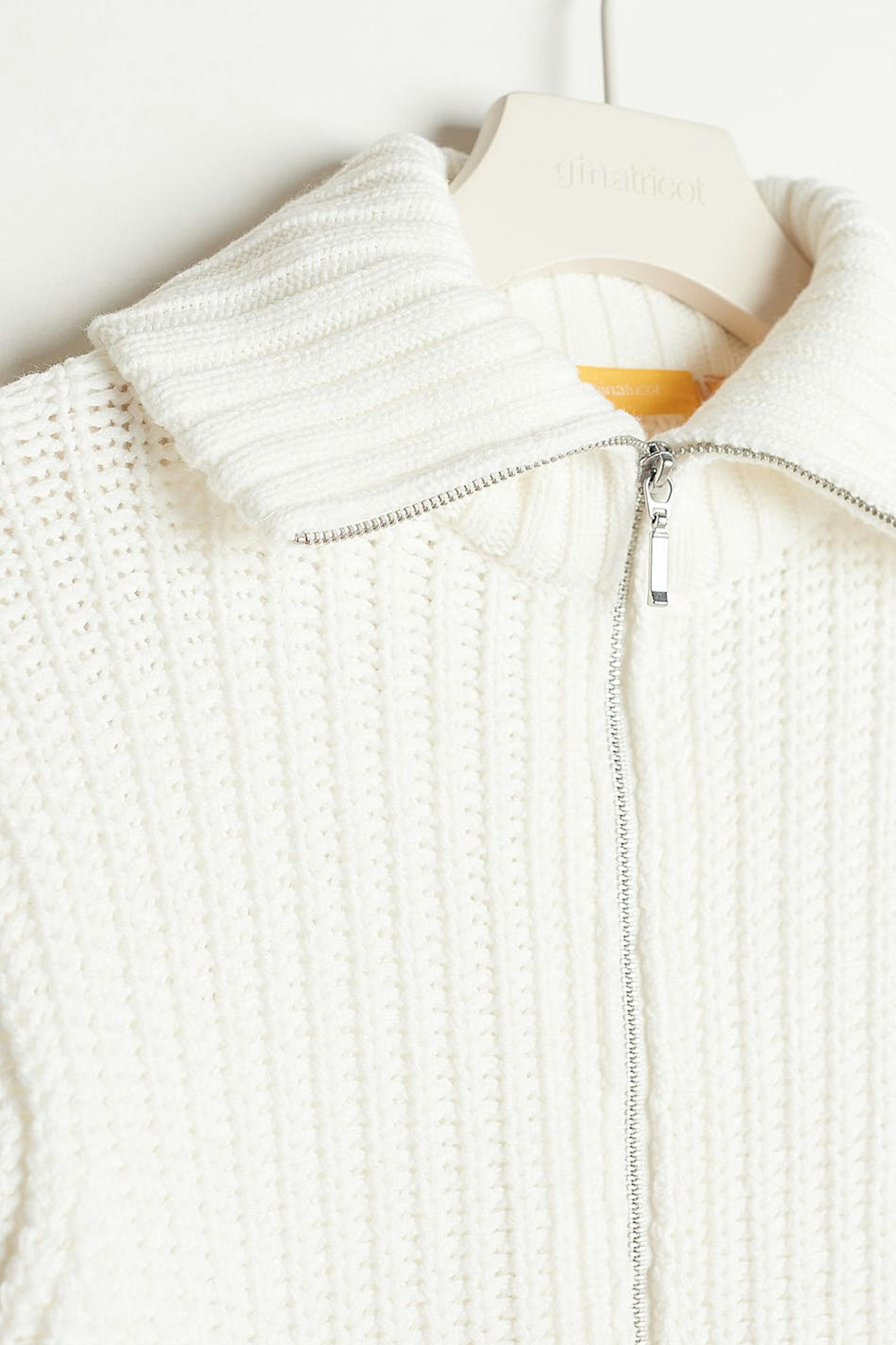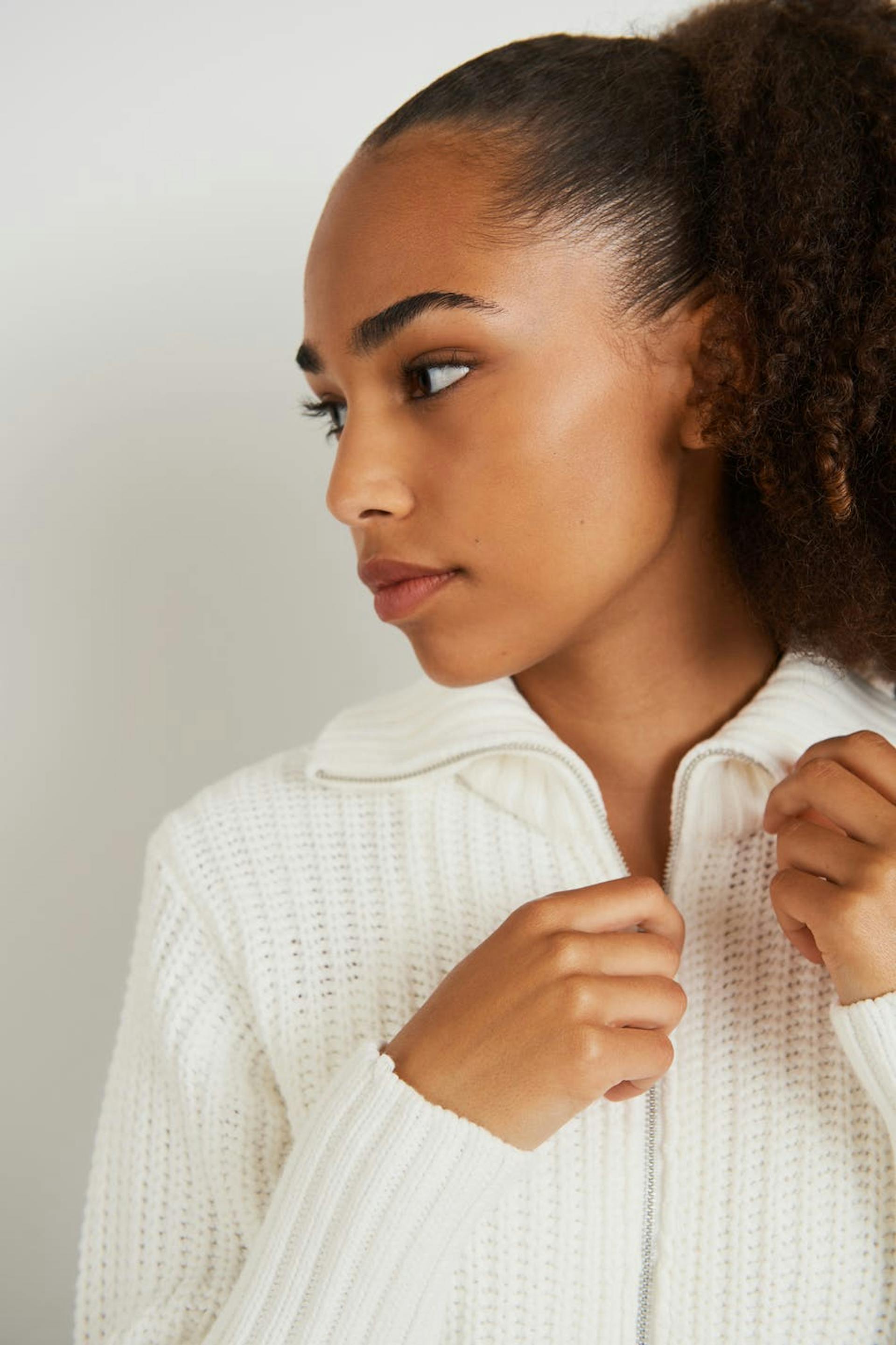 Knitted jumper by our Young assortment with a regular fit. The jumper is white and long-sleeved and has a high neck. It has a zip at the front and a cropped length.
