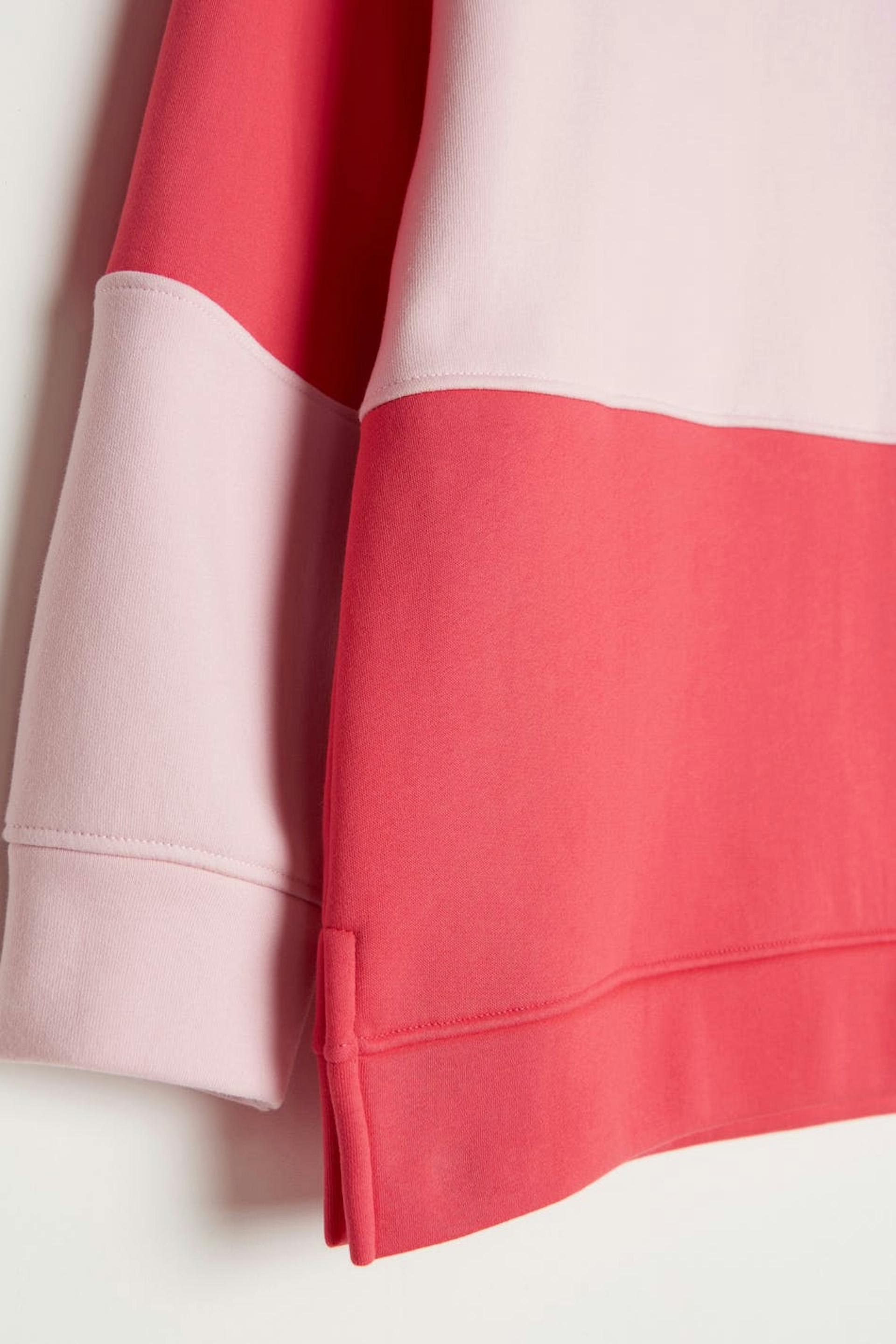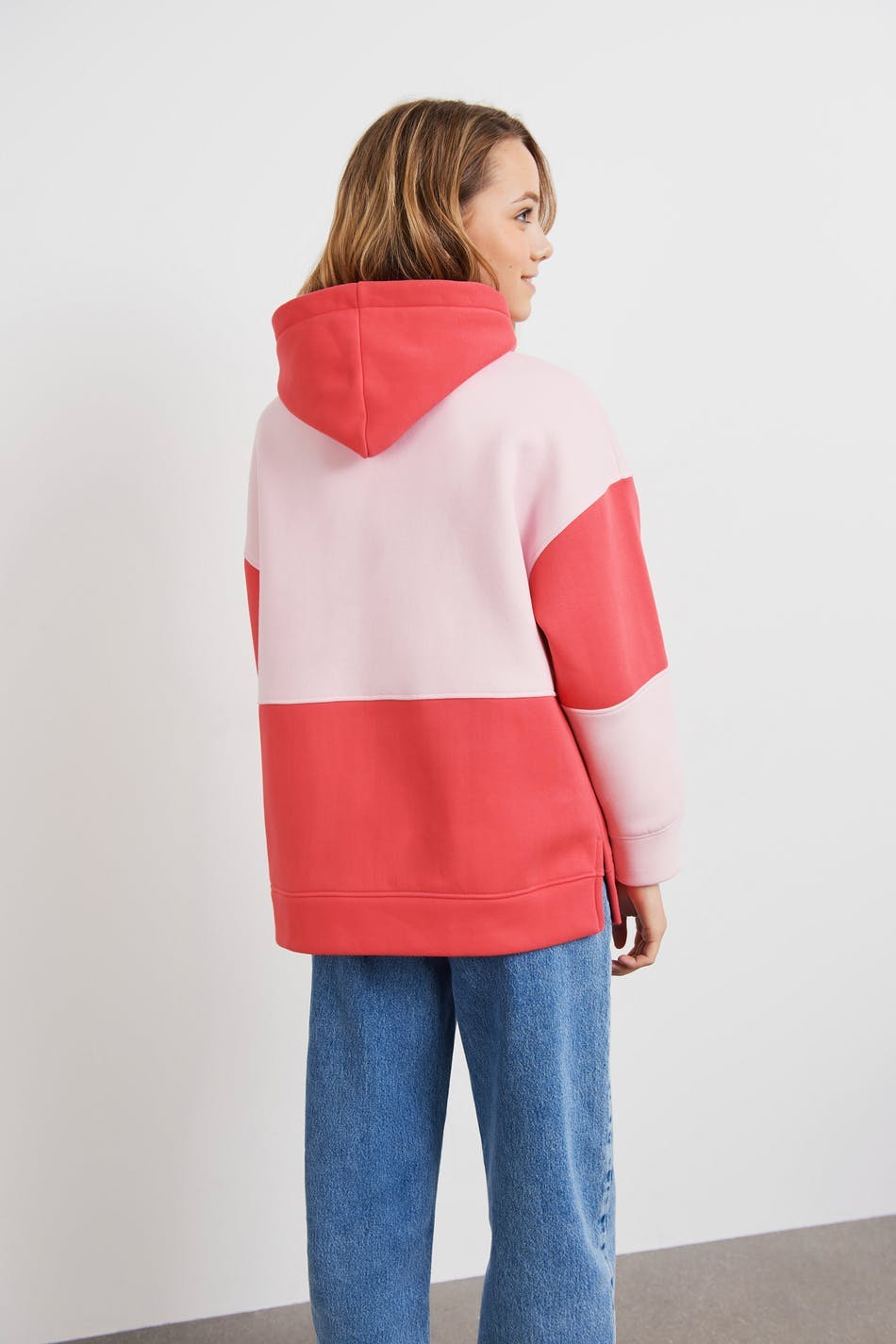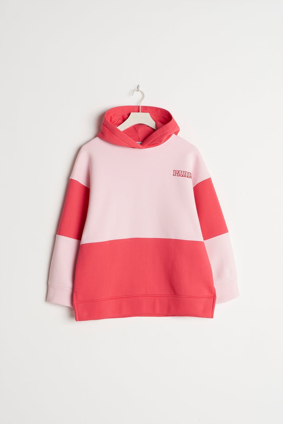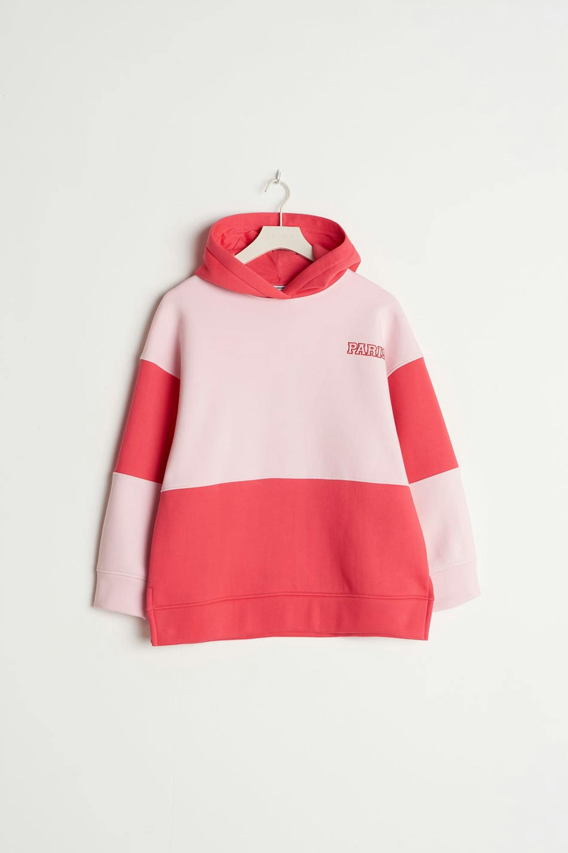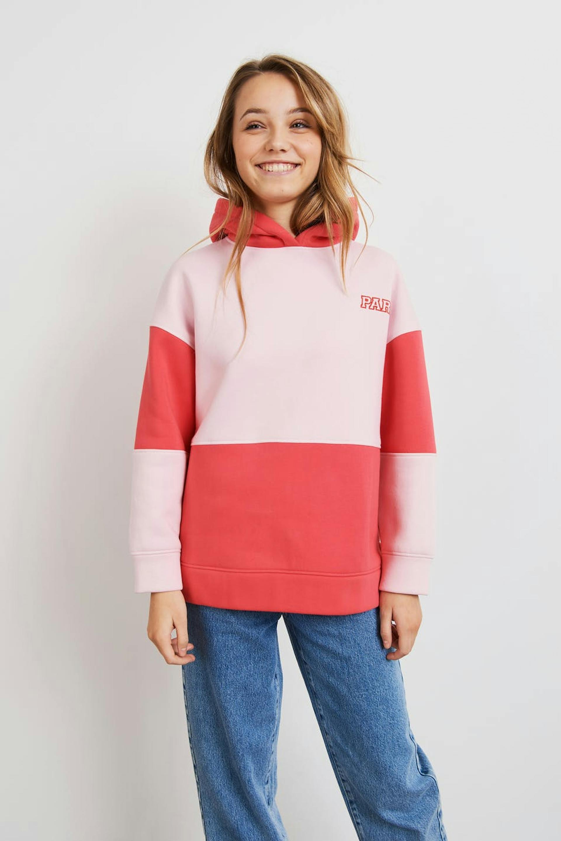 Oversized hoodie by our Young assortment with hood. The hoodie is pink, red and long-sleeved. It has an embroidered text at the front and slit on the sides.