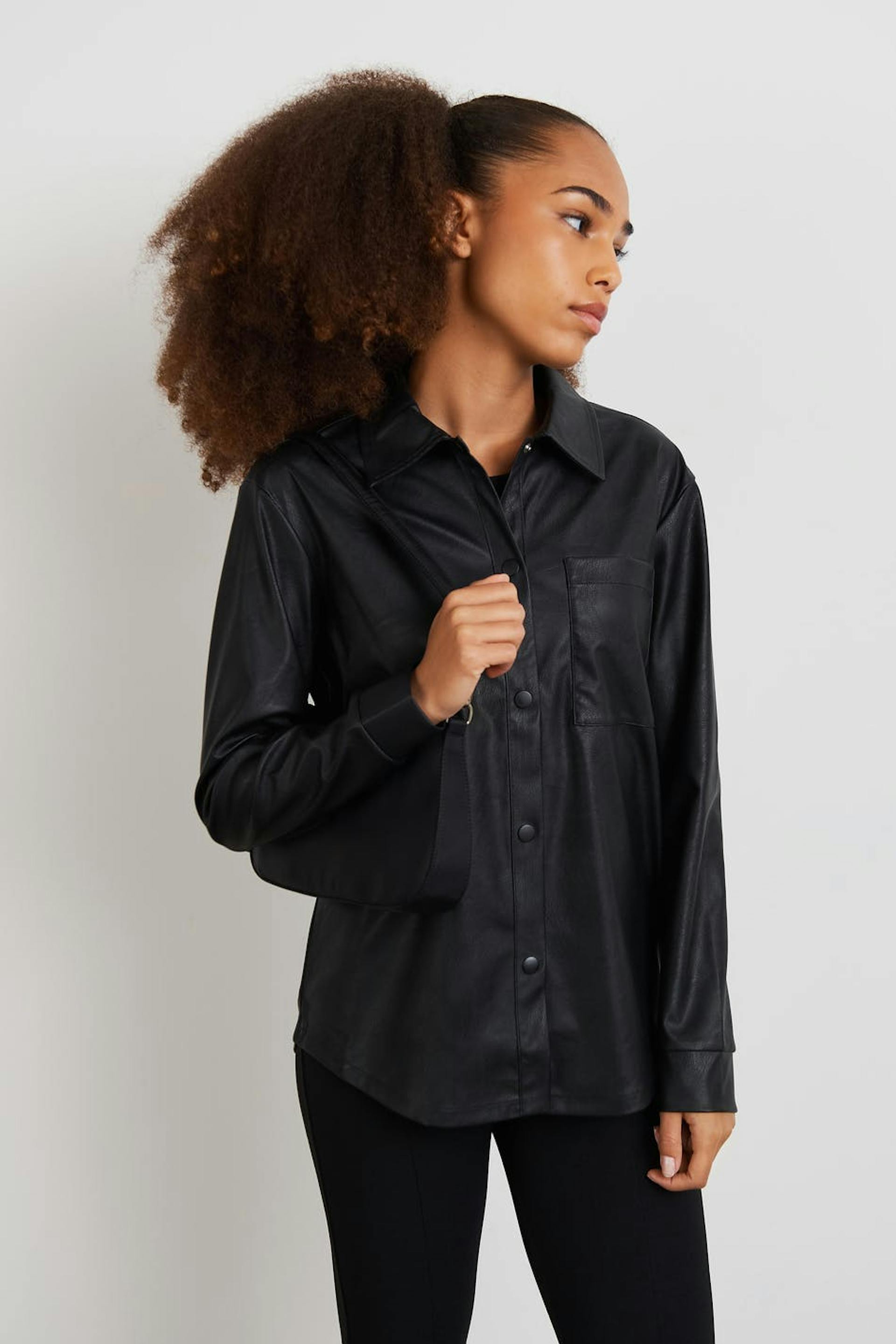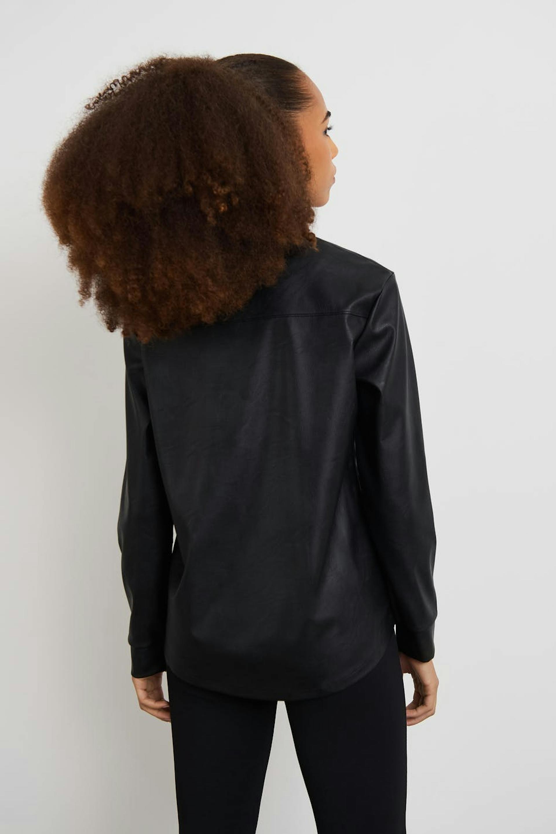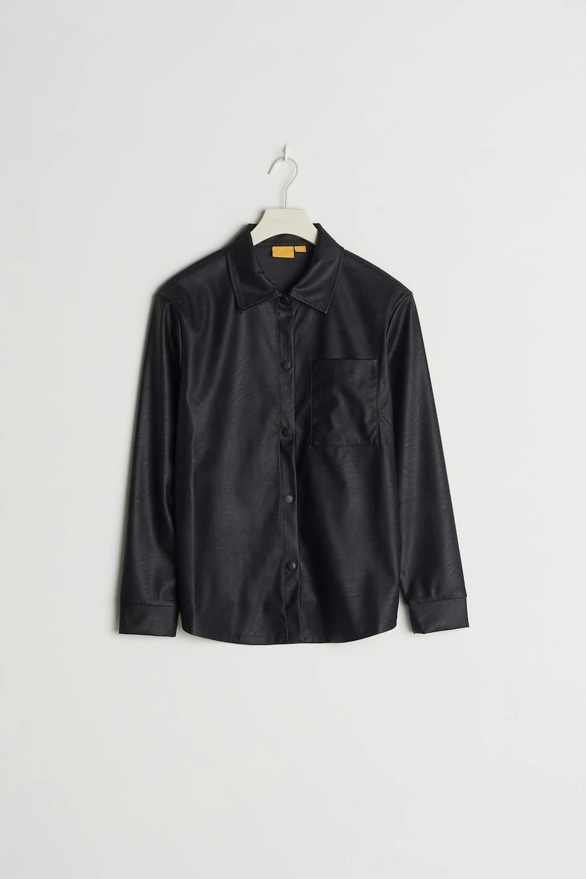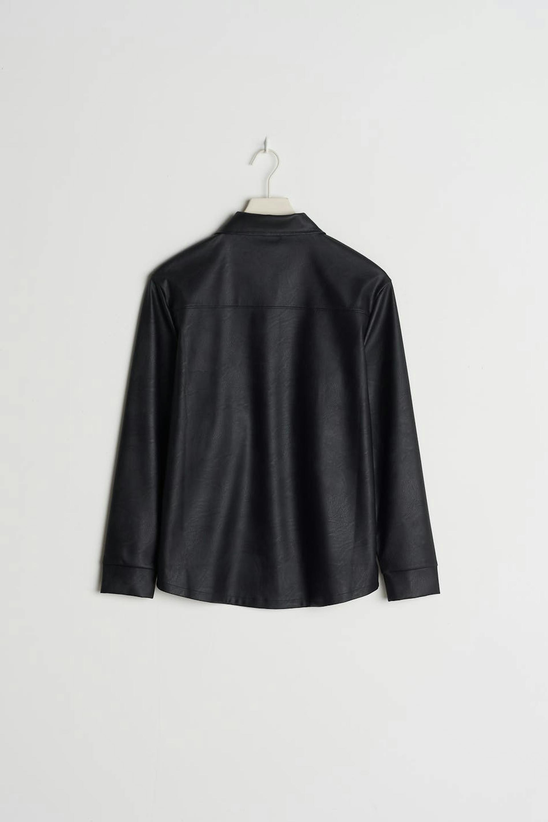 Shirt by our Young assortment with a regular fit. The shirt is black and has a faux-leather material. It has a chest pocket and button placket with snap buttons at the front.