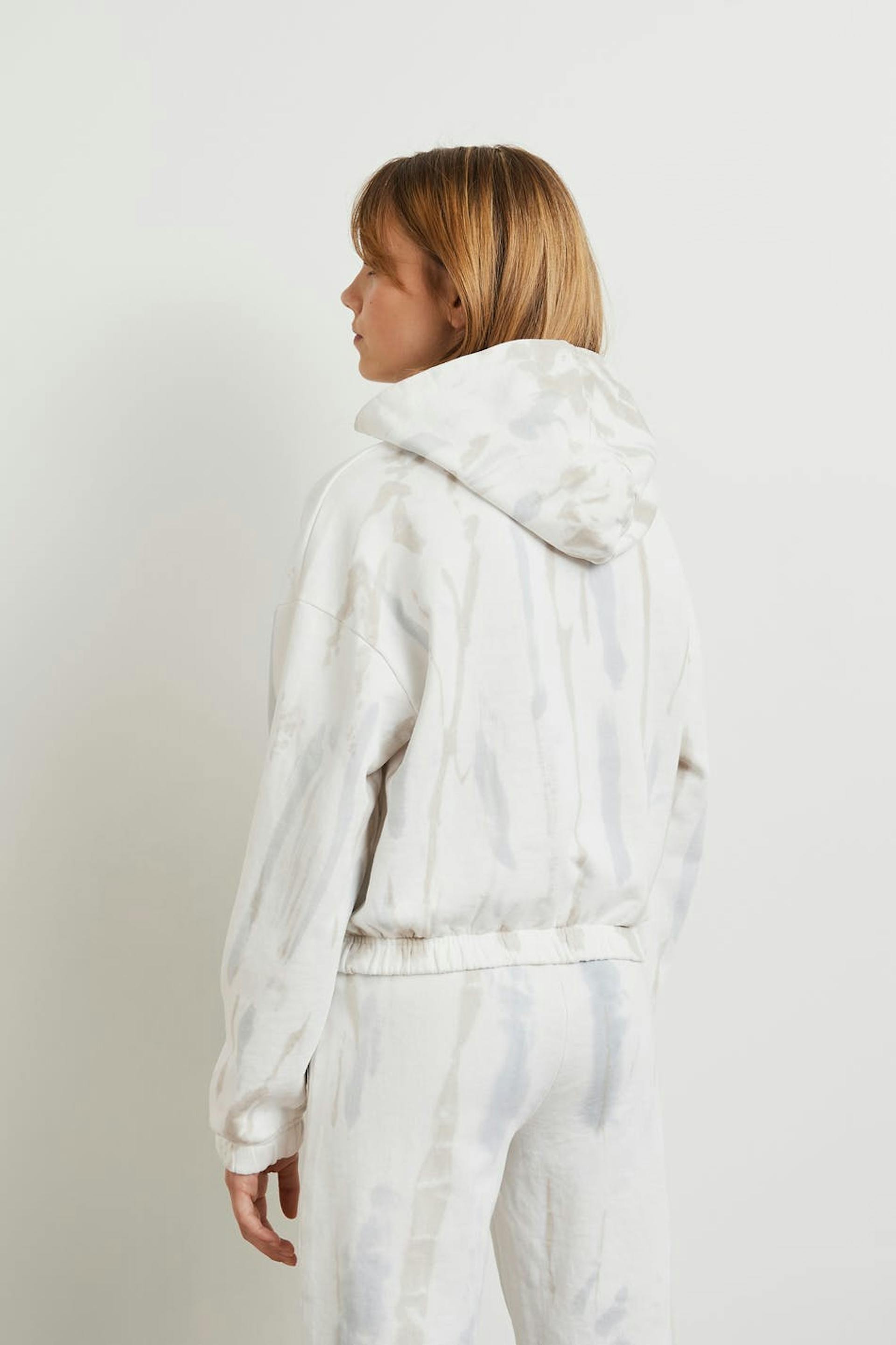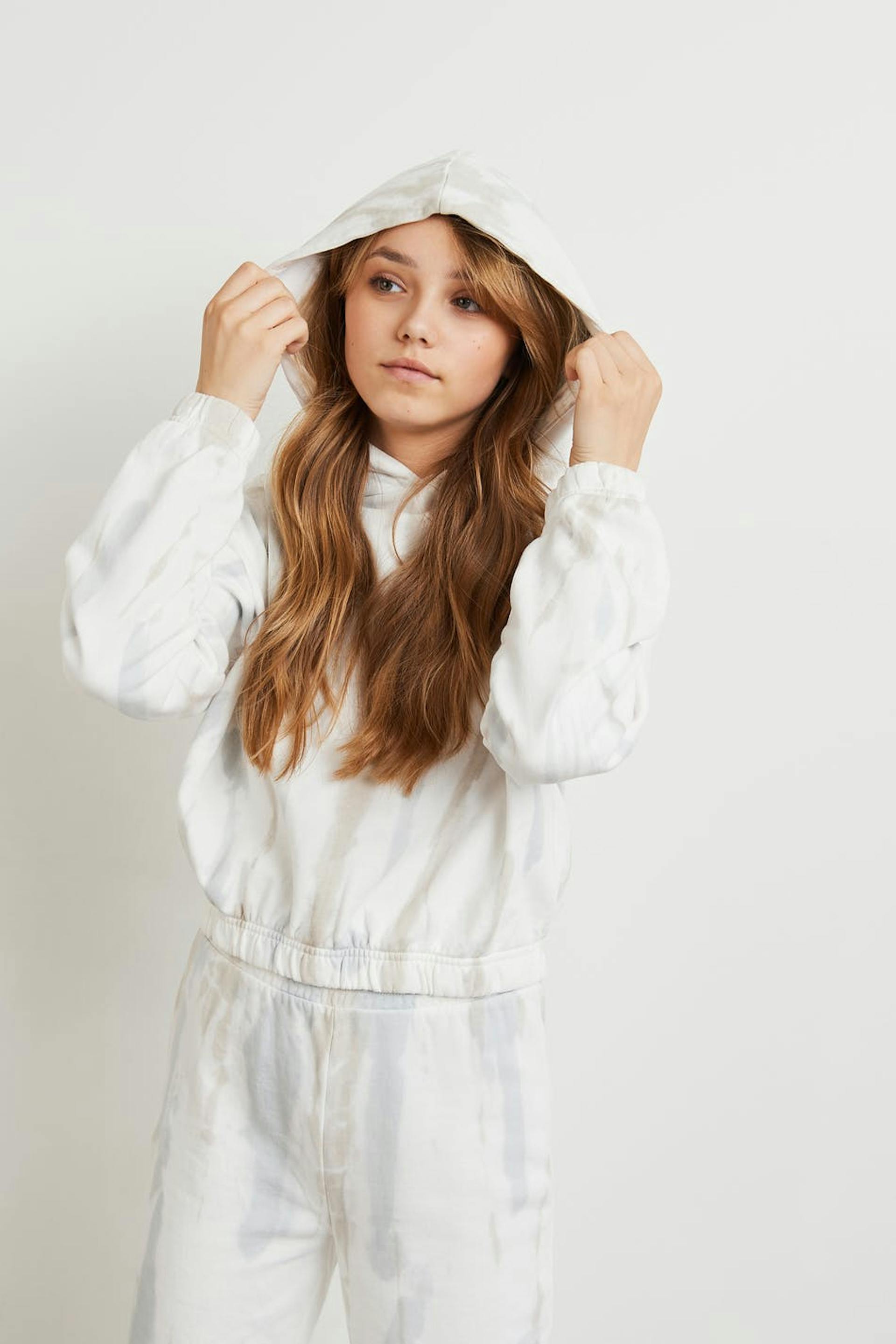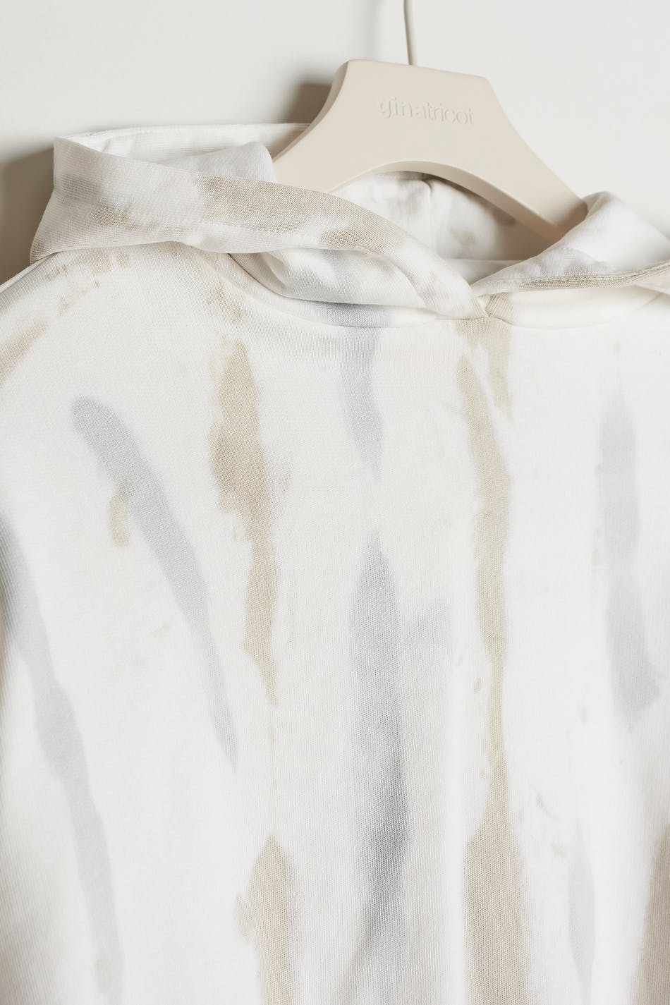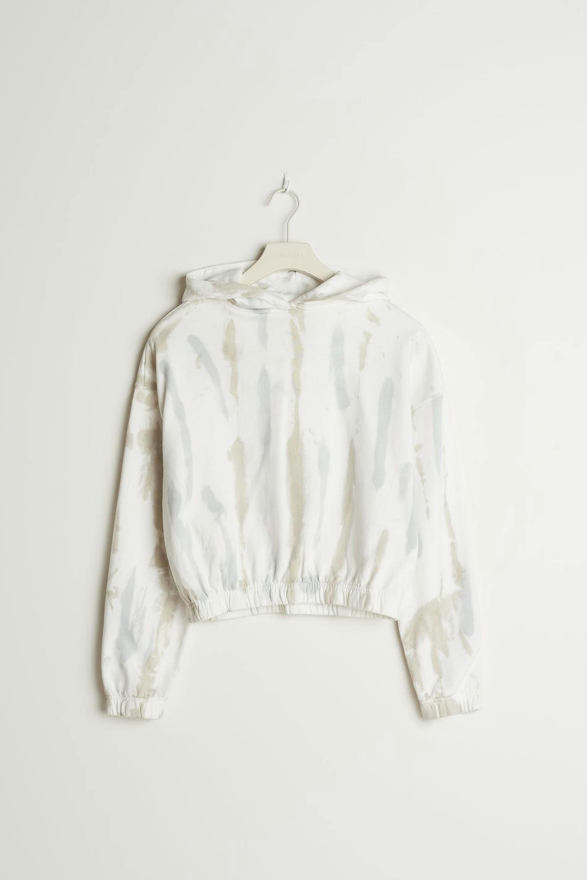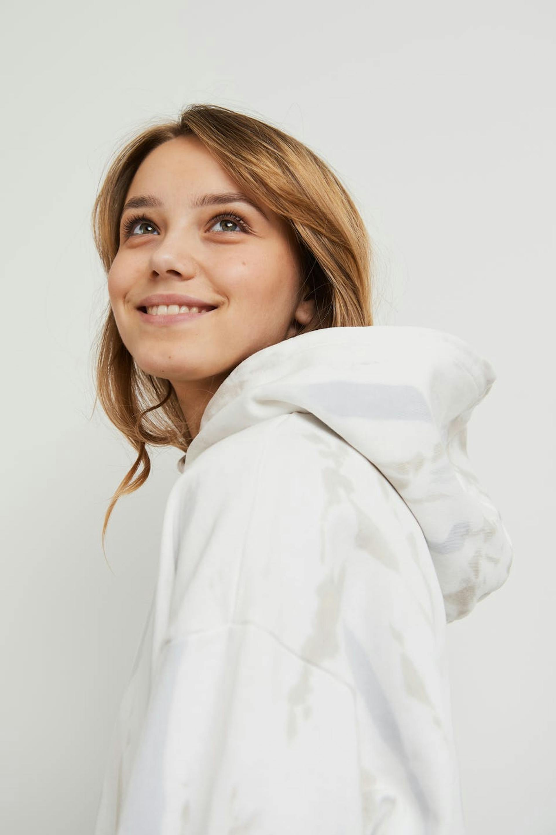 Hoodie by our Young assortment with a normal fit. The hoodie is multi coloured and has an elastic on the sleeve ends and at hem. It has a cropped length, dropped shoulders and a hood at the back. The hoodie is dyed with tie-dye technology, making each garment unique. This allows the colour and pattern to vary from garment to garment.