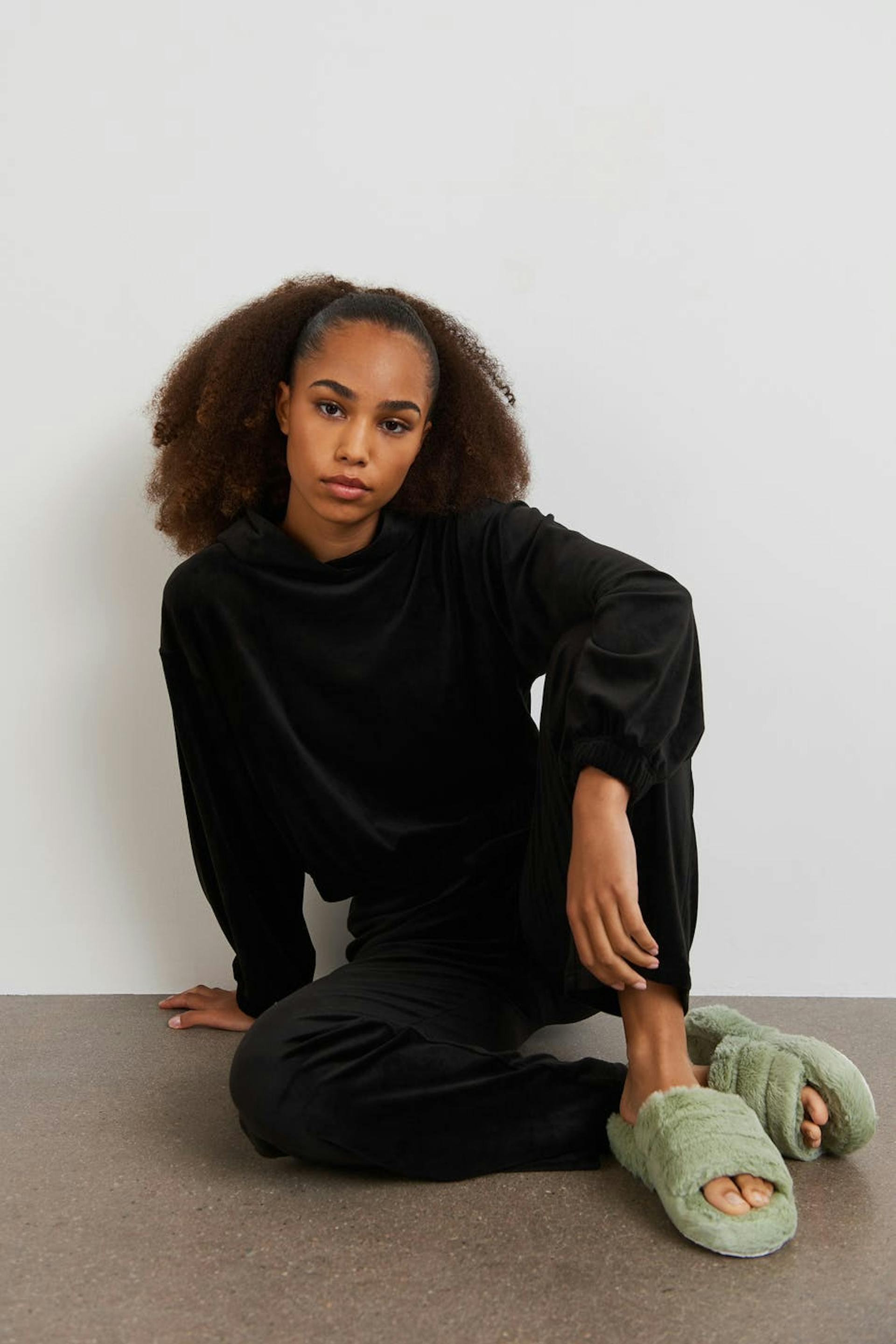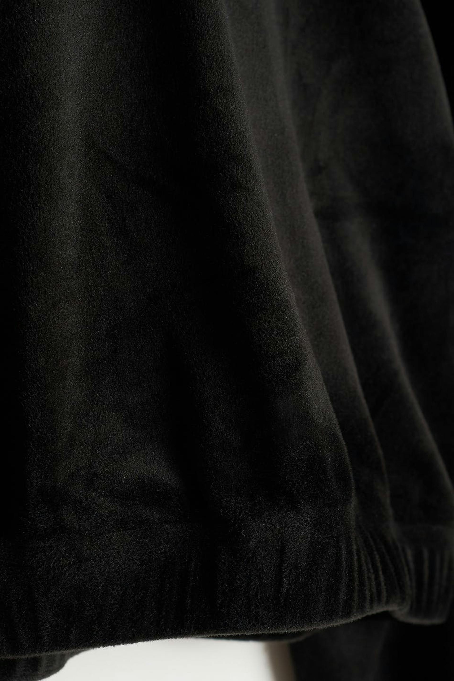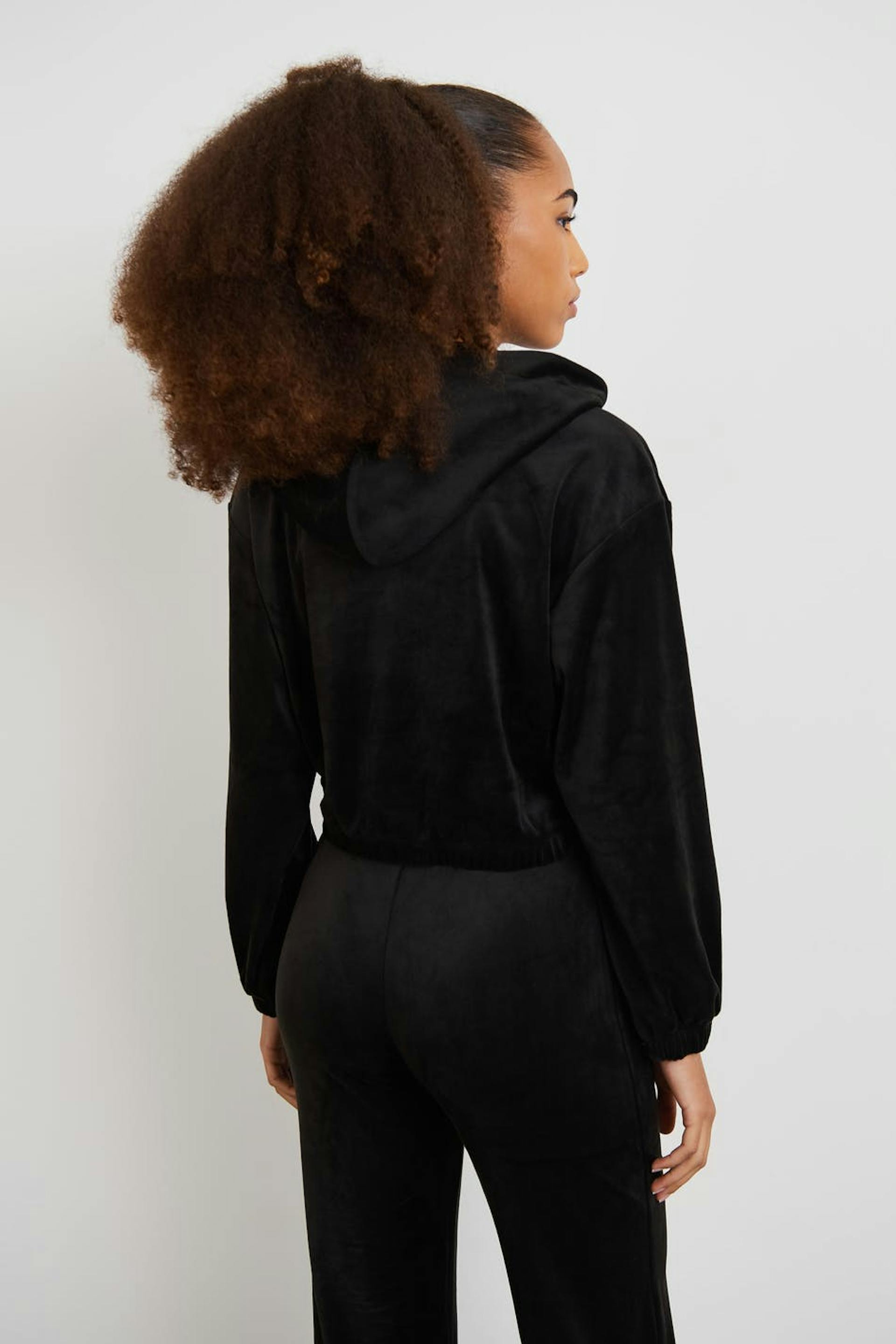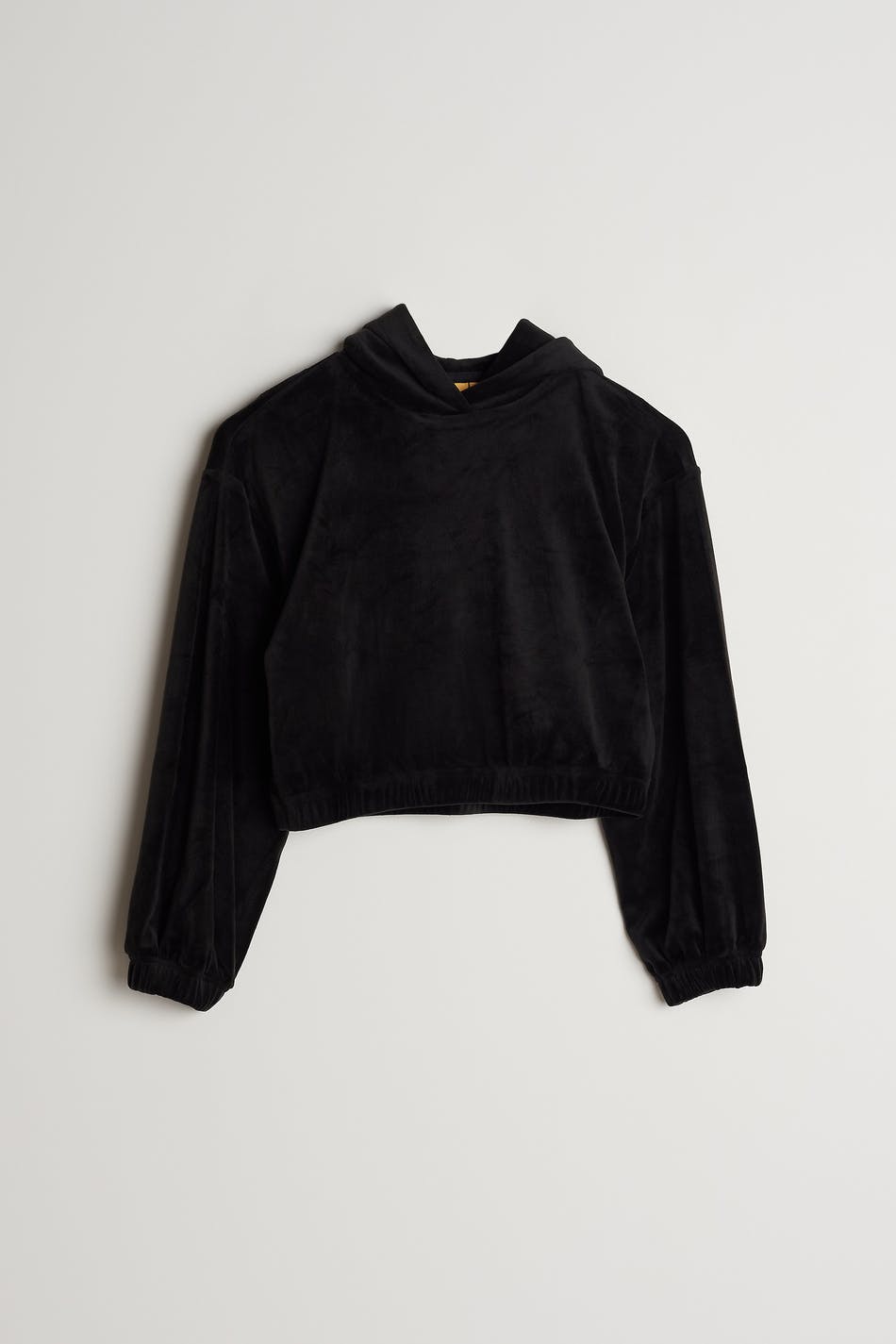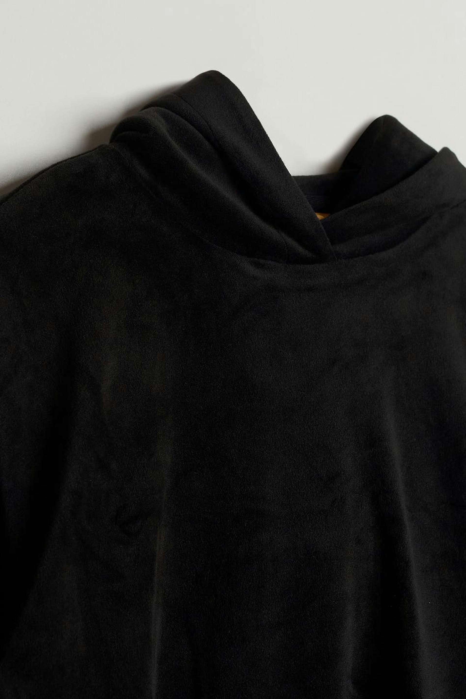 Long-sleeved jumper by our Young assortment with an oversize fit. The jumper is black and has a soft, velour material. It has a cropped length, a hood at the back and elastic band at the waist and on the sleeve ends.