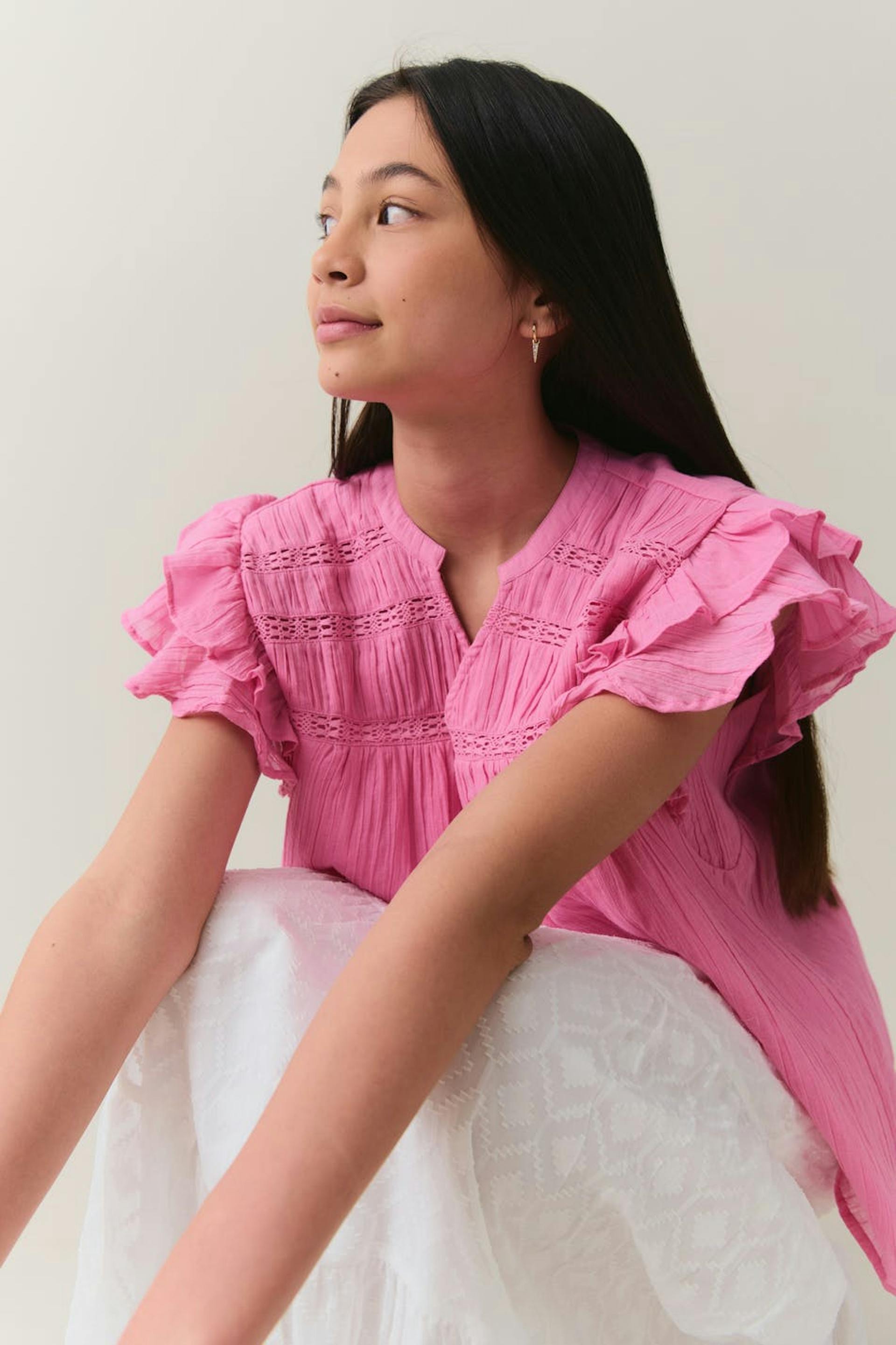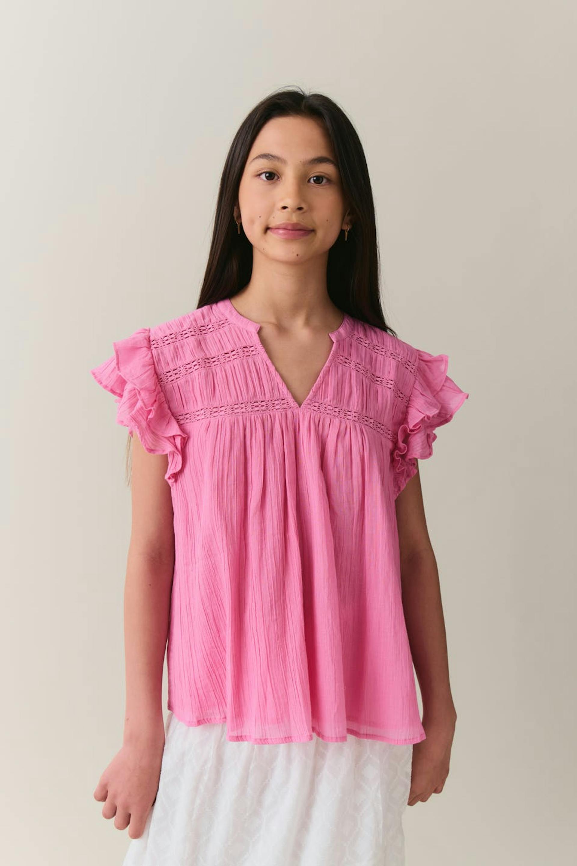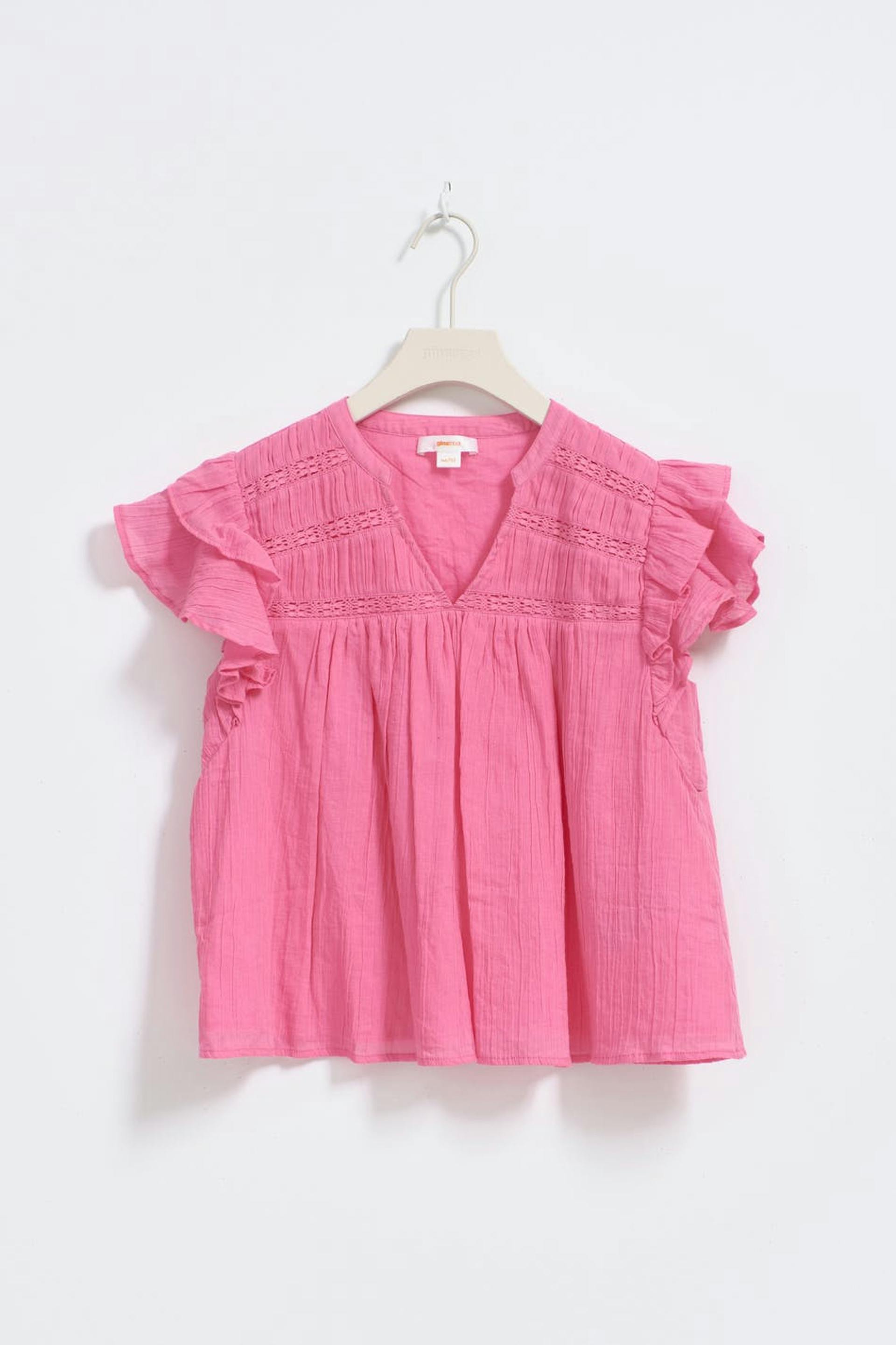 Sleeveless blouse with flounces around the shoulders. The blouse is pink, bohemian and lined. It has loose-fitting style, sheer cotton quality, crocheted details at the top, v-neck, small collar and gathered seam at the top.